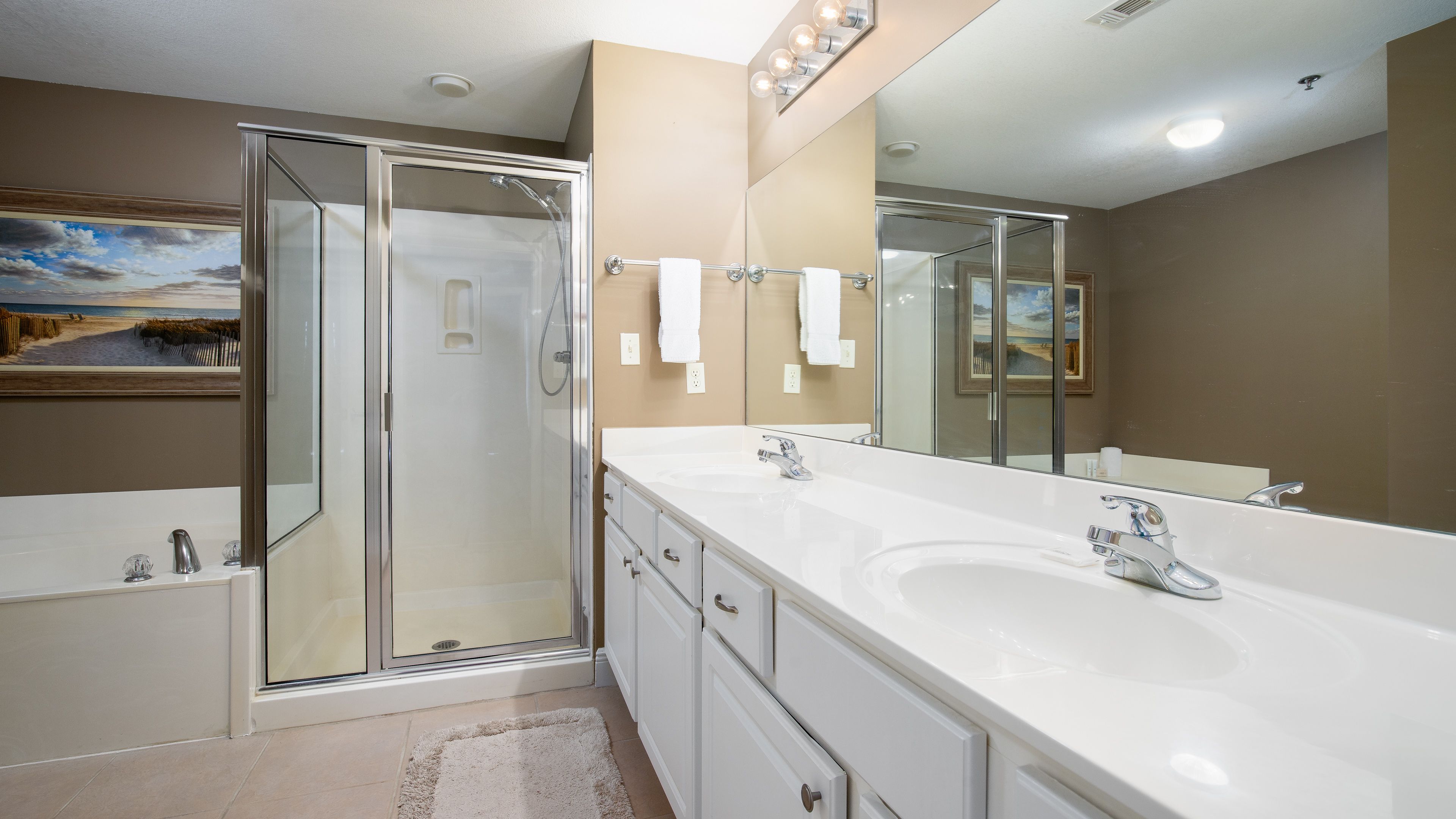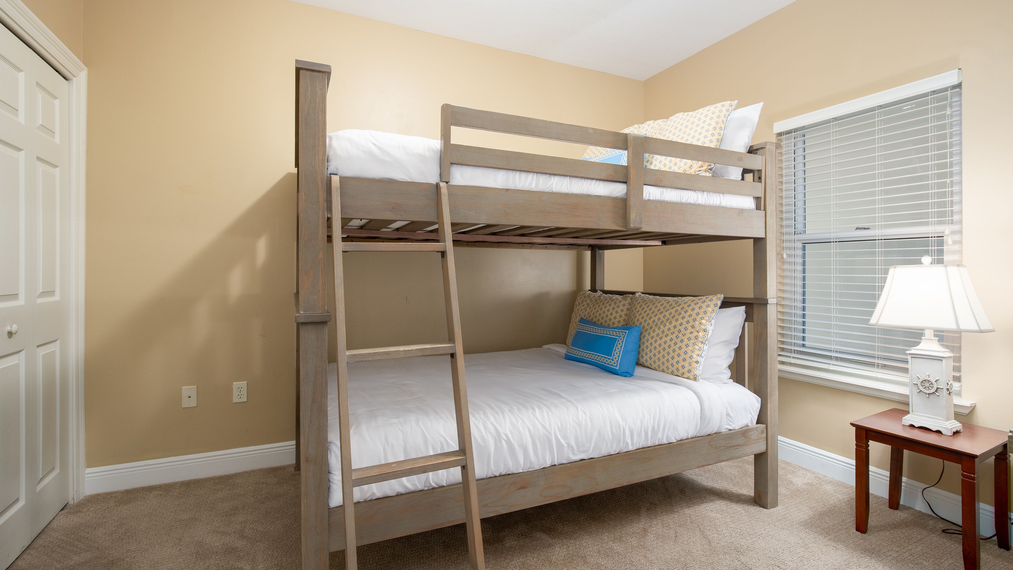 The master bedroom has a king bed, large walk in closet, and an en suite master bathroom with double vanities, large walk-in shower and oversized soaker tub. The two guest bedrooms also have en suite bathrooms, providing each guest with maximum privacy. The second bedroom has a queen bed and private balcony, and the third bedroom has a brand new set of bunk beds with two full size mattresses providing sleeping space for 4 people. There is also a pull out queen sized sleeper sofa in the living area so this condo will accommodate a total of 8 people.