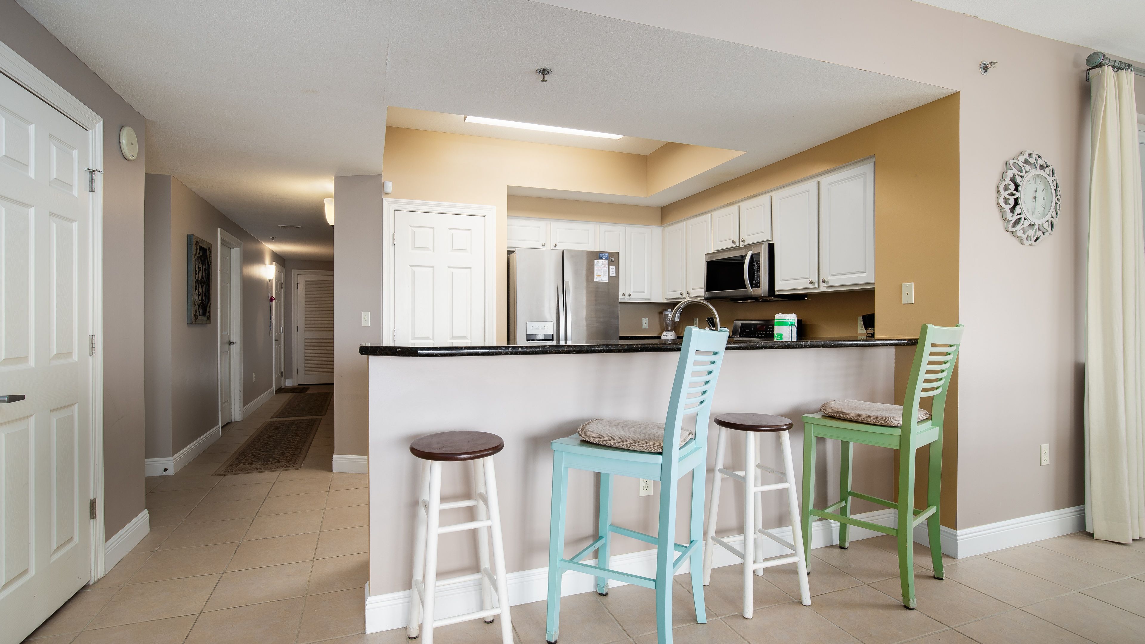 The kitchen has updated stainless steel appliances, natural stone counter tops and a four-seat breakfast bar. A large pantry, plenty of counter space and the additional breakfast bar space will make meal prep, serving and clean-up easy – which means more time for the beach!