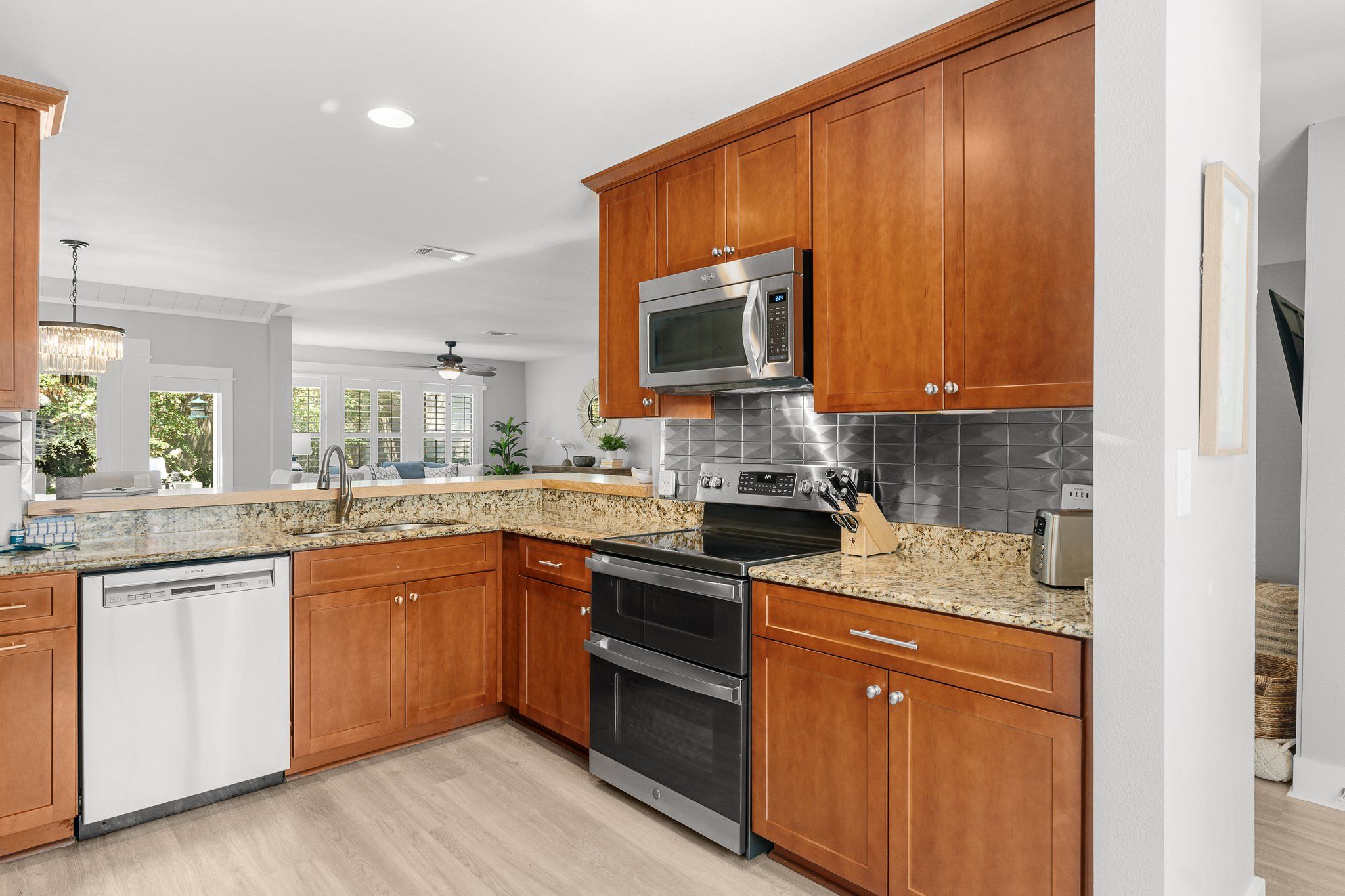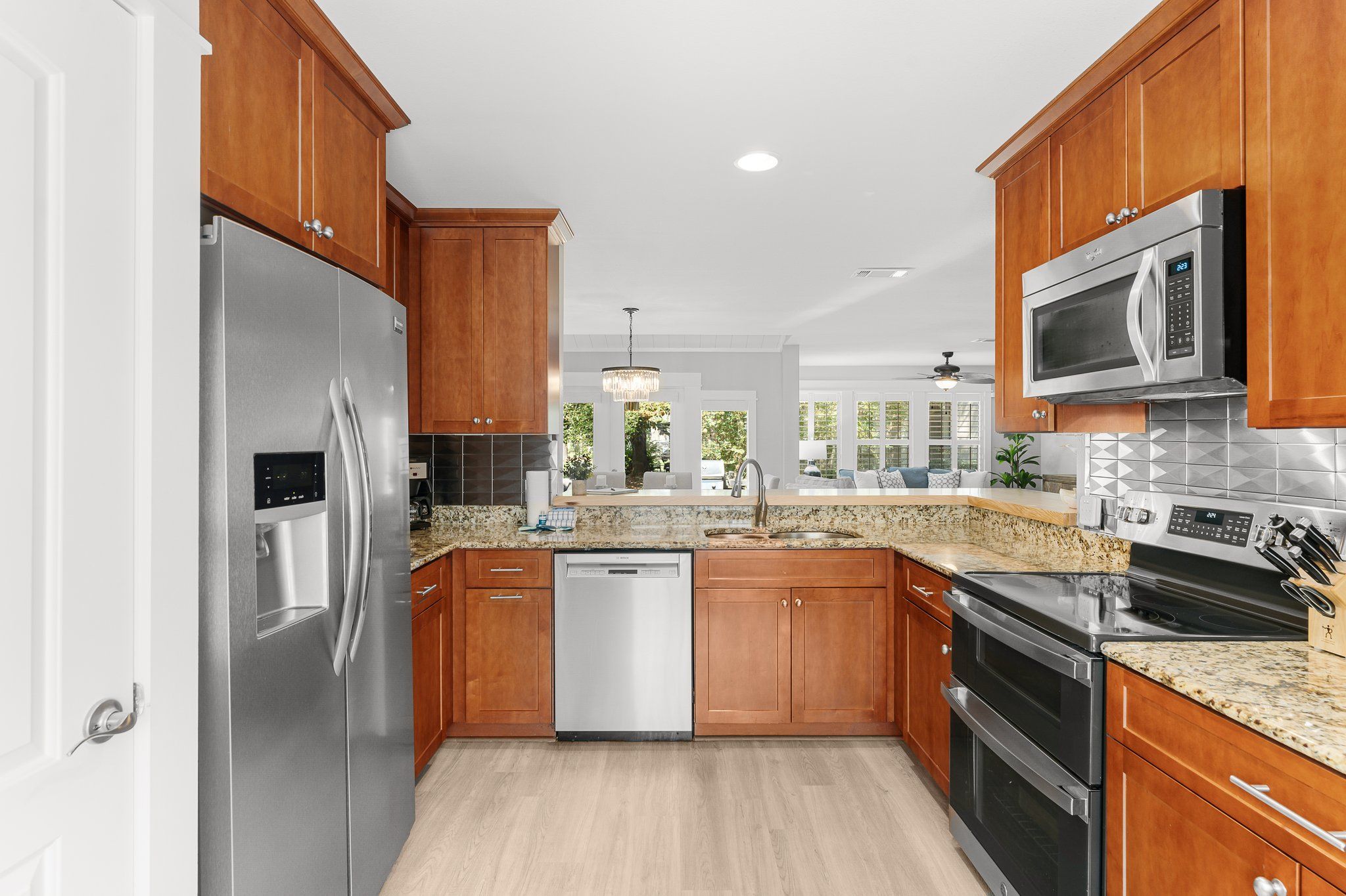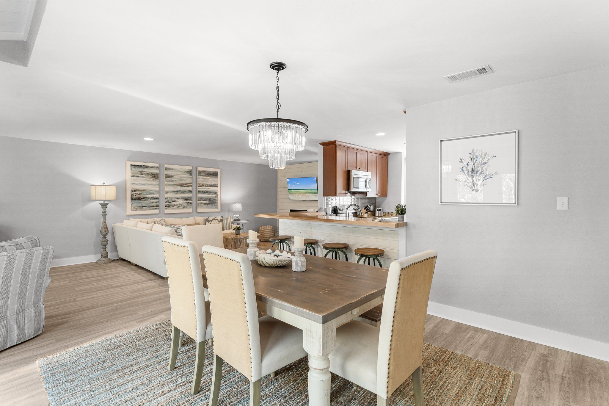 As you step inside, you’re welcomed by a spacious, open-concept kitchen and living area, perfect for hosting holiday gatherings. The fully stocked kitchen, complete with stainless steel appliances, a breakfast bar, and a stylish dining area, makes holiday meal prep a breeze. And with two private patios and outdoor dining options, you’ll have plenty of space to soak up the winter sunshine over meals with loved ones.