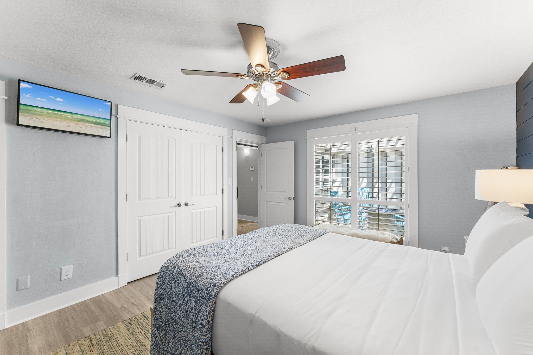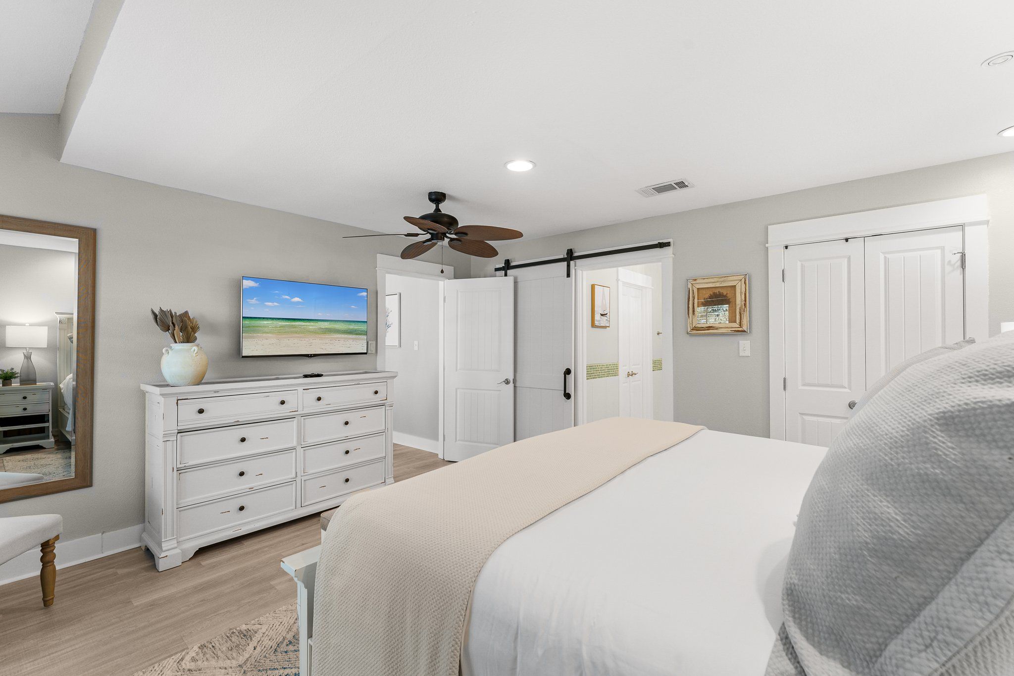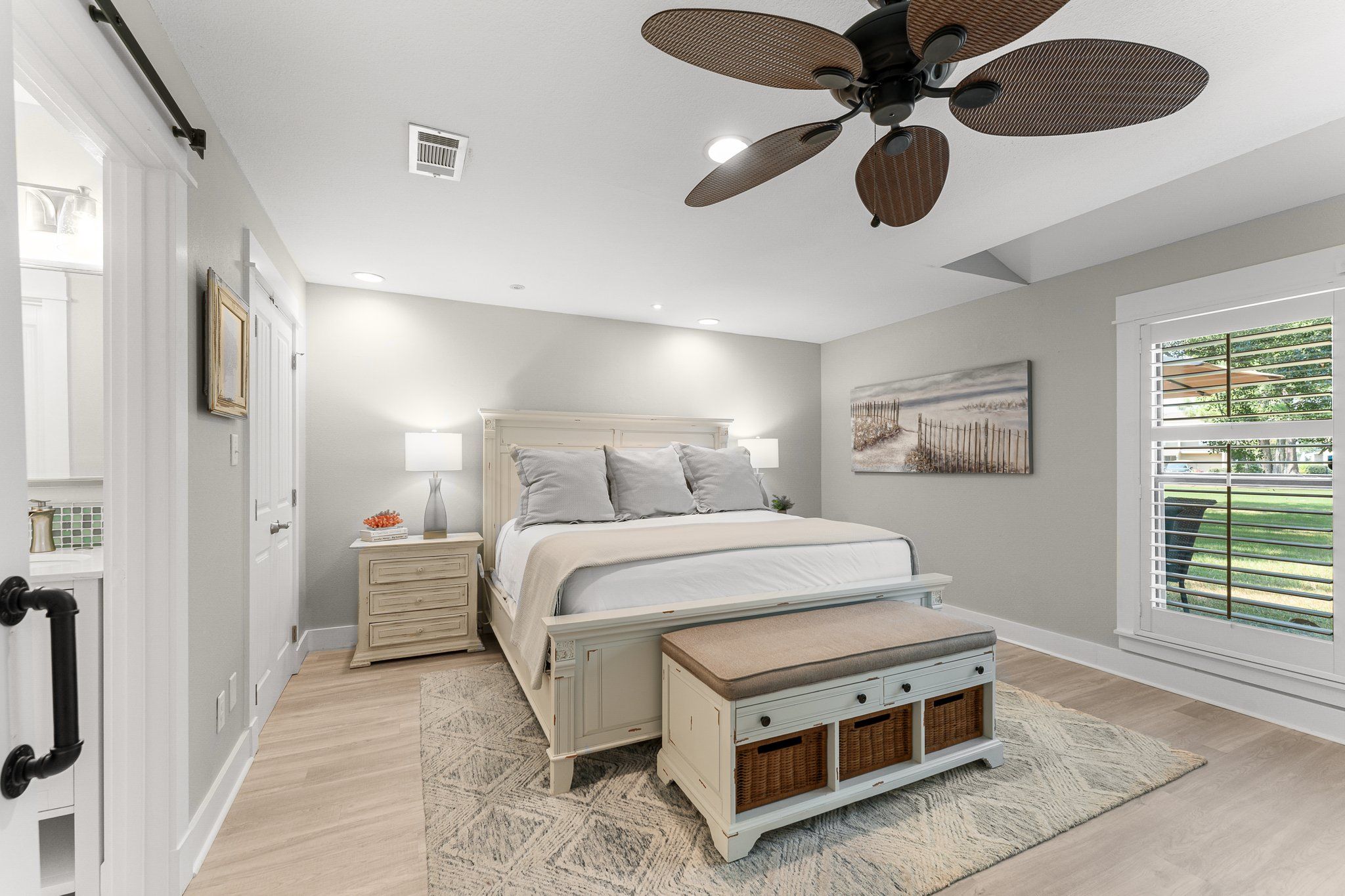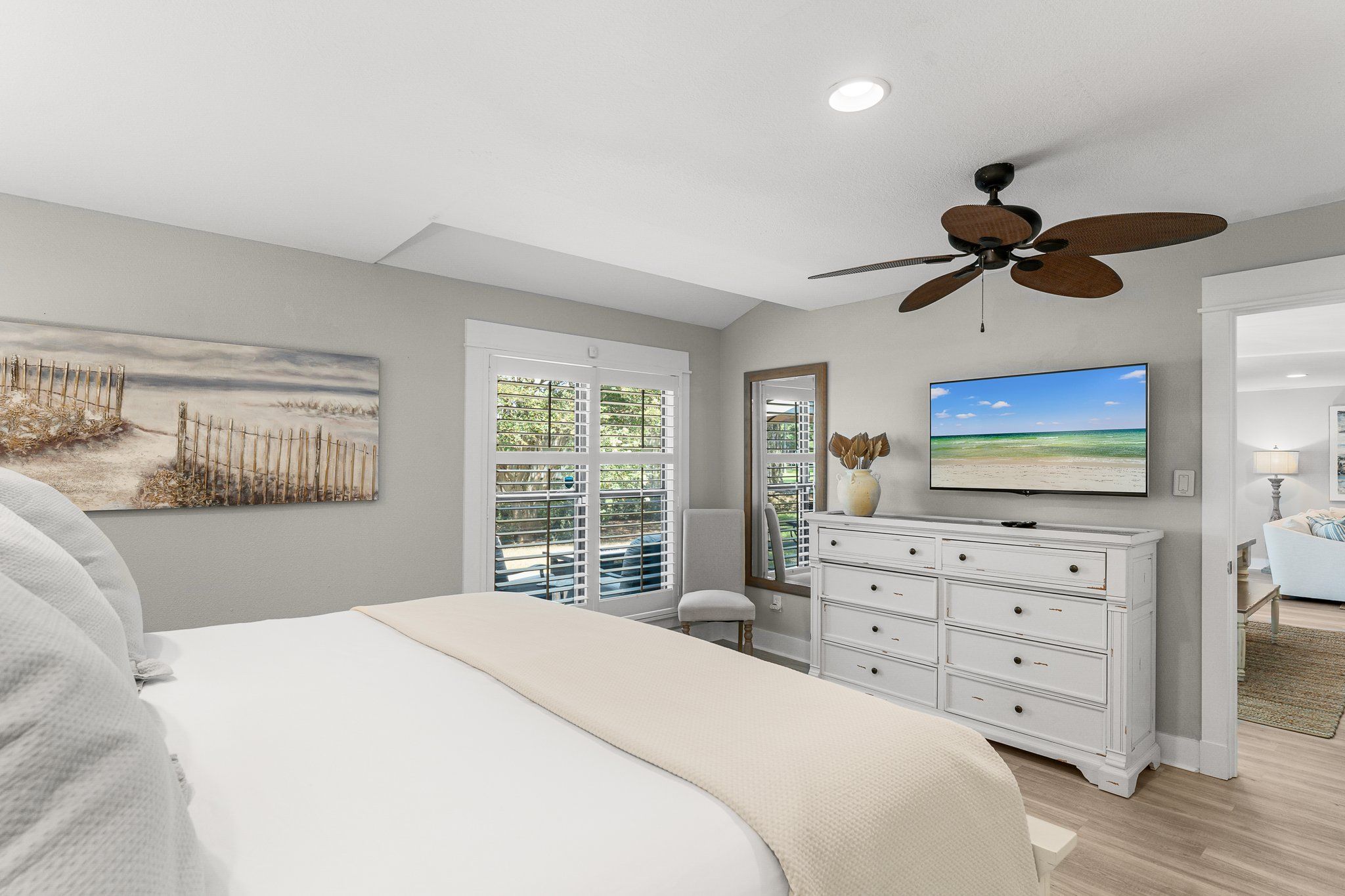 The master suite is a true snowbird’s retreat, featuring plantation-shuttered windows, a plush king bed, and an en suite bath with a beautiful barn door entrance, dual vanities, and a spa-inspired shower. Your guests will feel just as pampered in the elegantly appointed guest room with cozy bedding, a flat-screen TV, and its own full bath, complete with walk-in shower and dual vanities. An additional sleeper sofa in the living area offers more space for friends or family visiting your vacation home.