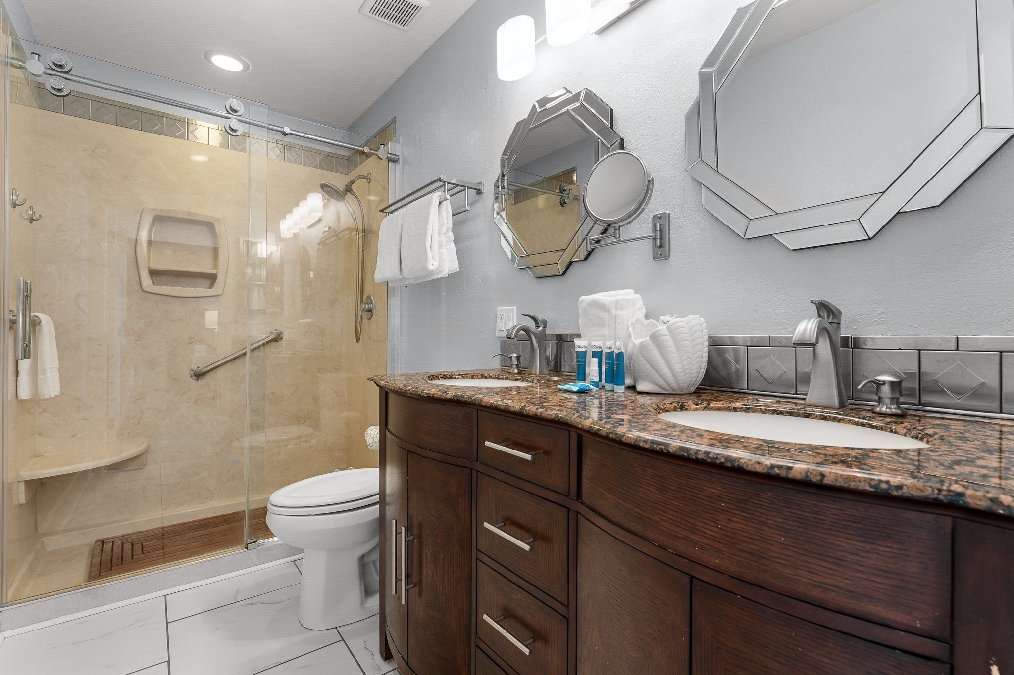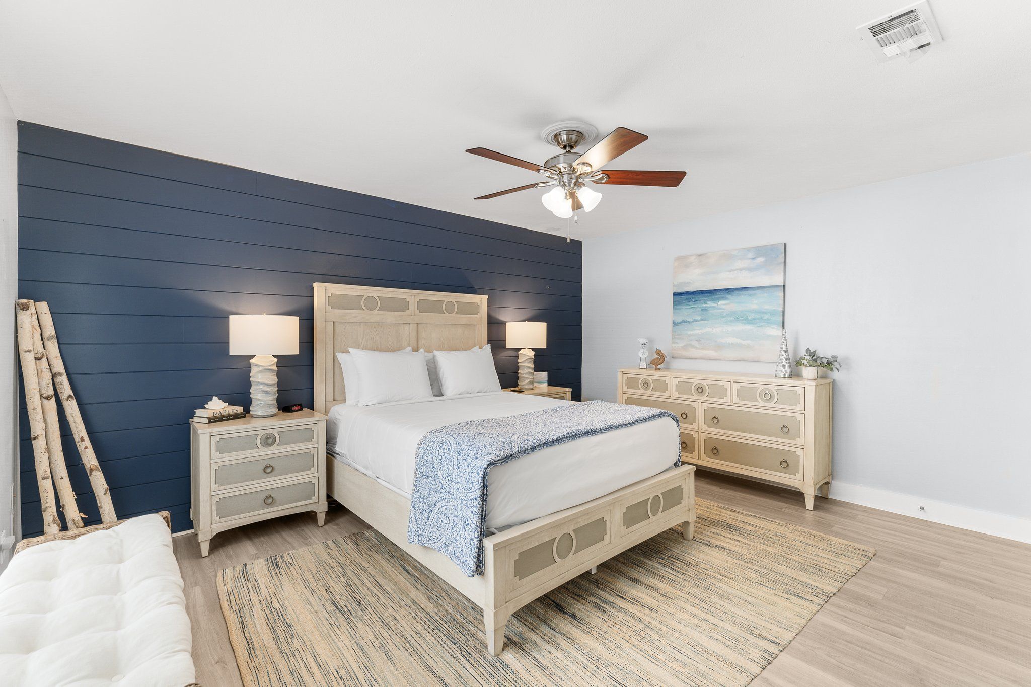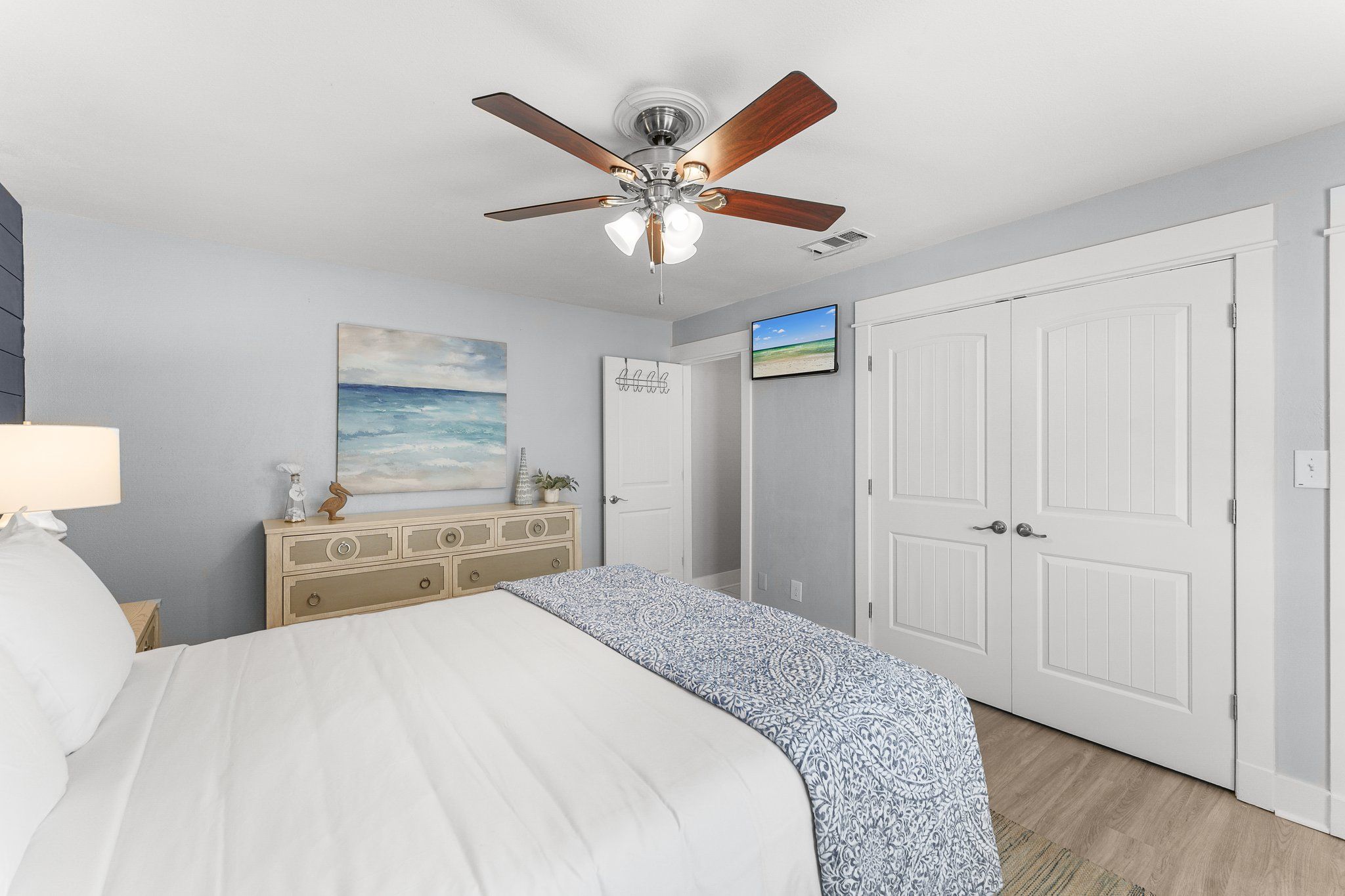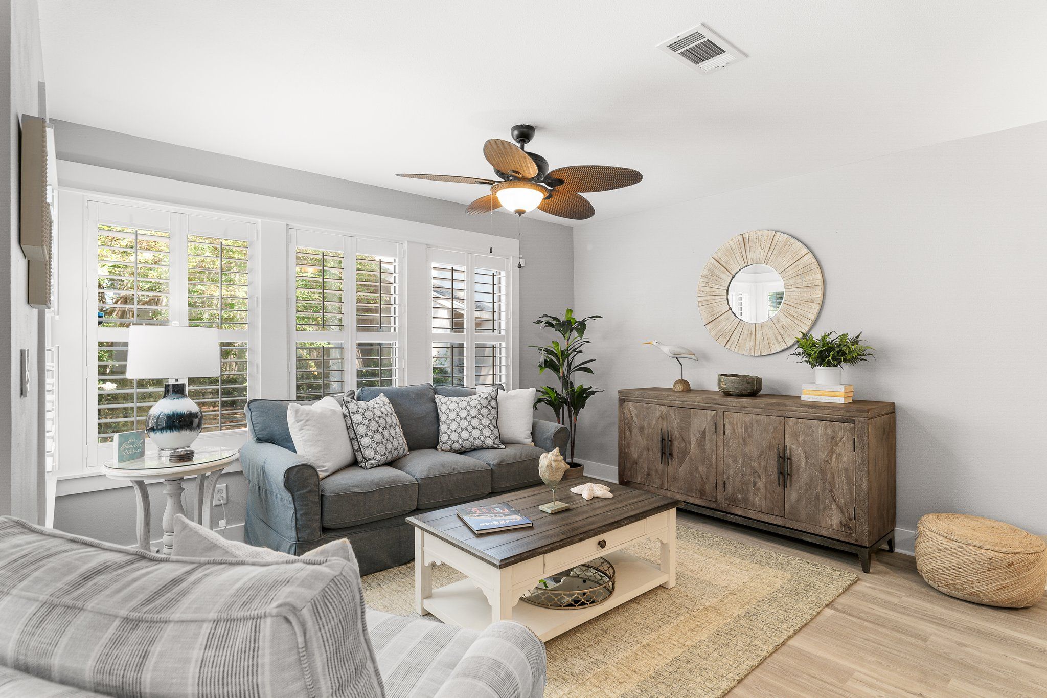 The master suite is a true snowbird’s retreat, featuring plantation-shuttered windows, a plush king bed, and an en suite bath with a beautiful barn door entrance, dual vanities, and a spa-inspired shower. Your guests will feel just as pampered in the elegantly appointed guest room with cozy bedding, a flat-screen TV, and its own full bath, complete with walk-in shower and dual vanities. An additional sleeper sofa in the living area offers more space for friends or family visiting your vacation home.