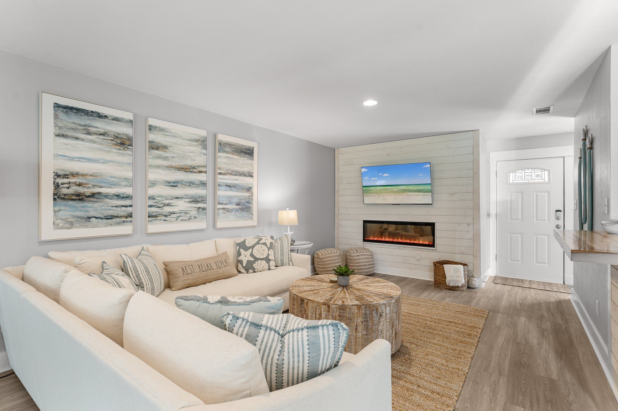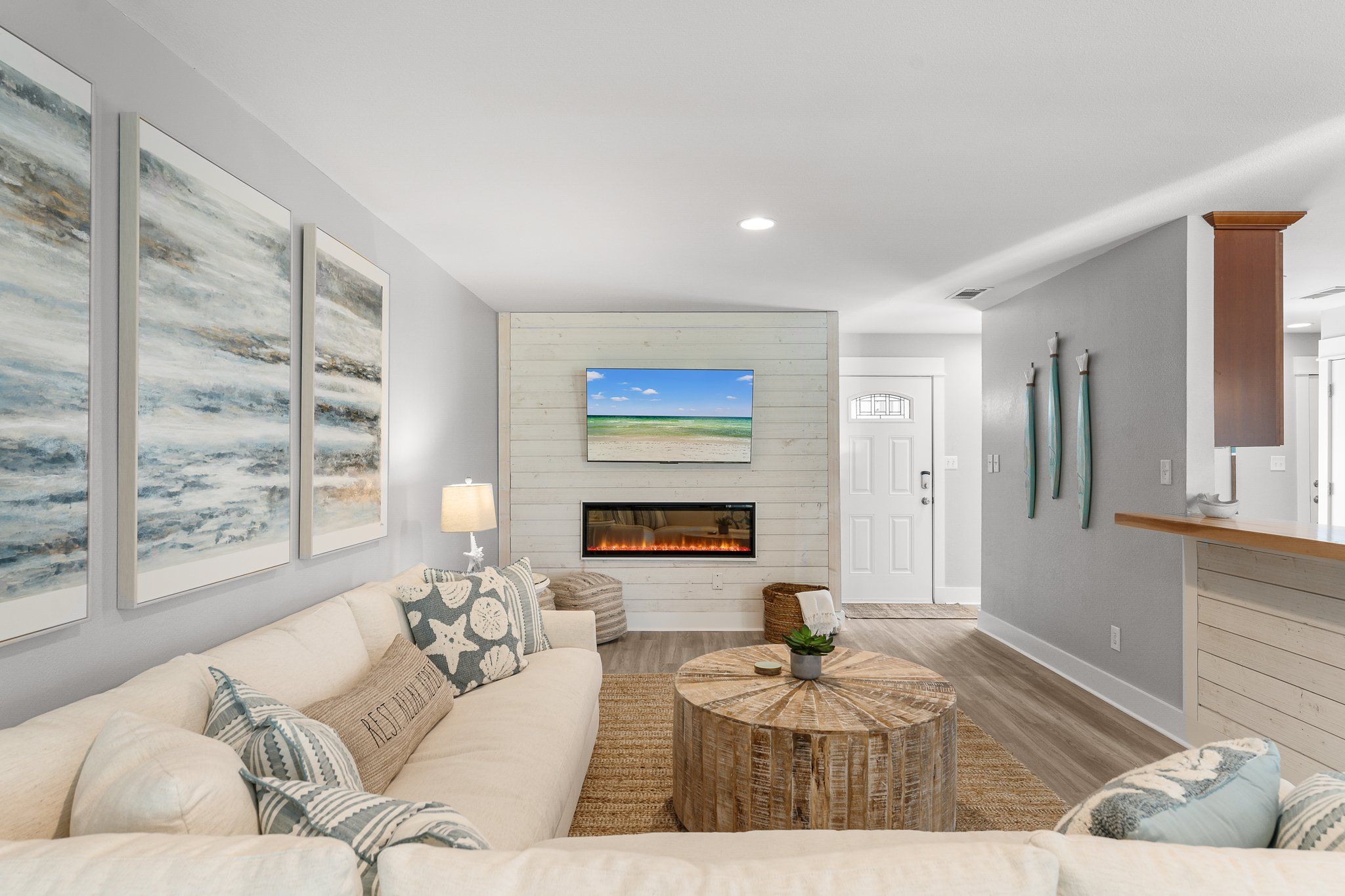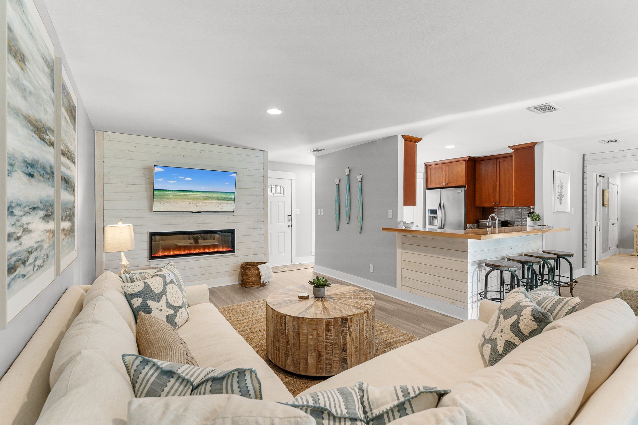 In the spacious living room, enjoy gathering by the decorative glass fireplace on cozy sofas, surrounded by natural light streaming through abundant windows. When you’re ready to explore, hop into your golf cart and head over to The Village of Baytowne Wharf. This vibrant hub offers everything from live music and unique dining options to boutique shops and lively bars, providing endless entertainment and convenience for snowbird visitors.