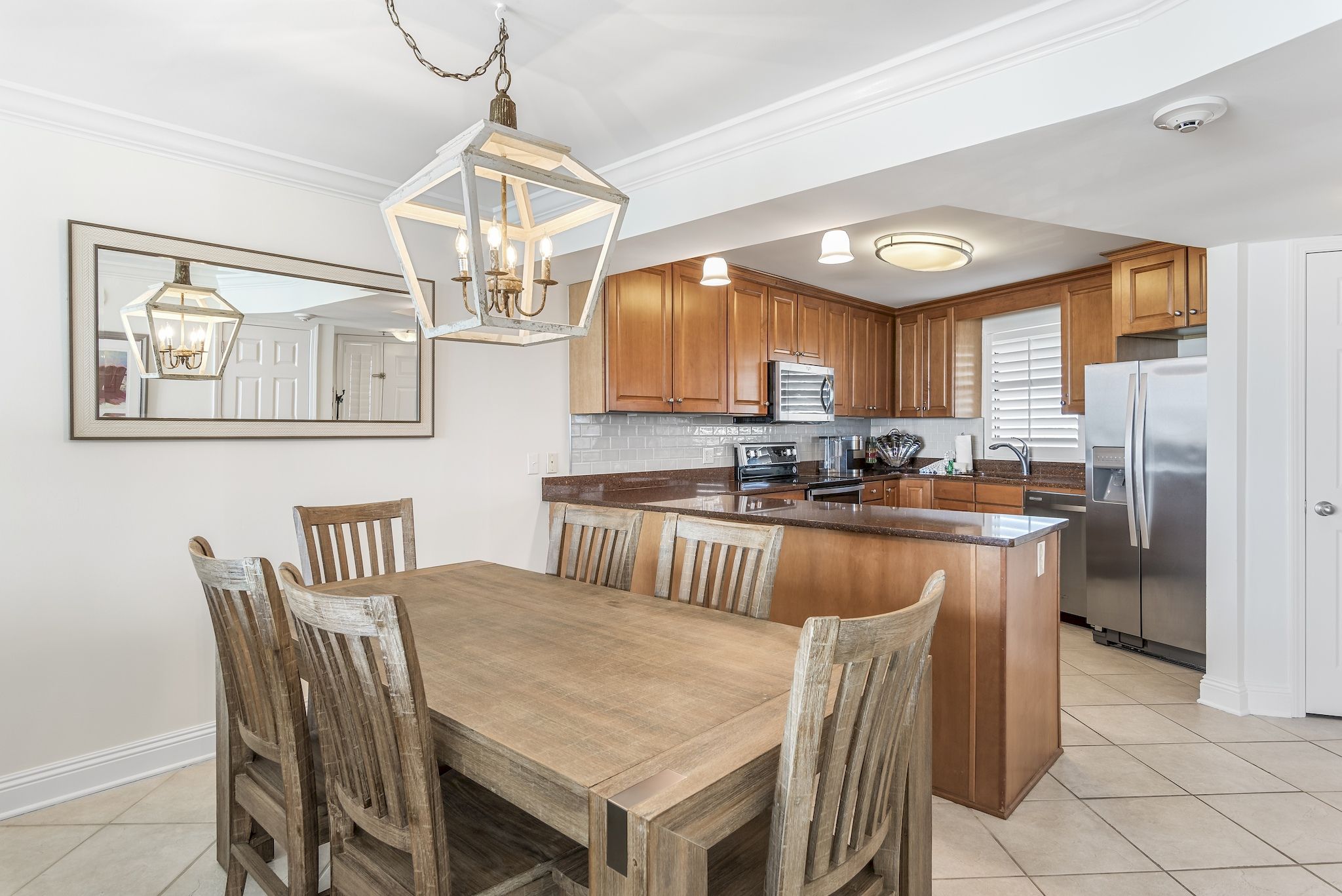 The fully-equipped kitchen is a chef’s dream, with sleek cabinetry, solid surface countertops, and top-tier appliances, ensuring you can prepare meals with ease while enjoying the coastal charm around you.