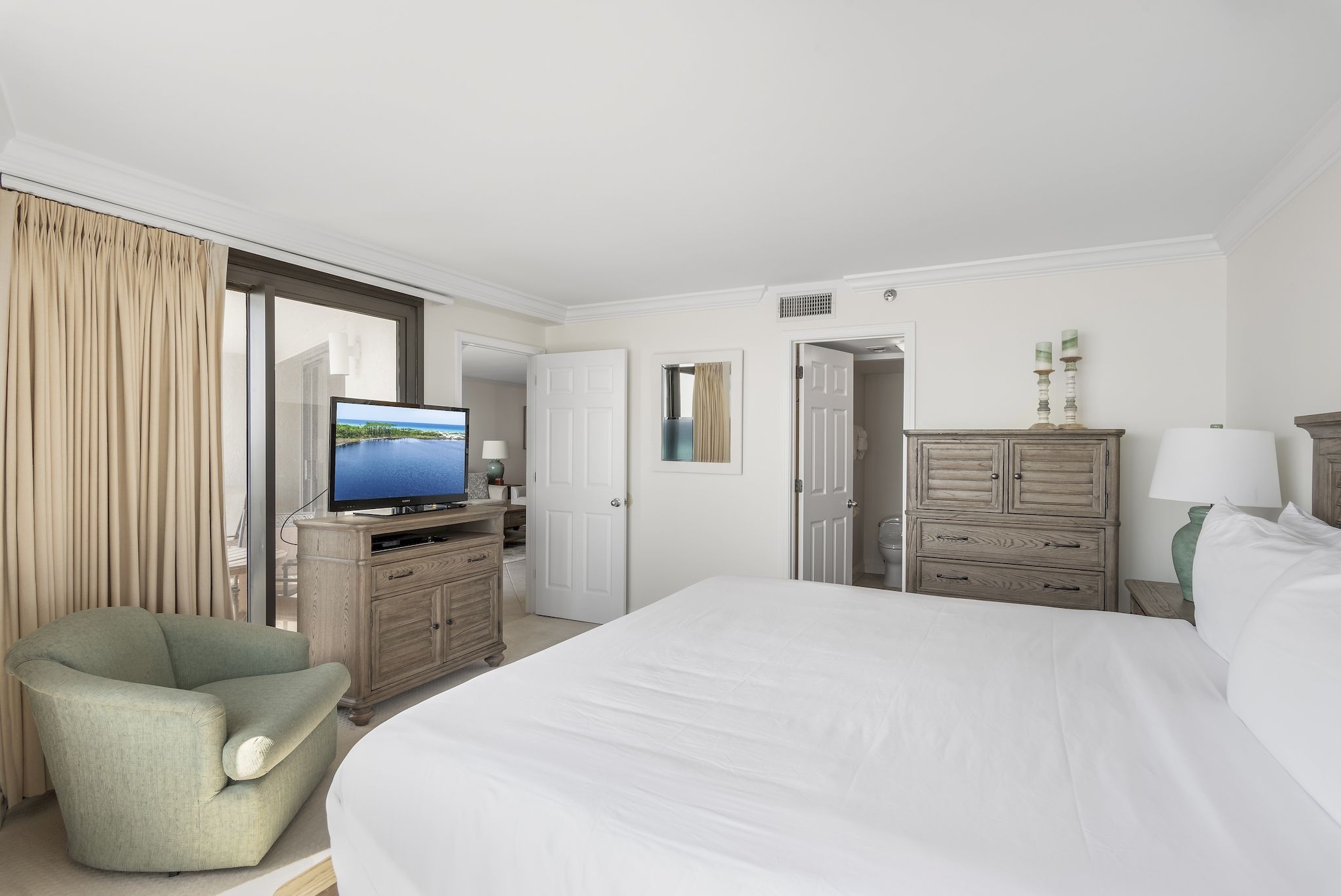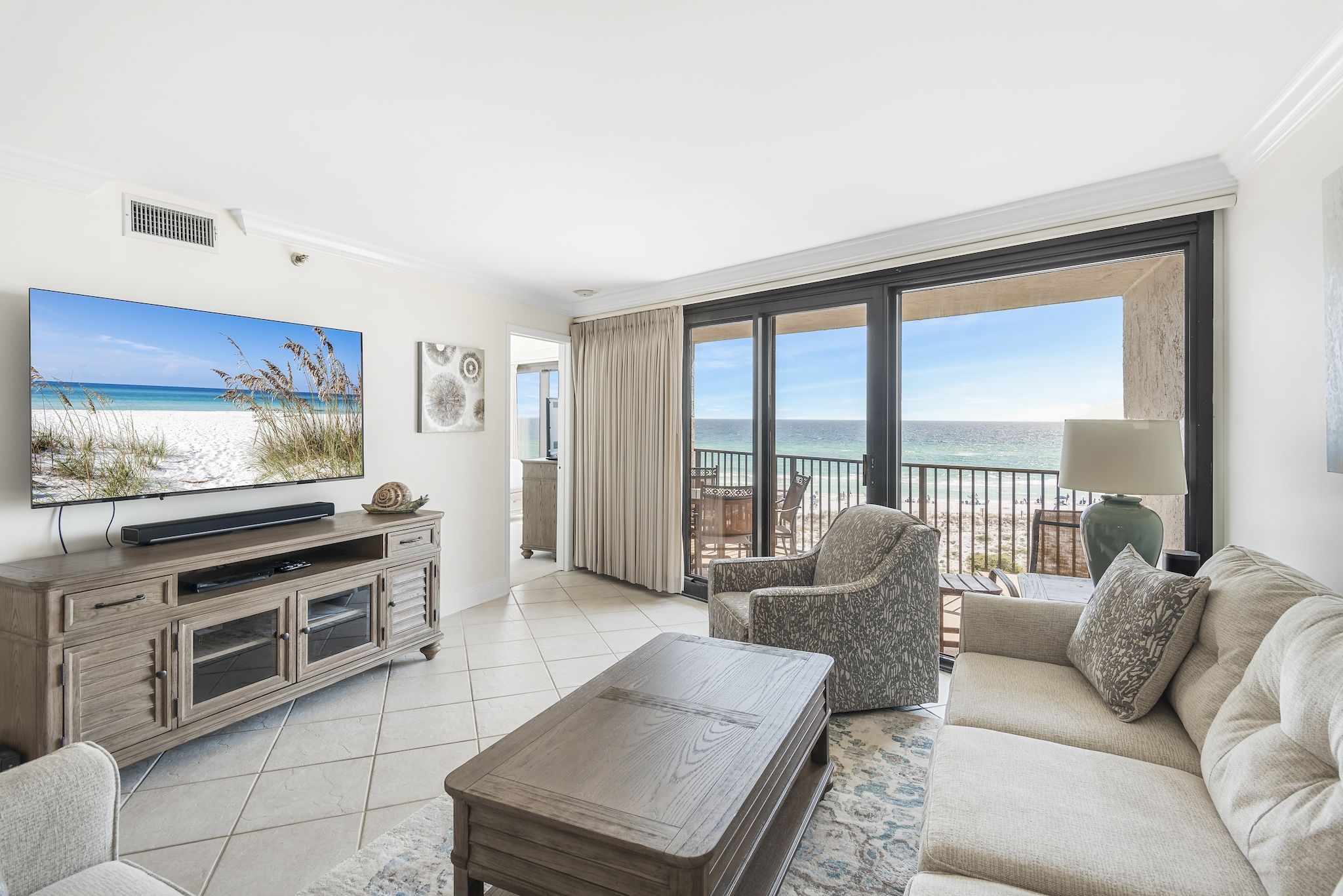 The open-concept living space is a haven of comfort, featuring plush furnishings, a 65-inch smart TV for your entertainment, and floor-to-ceiling windows that lead out to a spacious private balcony. From here, you can sip your morning coffee while soaking in panoramic vistas of sparkling emerald waters, rolling sand dunes, and the endless horizon—making every moment feel like a getaway to paradise.