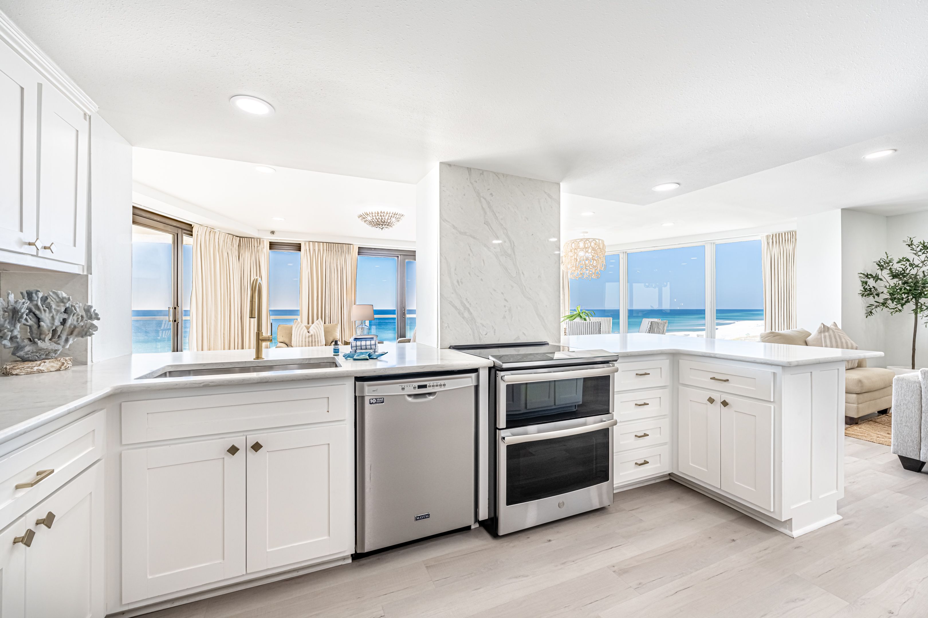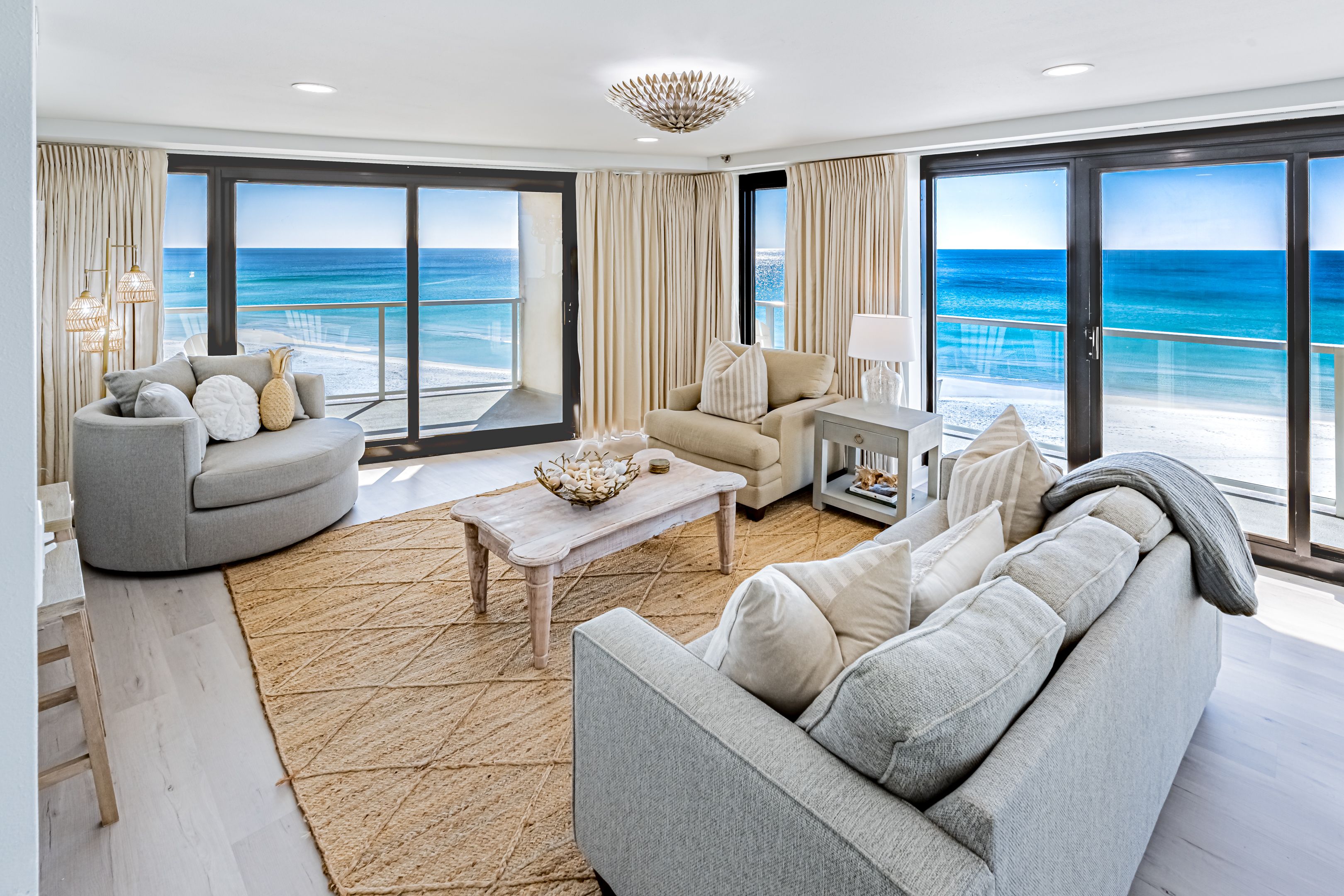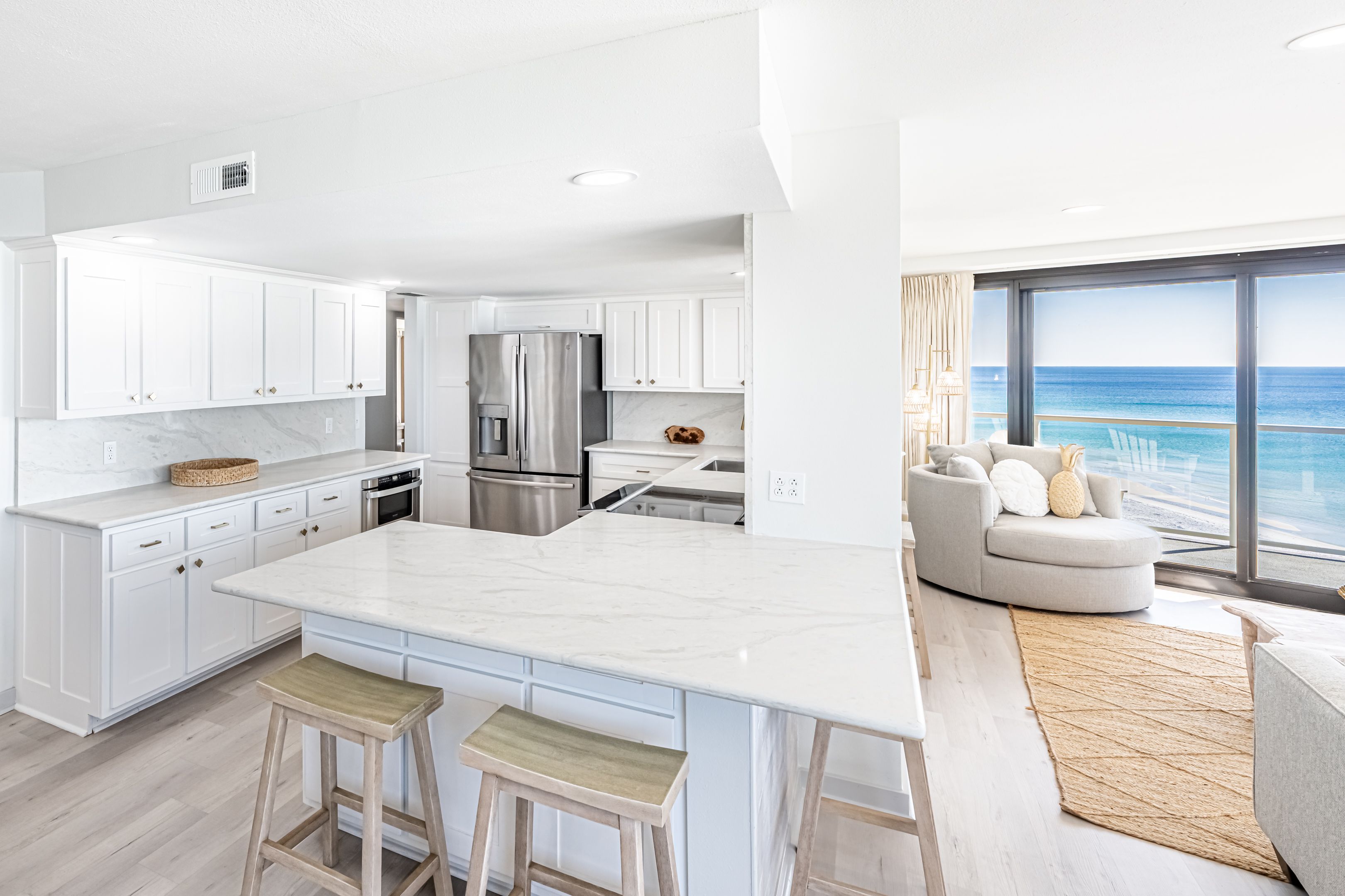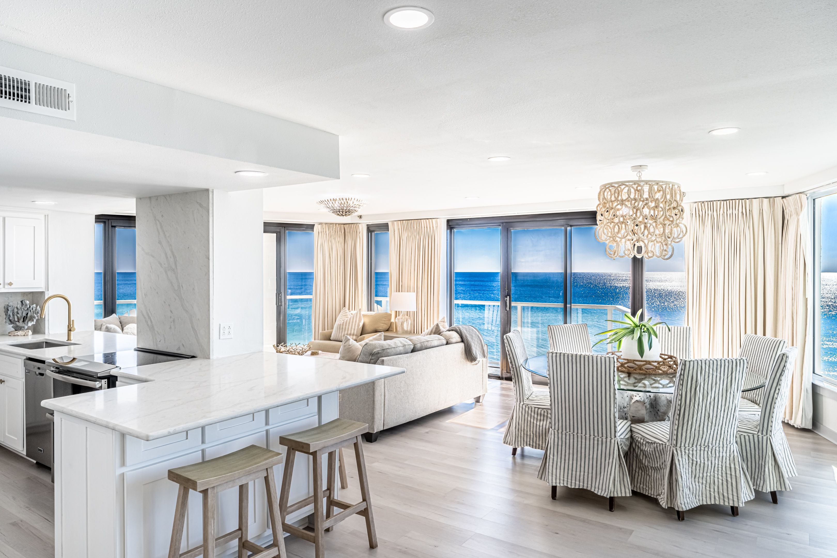 Designed for comfort and connection, while seamlessly blending style and coastal sophistication, featuring an open-concept layout that unites the living, dining, and kitchen areas. Floor-to-ceiling windows bring the light and coastal landscapes inside. Perfect for creating lasting memories, this space includes two distinct living areas—one with breathtaking gulf front views and another for cozy movie nights.