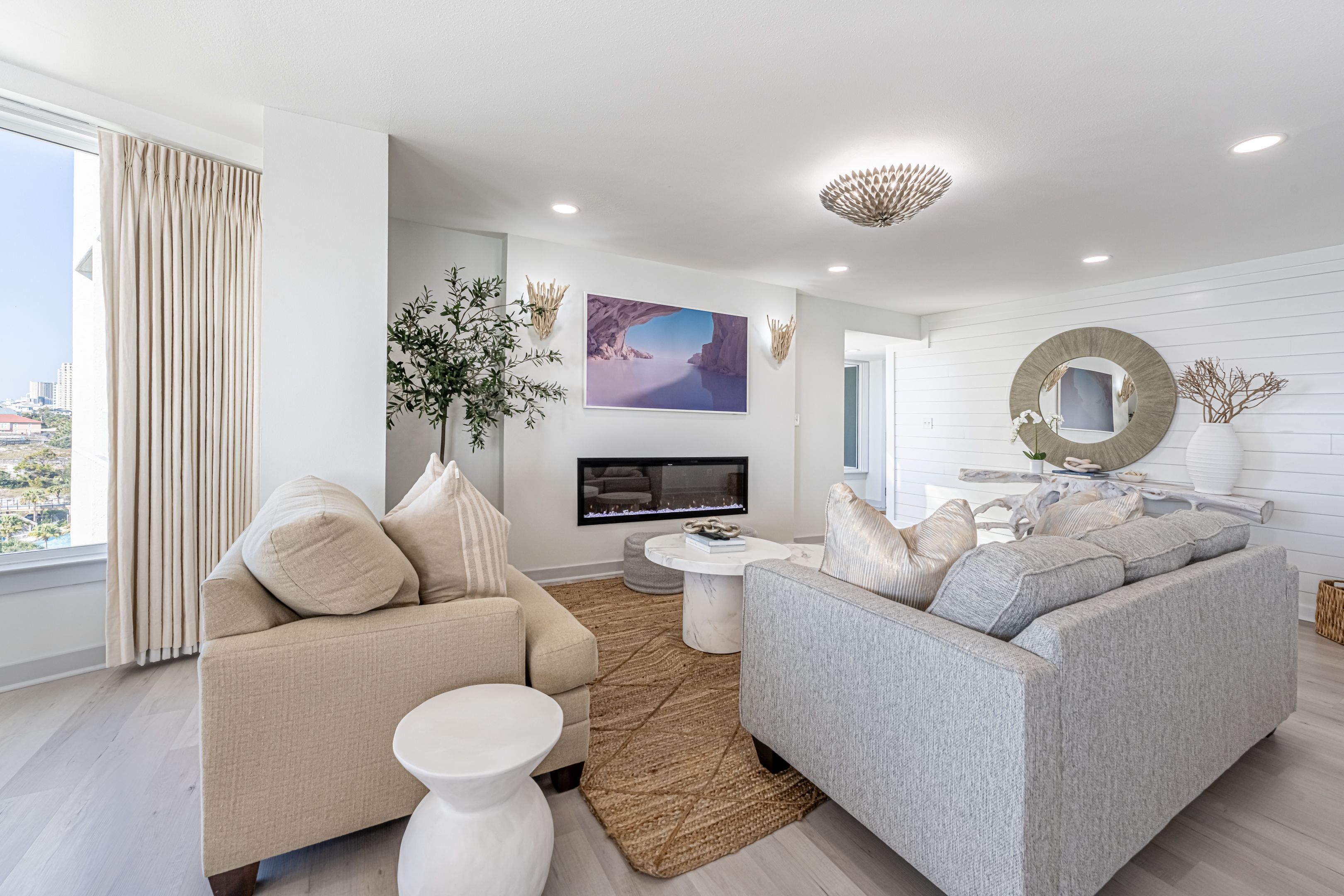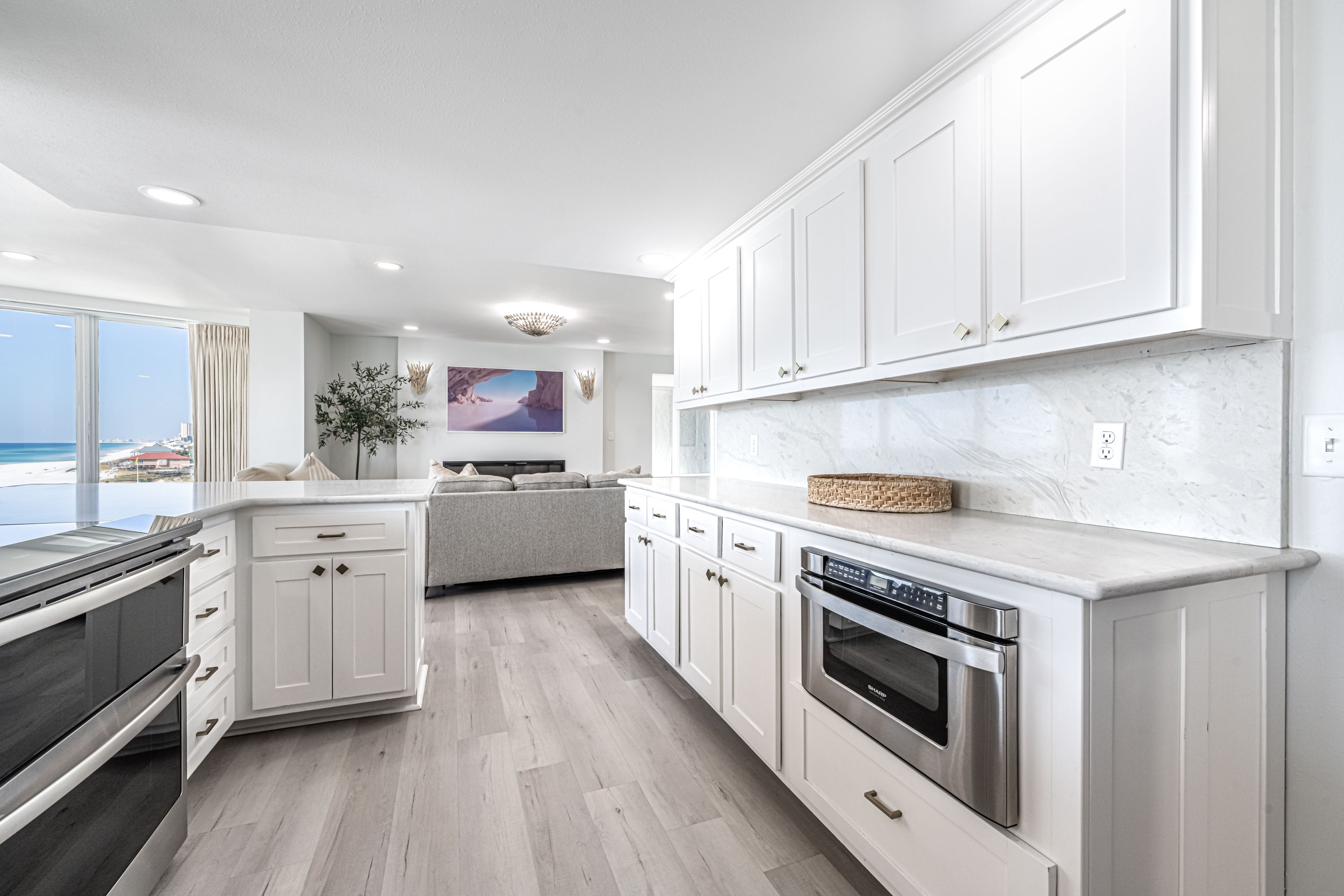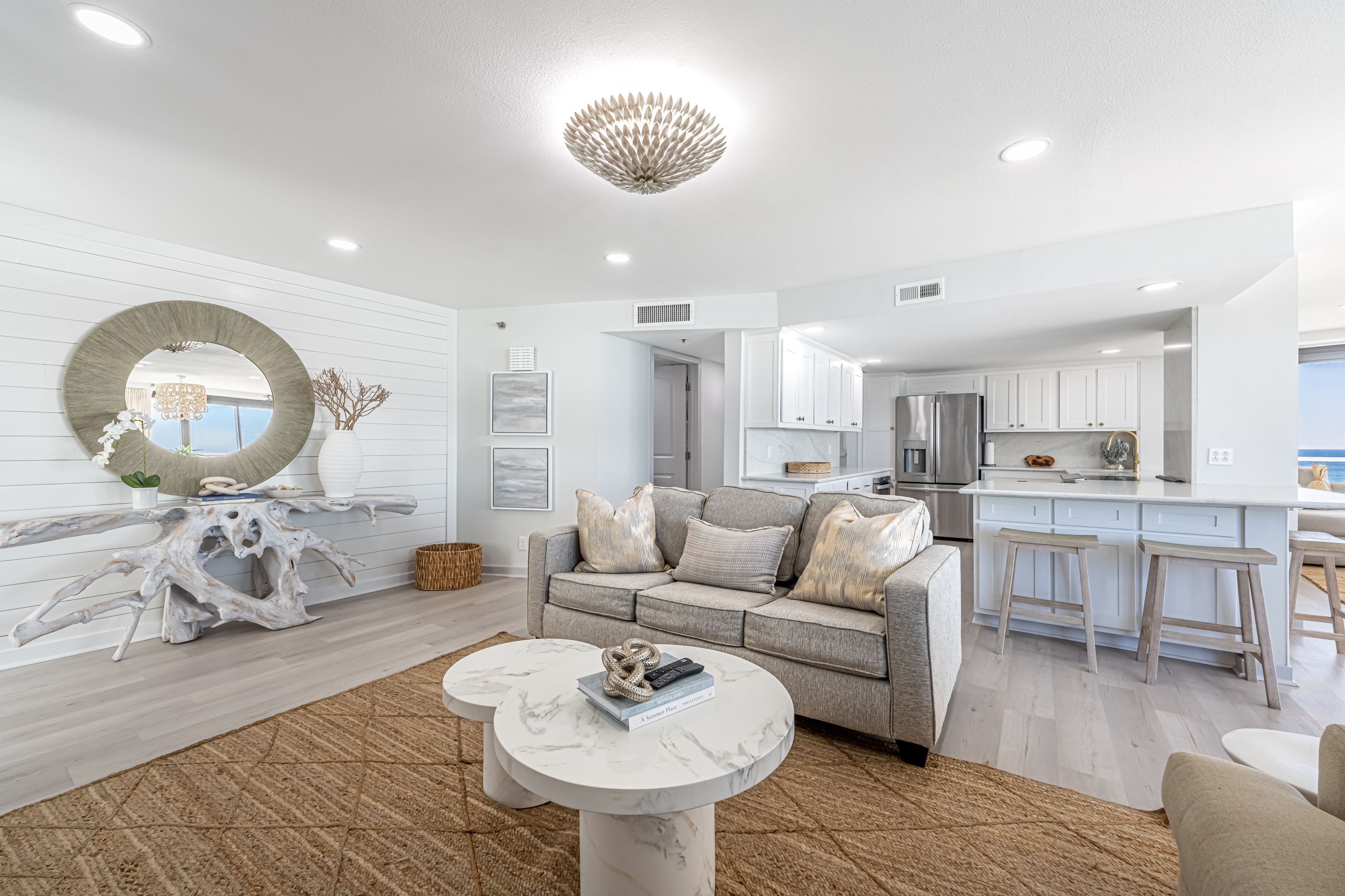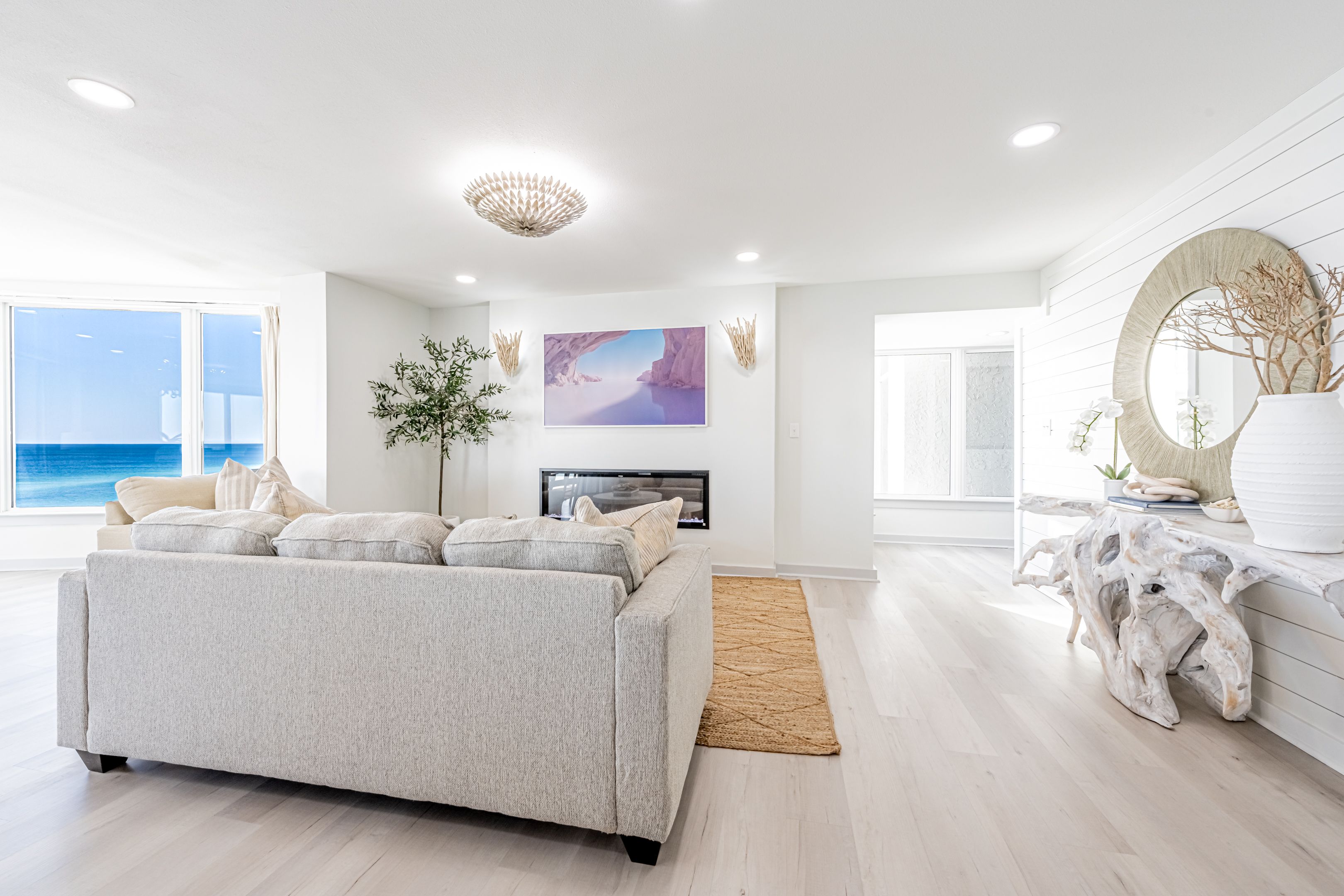 Designed for comfort and connection, while seamlessly blending style and coastal sophistication, featuring an open-concept layout that unites the living, dining, and kitchen areas. Floor-to-ceiling windows bring the light and coastal landscapes inside. Perfect for creating lasting memories, this space includes two distinct living areas—one with breathtaking gulf front views and another for cozy movie nights.