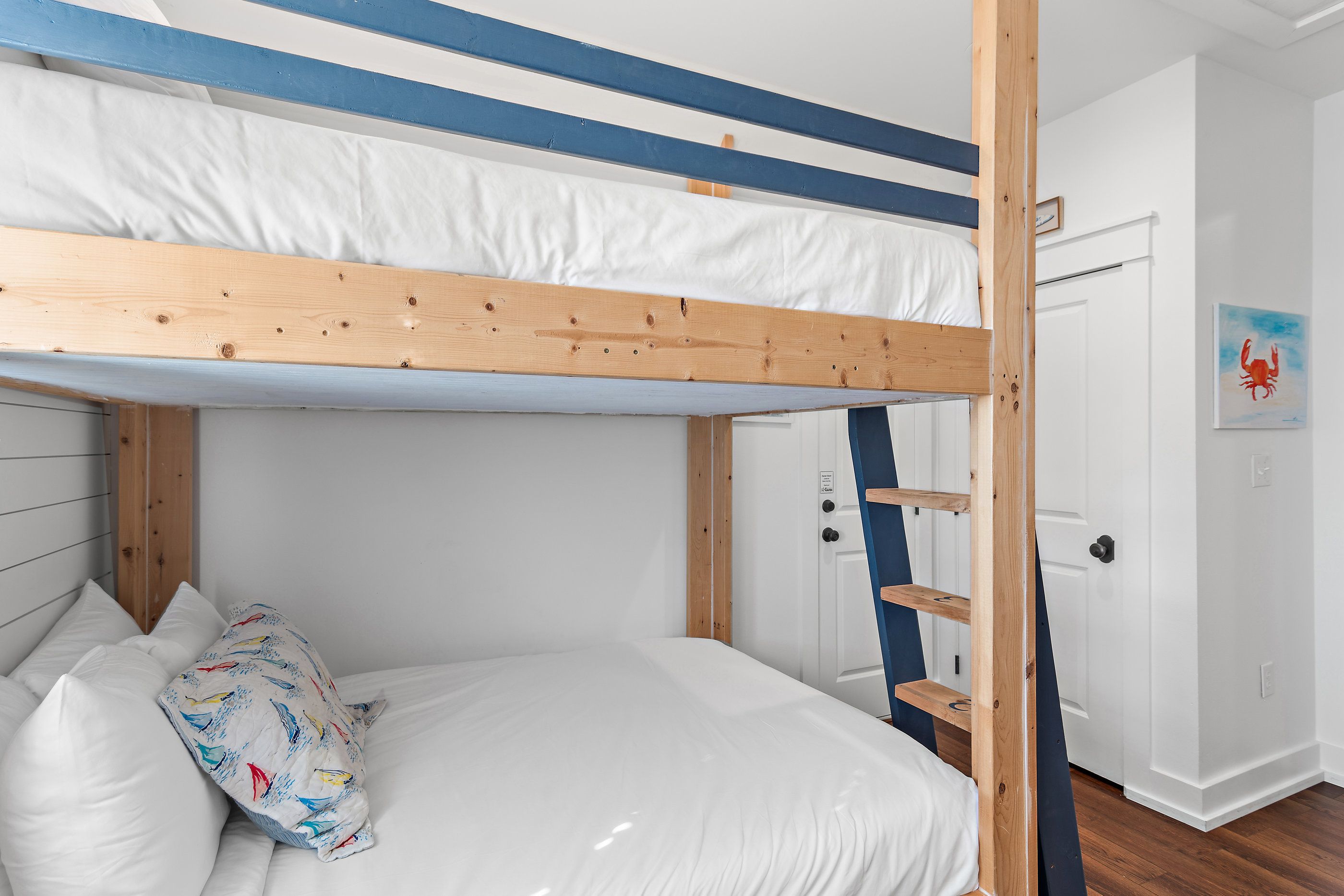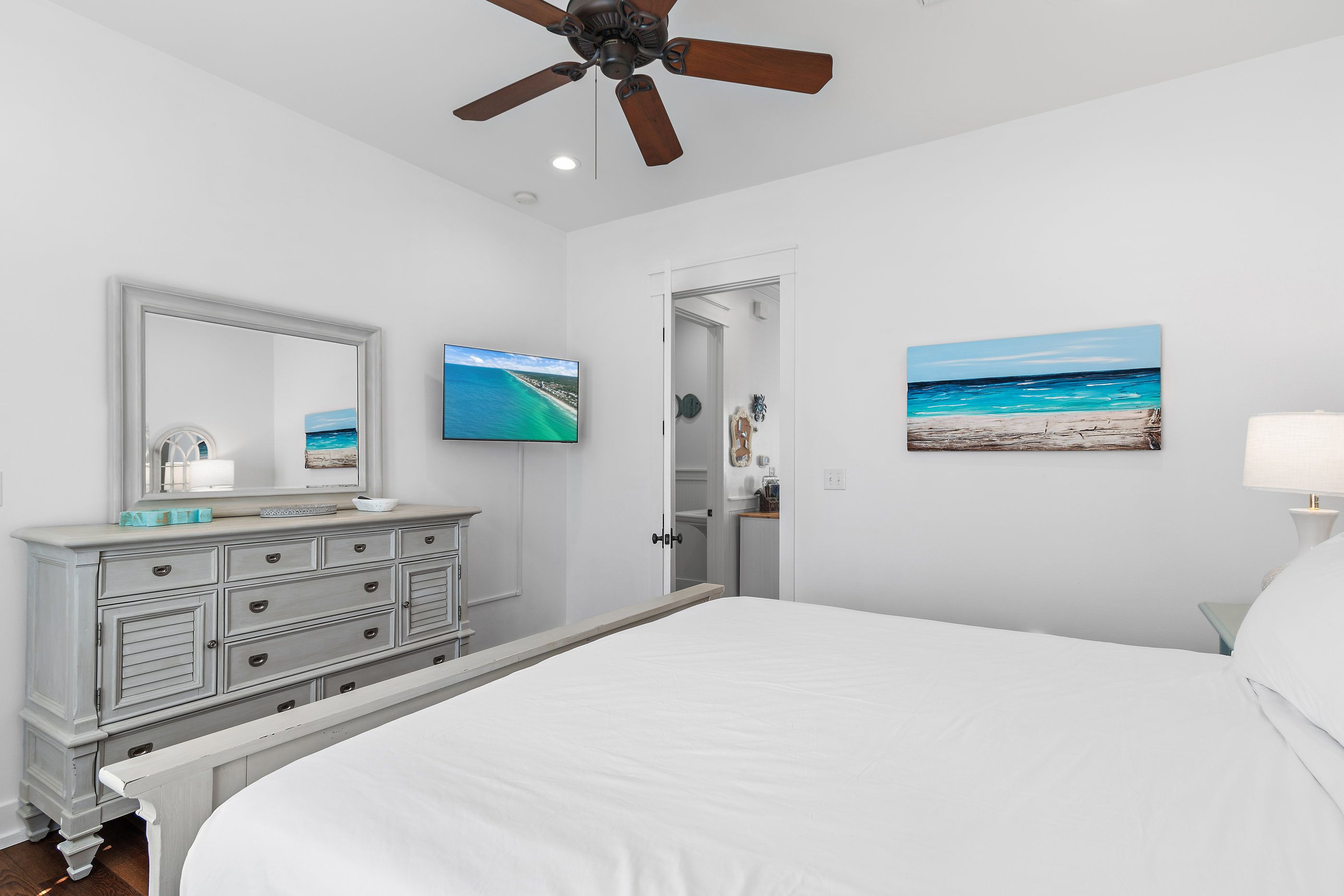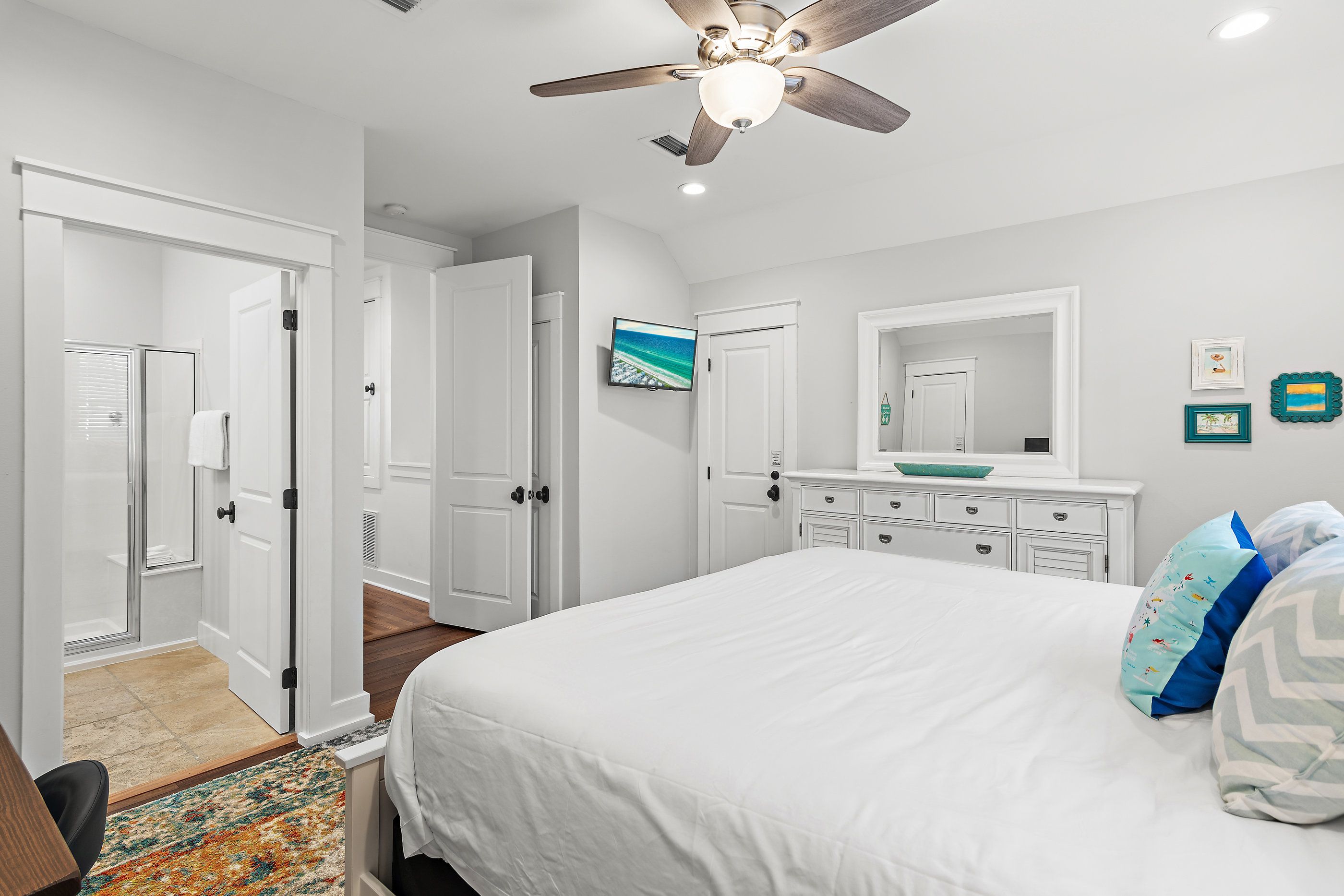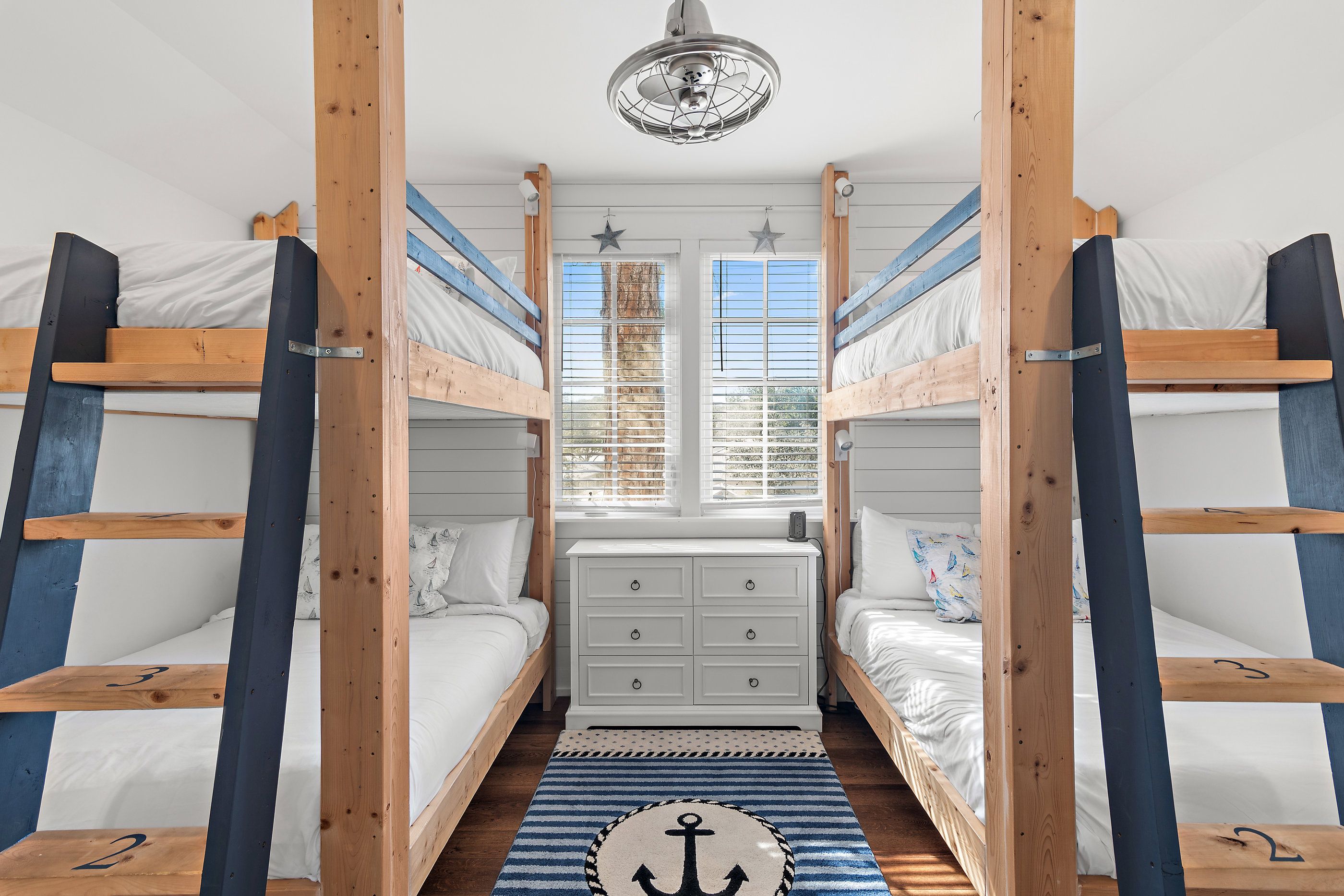 The master suite on the first floor is a plush sanctuary of relaxation, light and airy with crisp white linens and coastal furniture, featuring a spacious bathroom with a double vanity and an oversized walk-in shower, and complemented by a large closet for all your seaside attire. Ascend to the second floor to discover two guest bedrooms, each boasting its own en-suite bathroom for ultimate privacy and convenience. One bedroom offers a luxurious king-sized bed, while the other delights with custom-built, full-over-full bunk beds—comfortable for guests for all ages.
