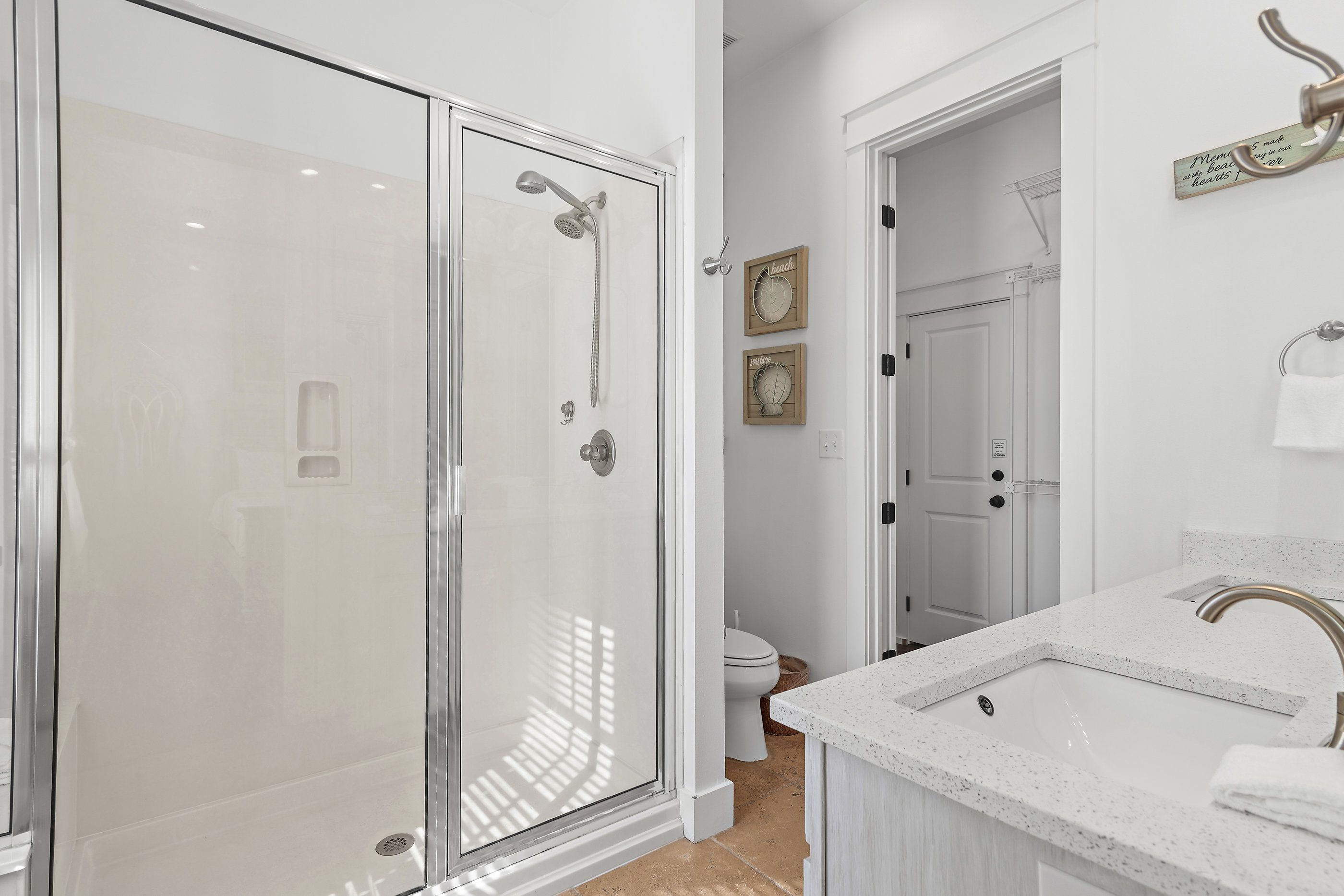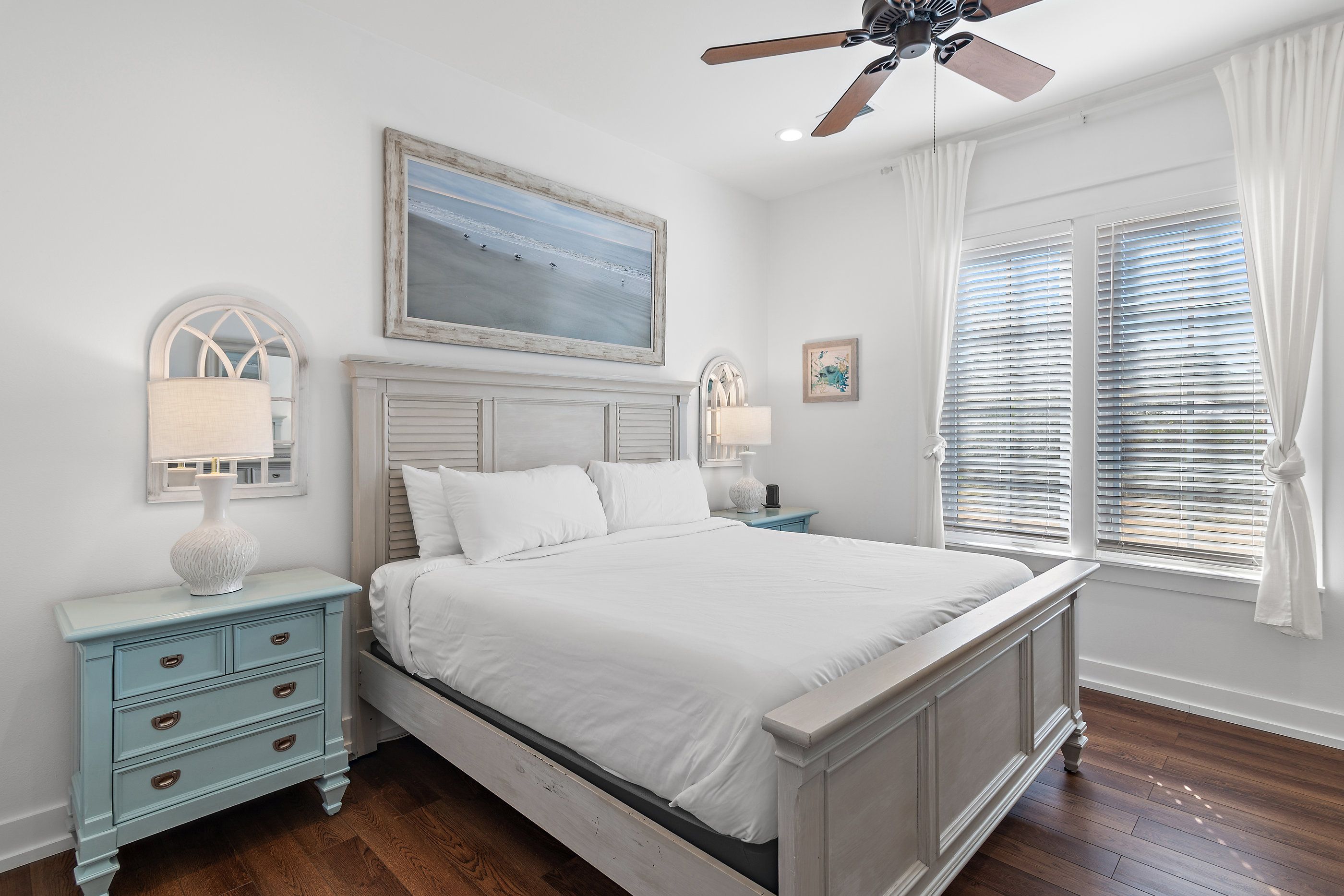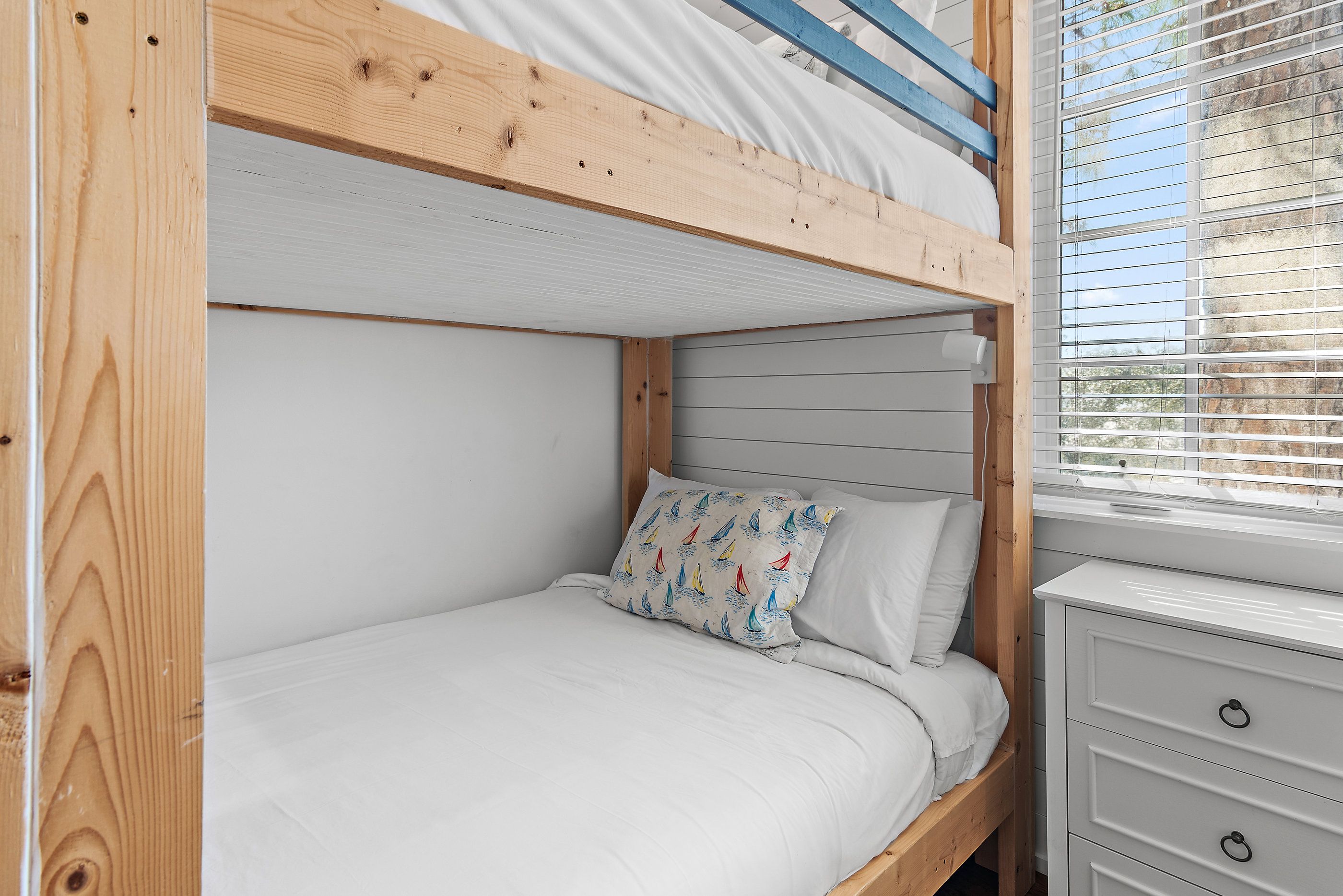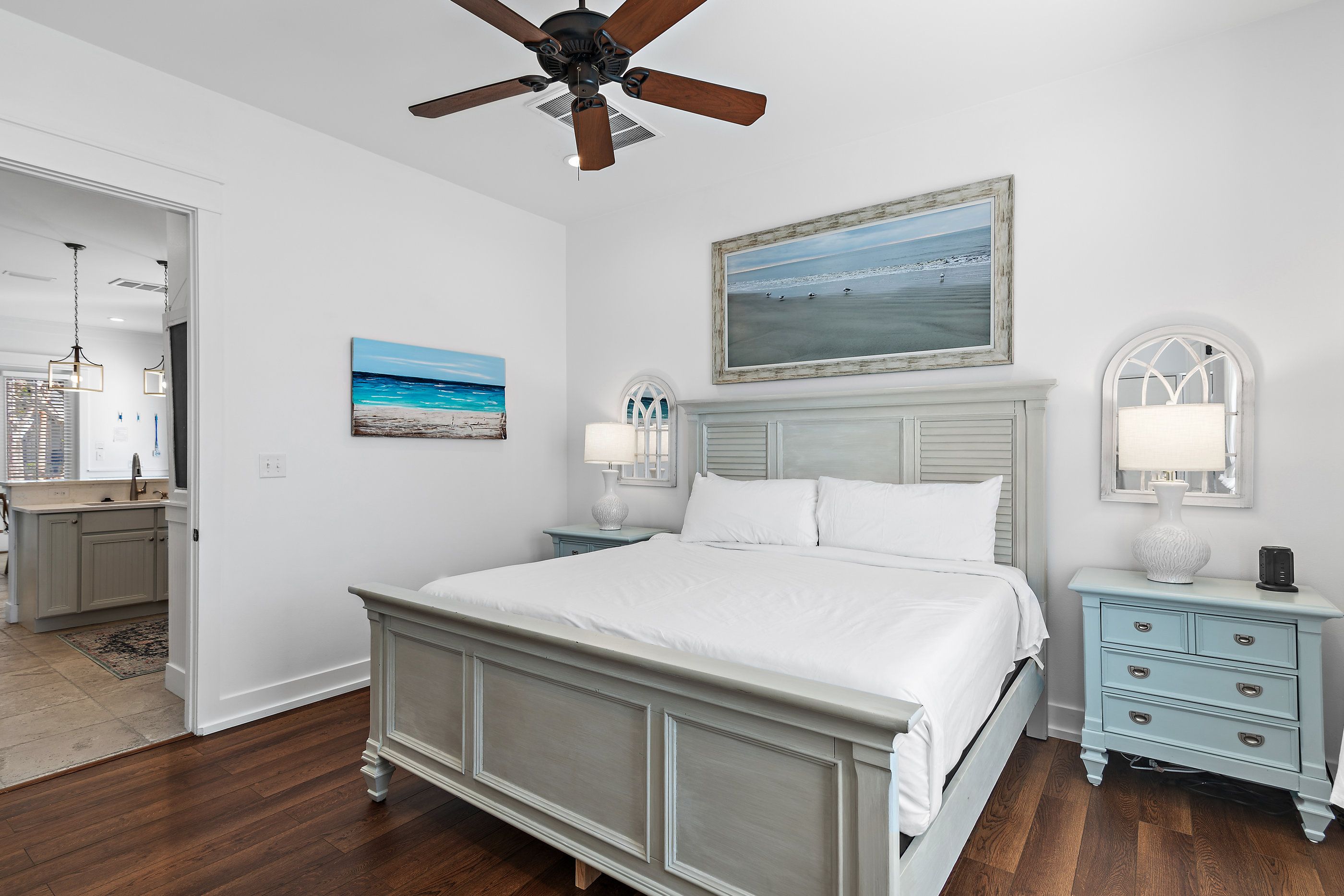 The master suite on the first floor is a plush sanctuary of relaxation, light and airy with crisp white linens and coastal furniture, featuring a spacious bathroom with a double vanity and an oversized walk-in shower, and complemented by a large closet for all your seaside attire. Ascend to the second floor to discover two guest bedrooms, each boasting its own en-suite bathroom for ultimate privacy and convenience. One bedroom offers a luxurious king-sized bed, while the other delights with custom-built, full-over-full bunk beds—comfortable for guests for all ages.