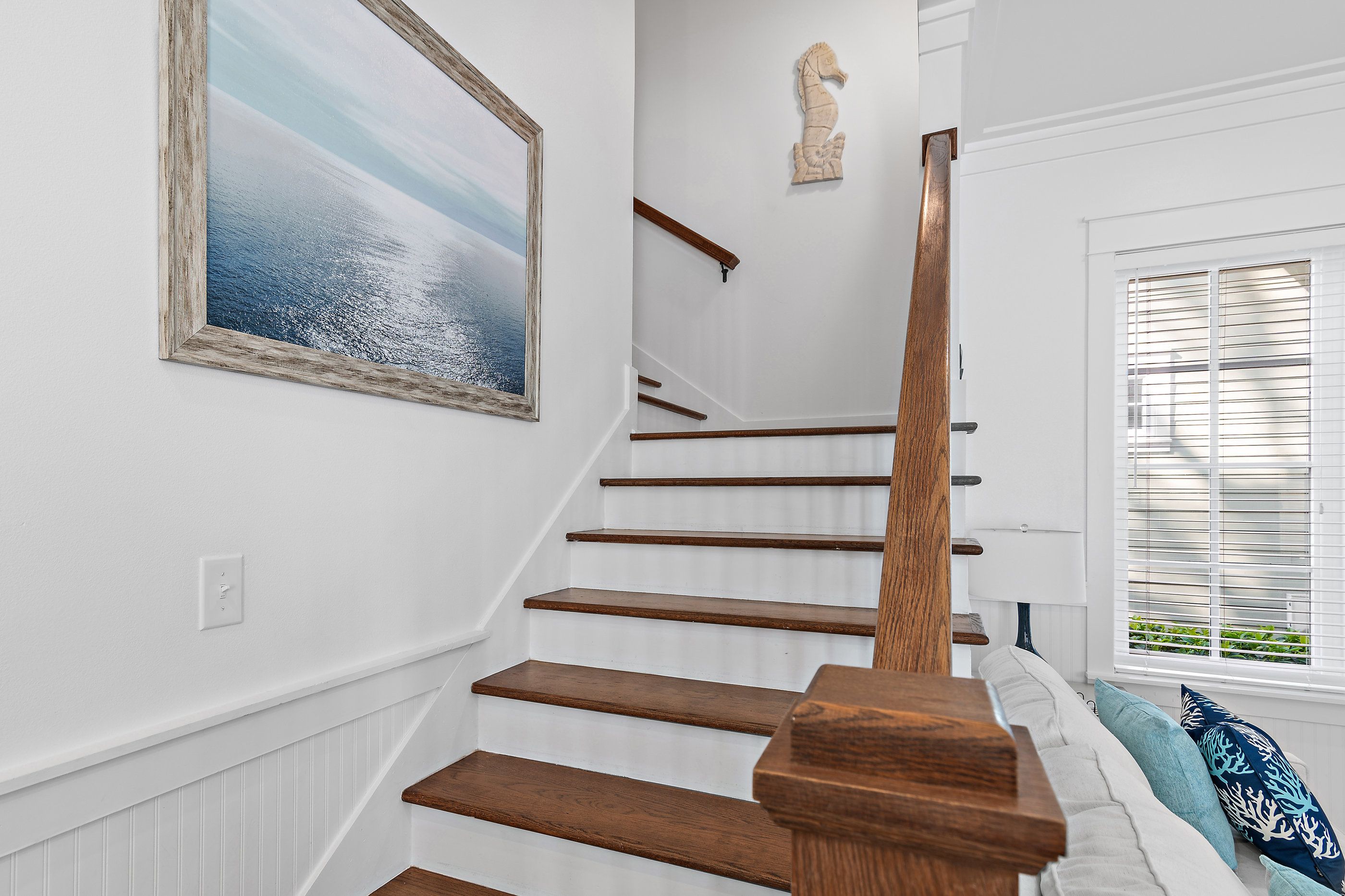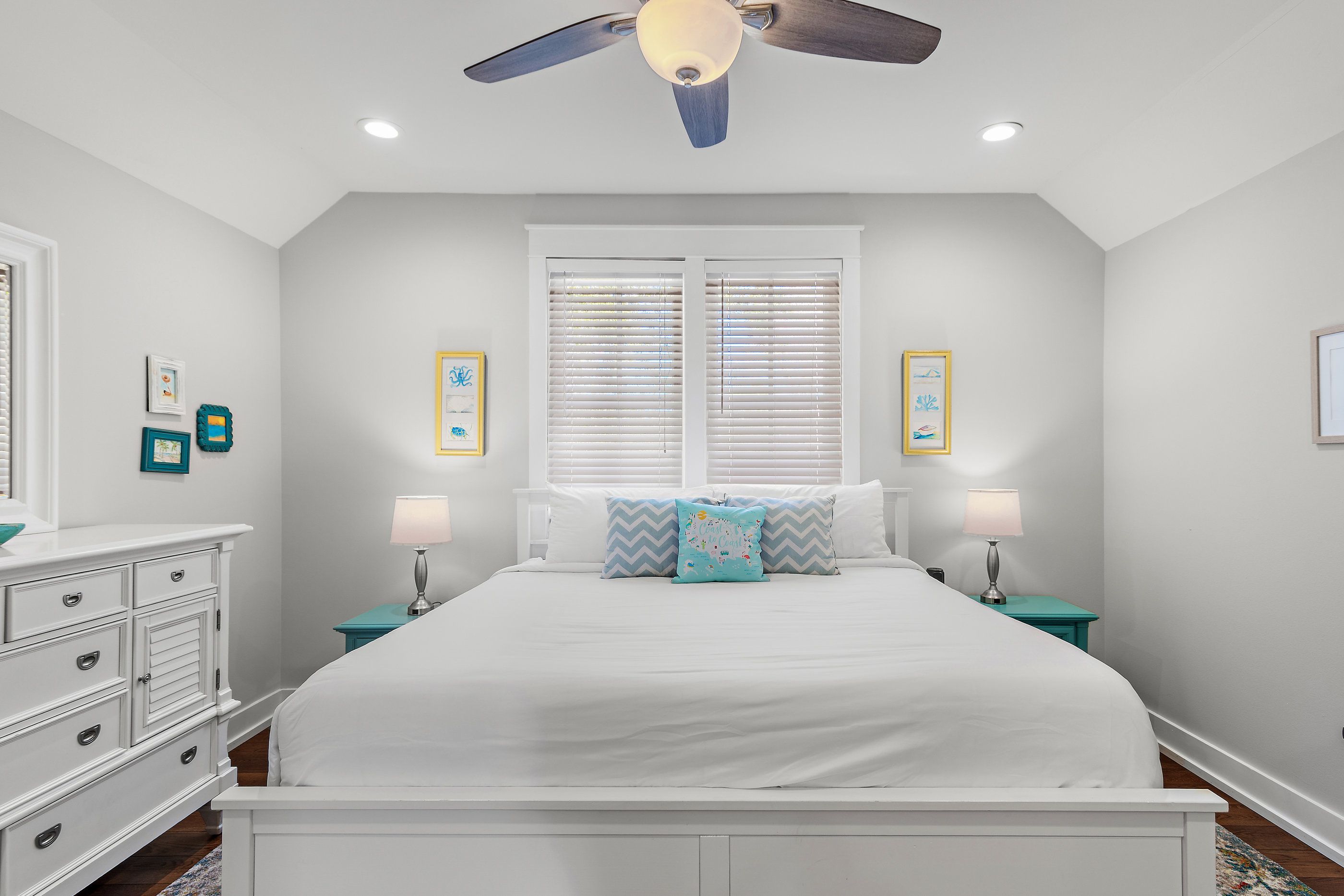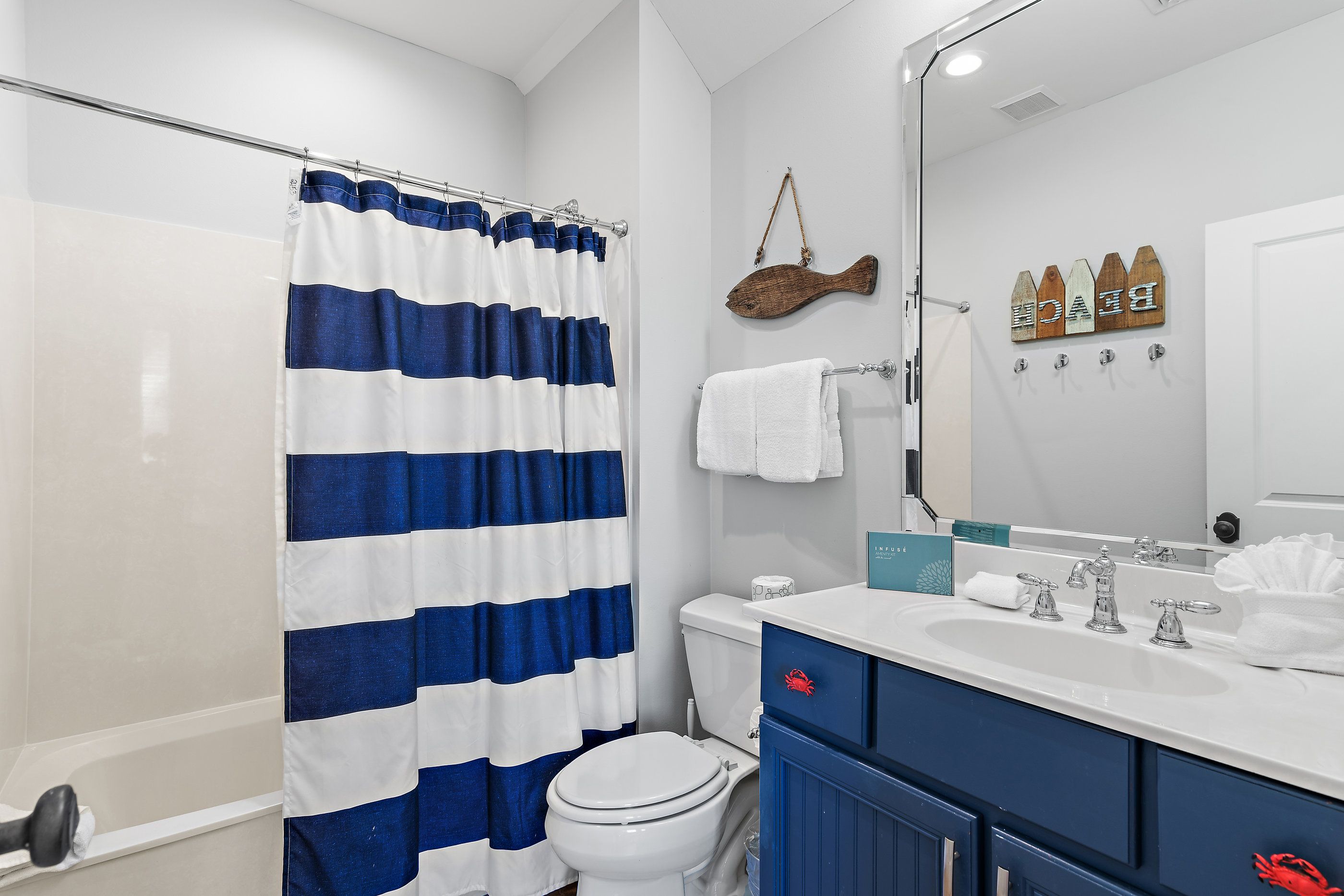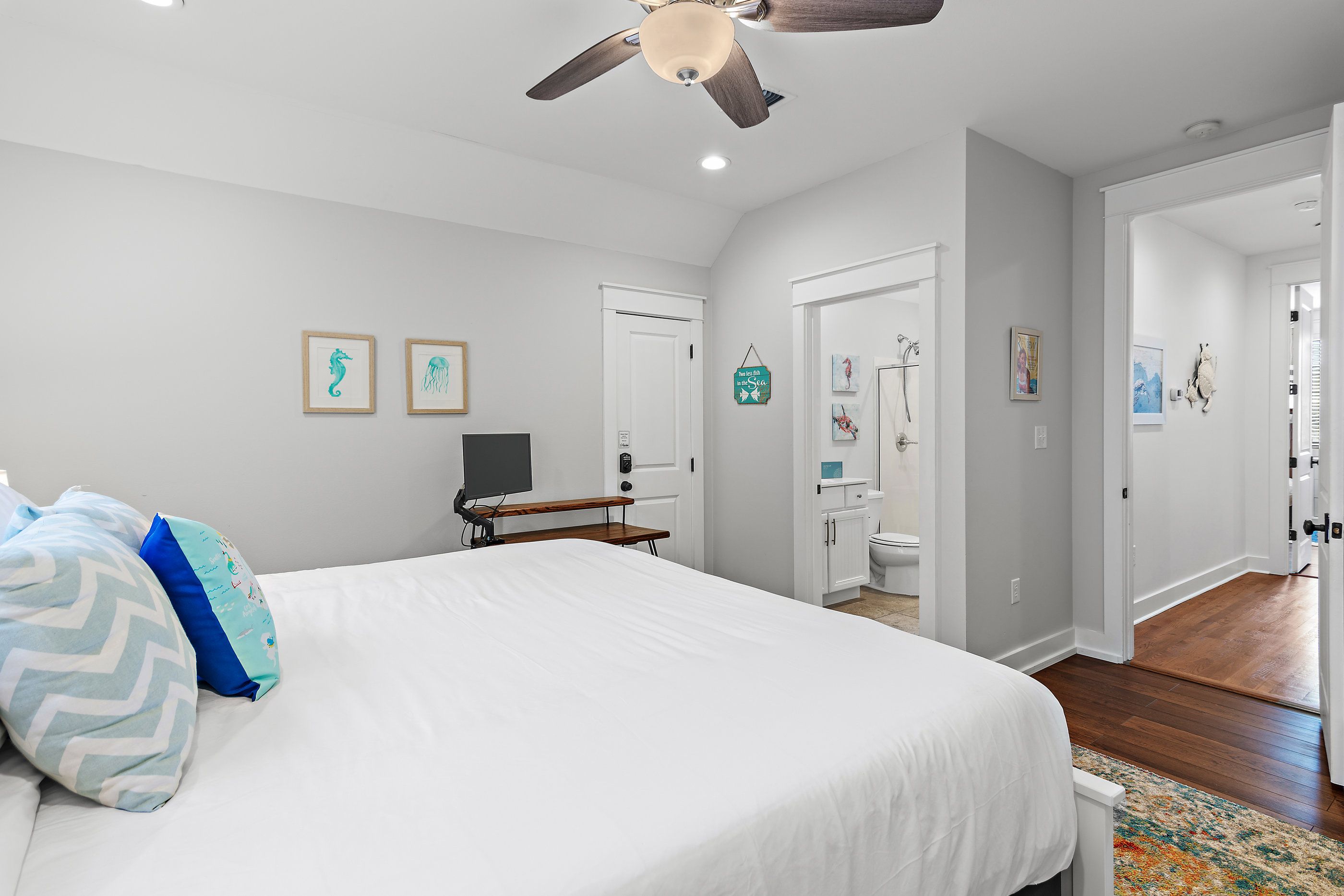 The master suite on the first floor is a plush sanctuary of relaxation, light and airy with crisp white linens and coastal furniture, featuring a spacious bathroom with a double vanity and an oversized walk-in shower, and complemented by a large closet for all your seaside attire. Ascend to the second floor to discover two guest bedrooms, each boasting its own en-suite bathroom for ultimate privacy and convenience. One bedroom offers a luxurious king-sized bed, while the other delights with custom-built, full-over-full bunk beds—comfortable for guests for all ages.
