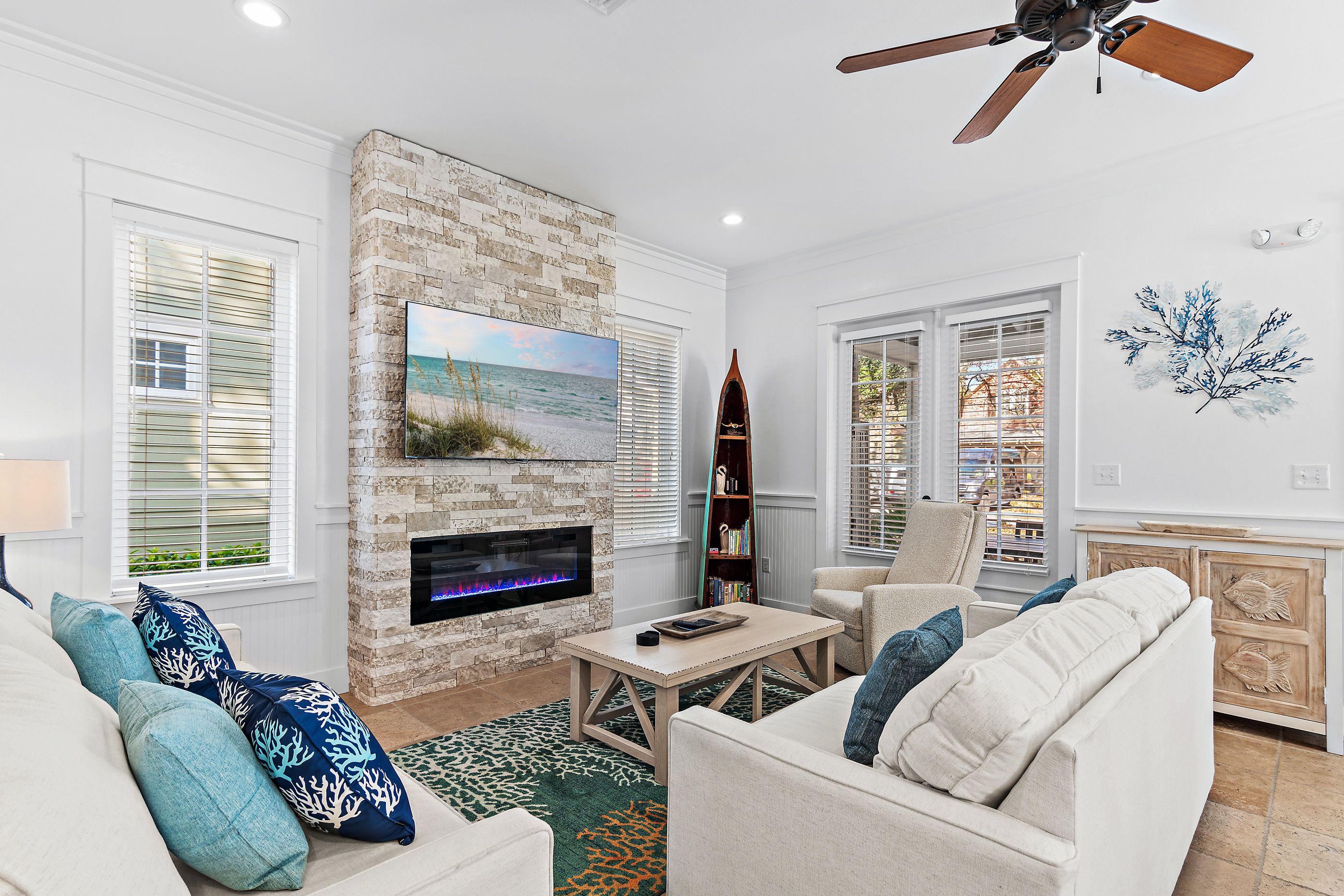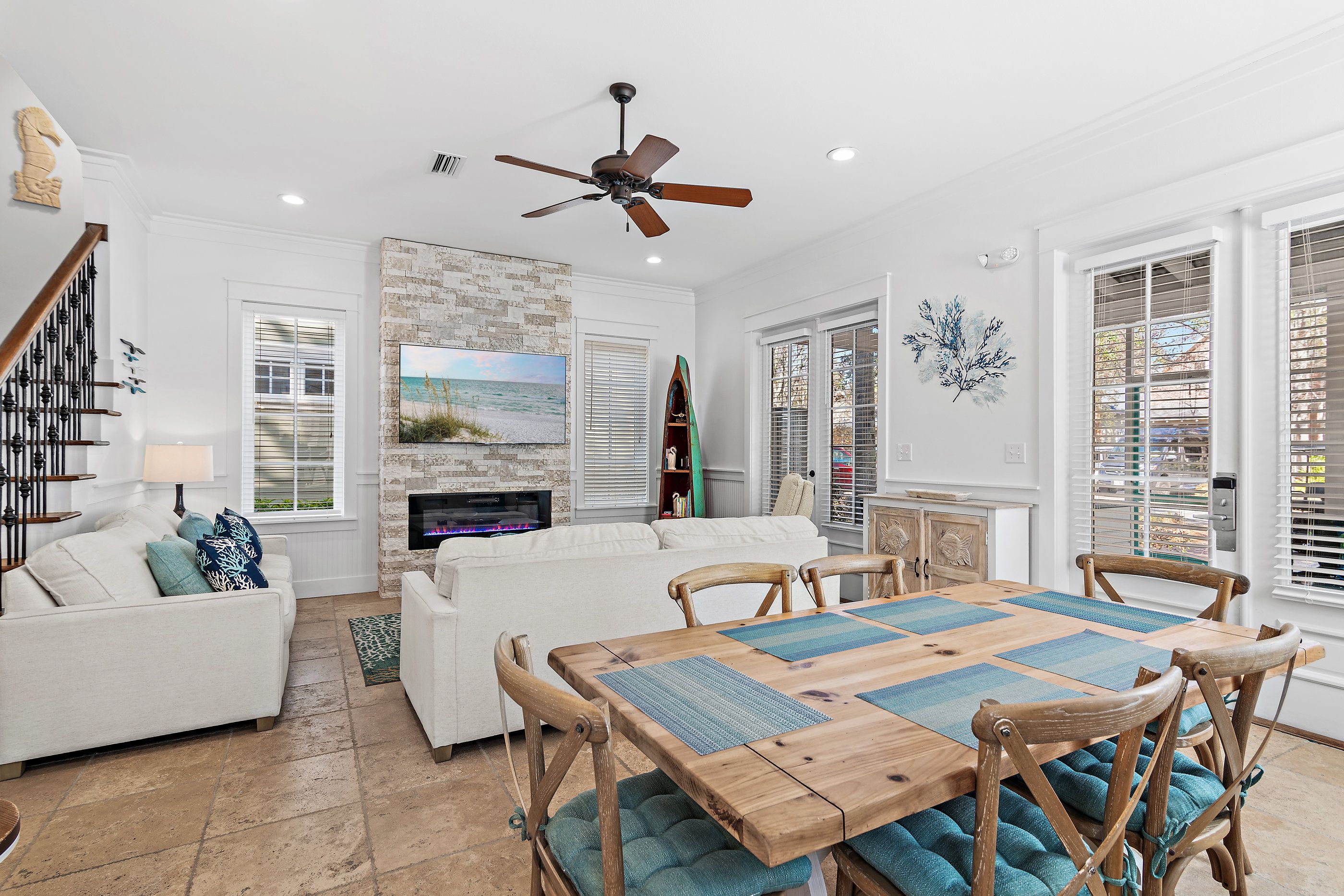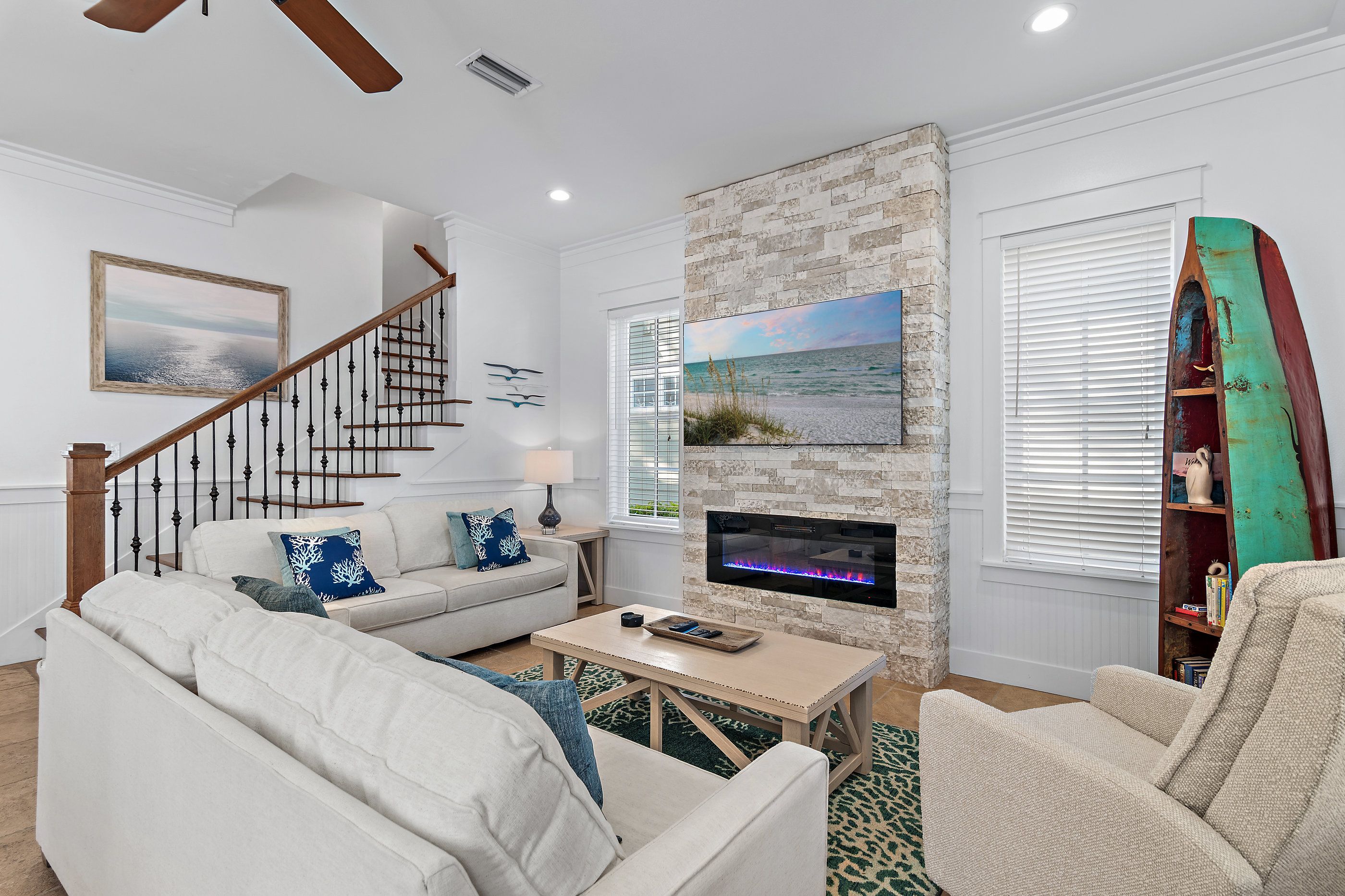 A private paver driveway leads you to a large welcoming screened front porch adorned with plush lounge seating and a dining table and chairs for balmy summer dining al fresco. Stepping inside, the ground floor unfolds into an open-concept living area where new sofas and a striking floor-to-ceiling fireplace wall create a warm and inviting atmosphere. The adjacent kitchen has been thoughtfully updated to include all modern conveniences. Thoughtful coastal charm is seen throughout, in furnishings, art, and decor.