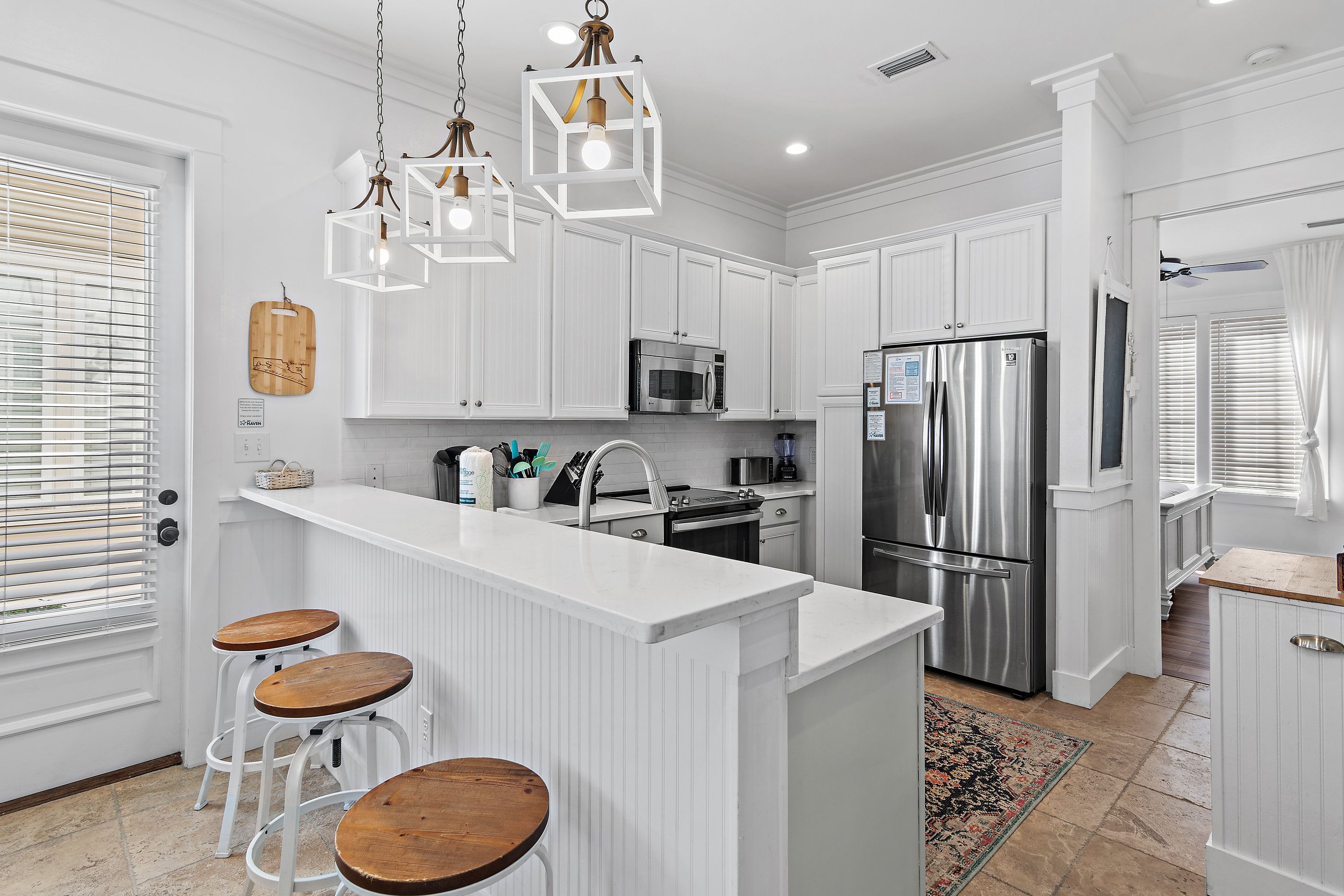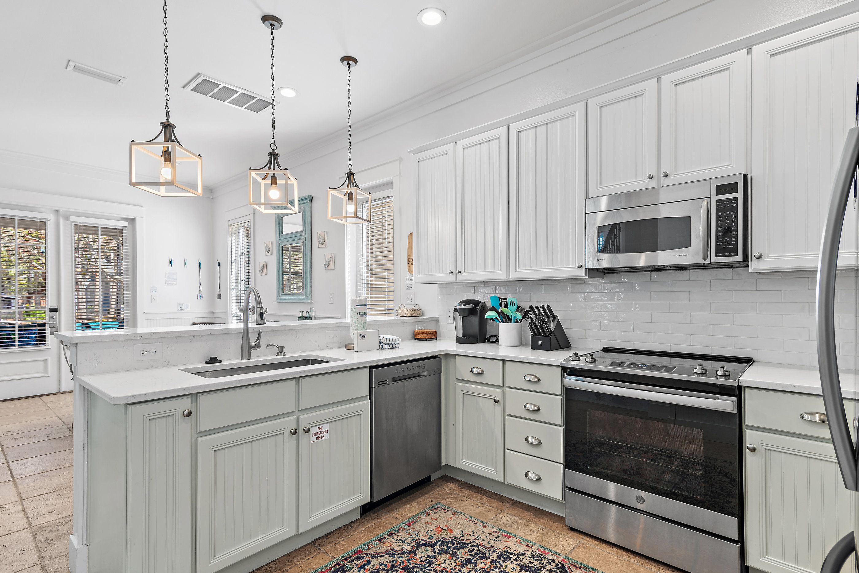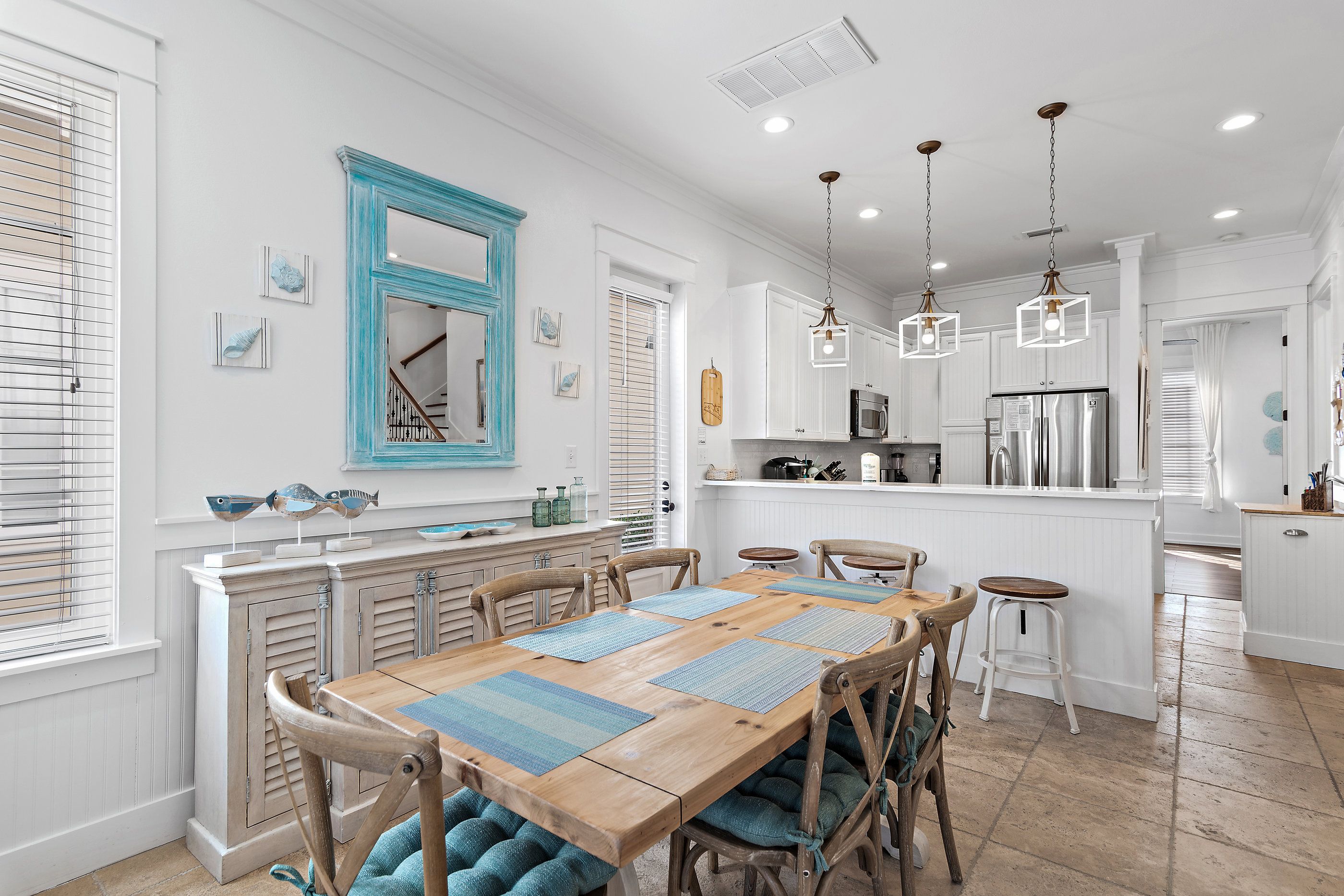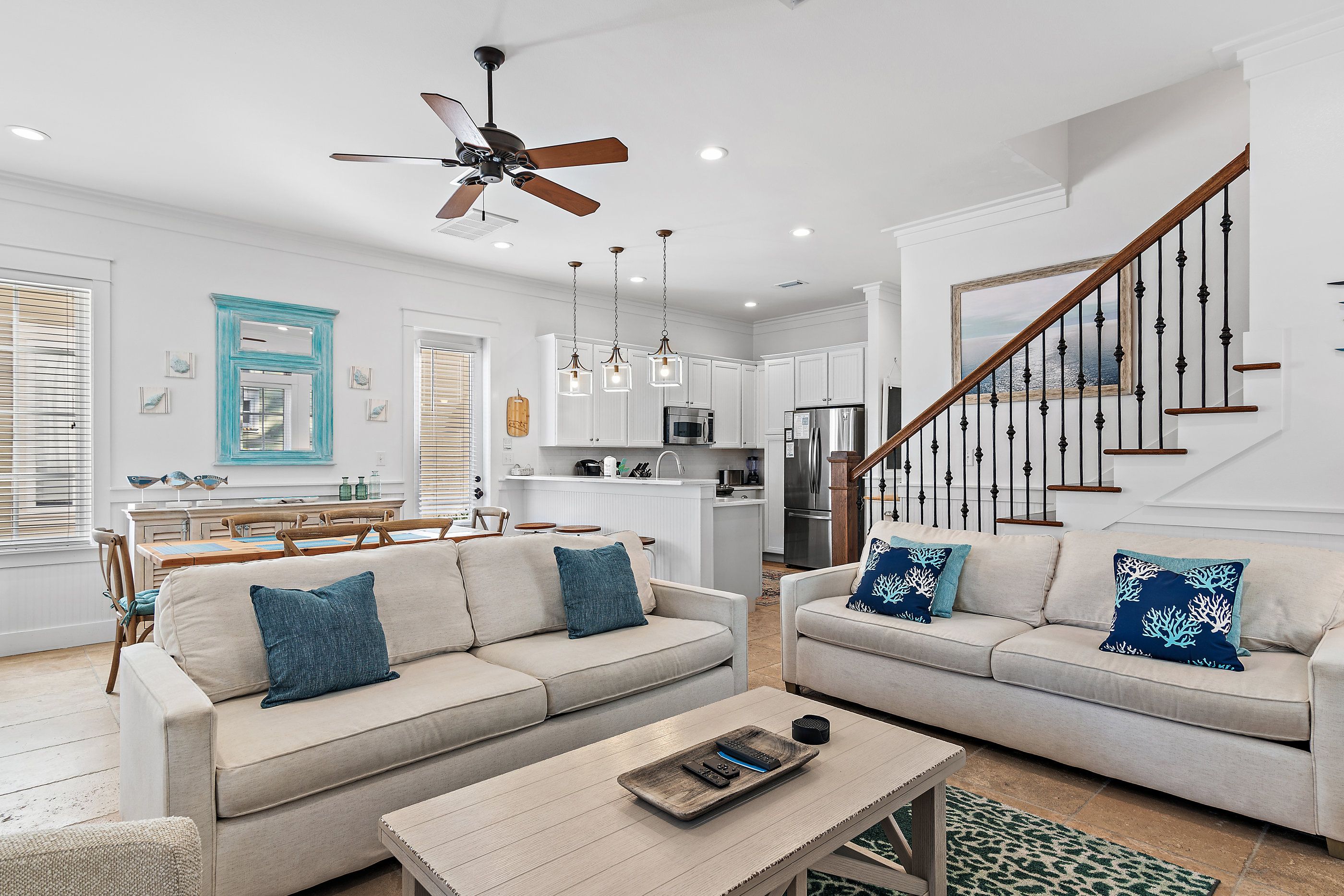 A private paver driveway leads you to a large welcoming screened front porch adorned with plush lounge seating and a dining table and chairs for balmy summer dining al fresco. Stepping inside, the ground floor unfolds into an open-concept living area where new sofas and a striking floor-to-ceiling fireplace wall create a warm and inviting atmosphere. The adjacent kitchen has been thoughtfully updated to include all modern conveniences. Thoughtful coastal charm is seen throughout, in furnishings, art, and decor.
