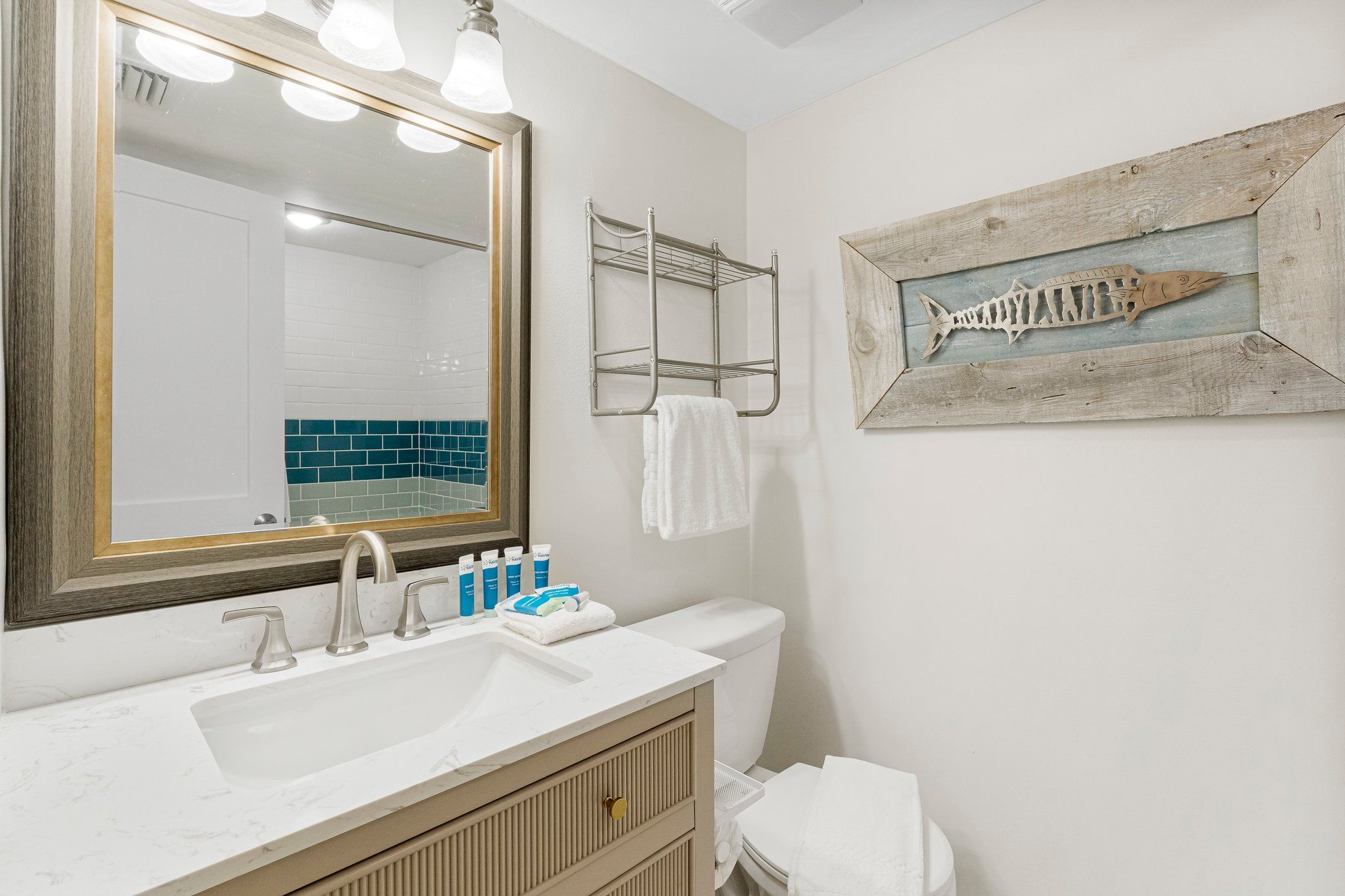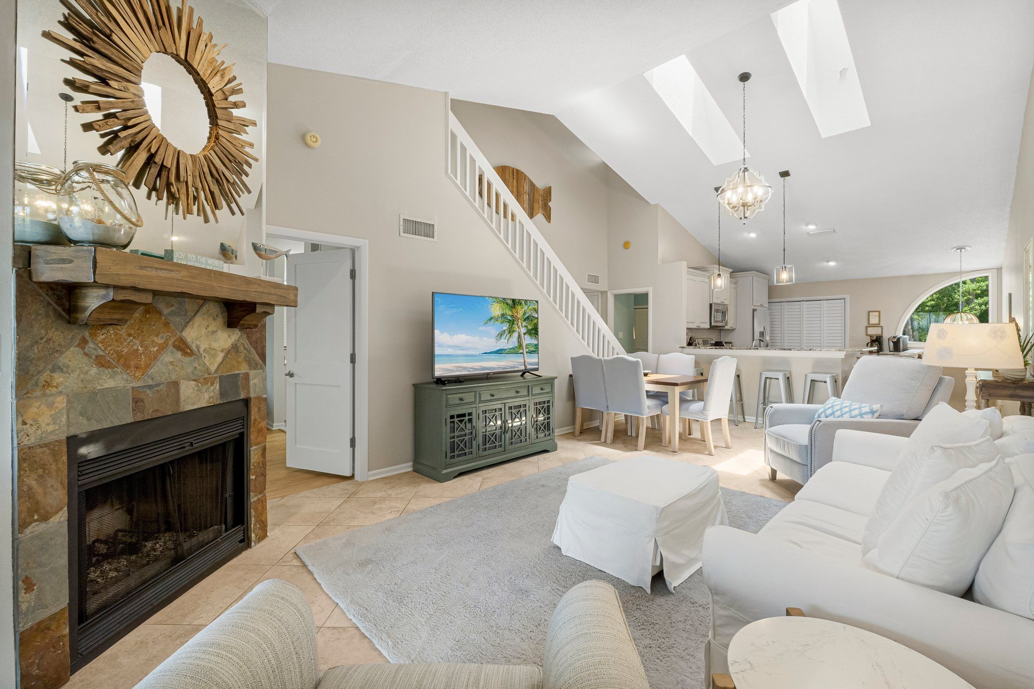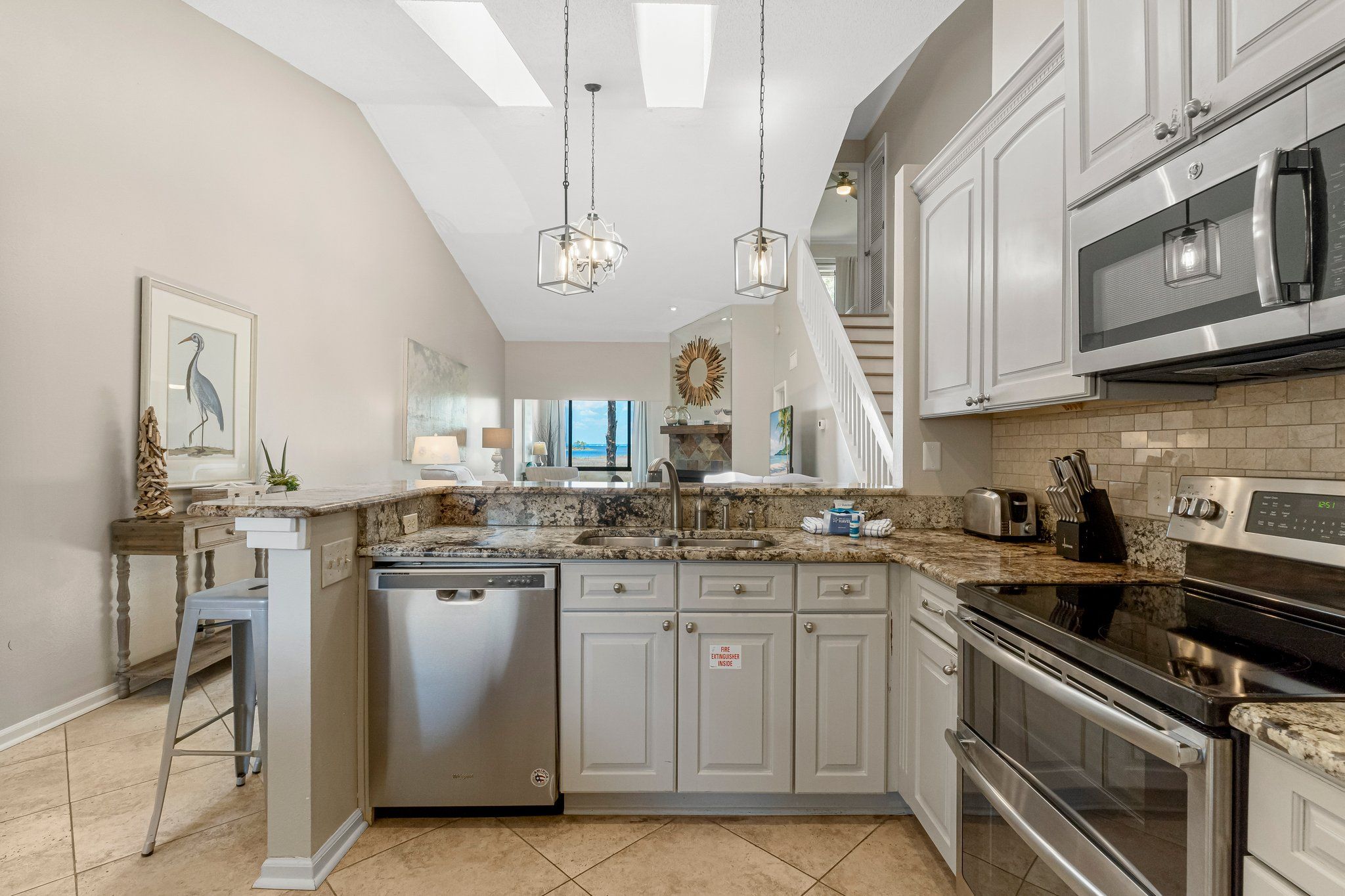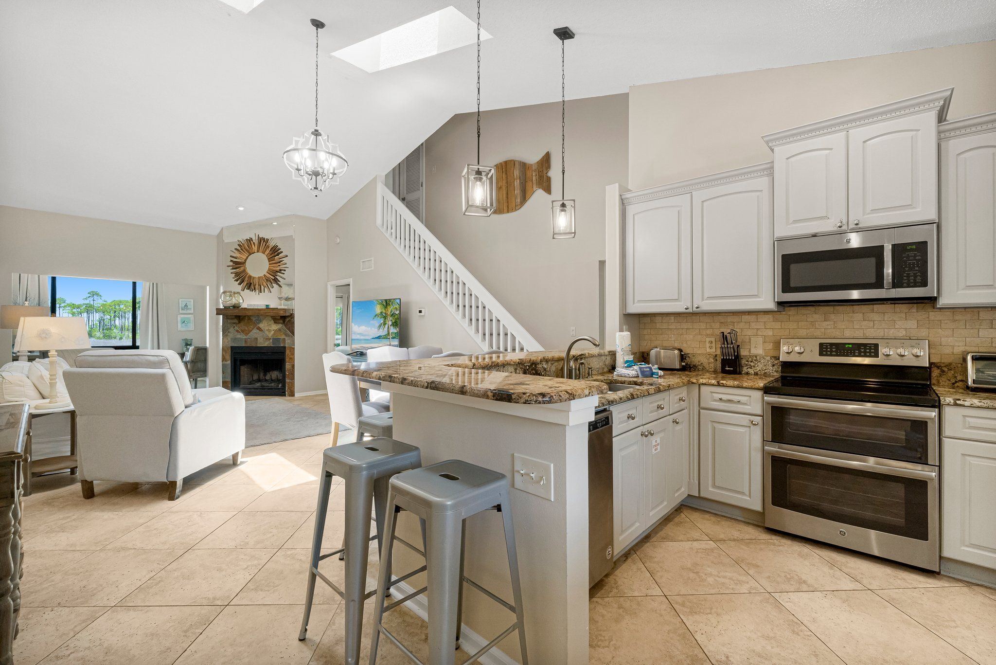This bayside rental features 3 bedrooms and 3 full baths, spanning 2 floors of beautiful space. As you walk into the unit, you’ll be greeted by neutral tones, beachy décor, tile flooring, vaulted ceilings, and modern furnishings. In the main area, you’ll find a gorgeous kitchen with stainless steel appliances, stone countertops, wine fridge, and large breakfast bar for added seating. With the dining table creating plenty of seating, this is the perfect rental for large families and friend groups looking to enjoy everything under The Sandestin® Golf and Beach Resort® sun. In this open concept space, you’ll also find the living room with flat screen TV, working fireplace, and separate sunroom with picturesque views of the bay.