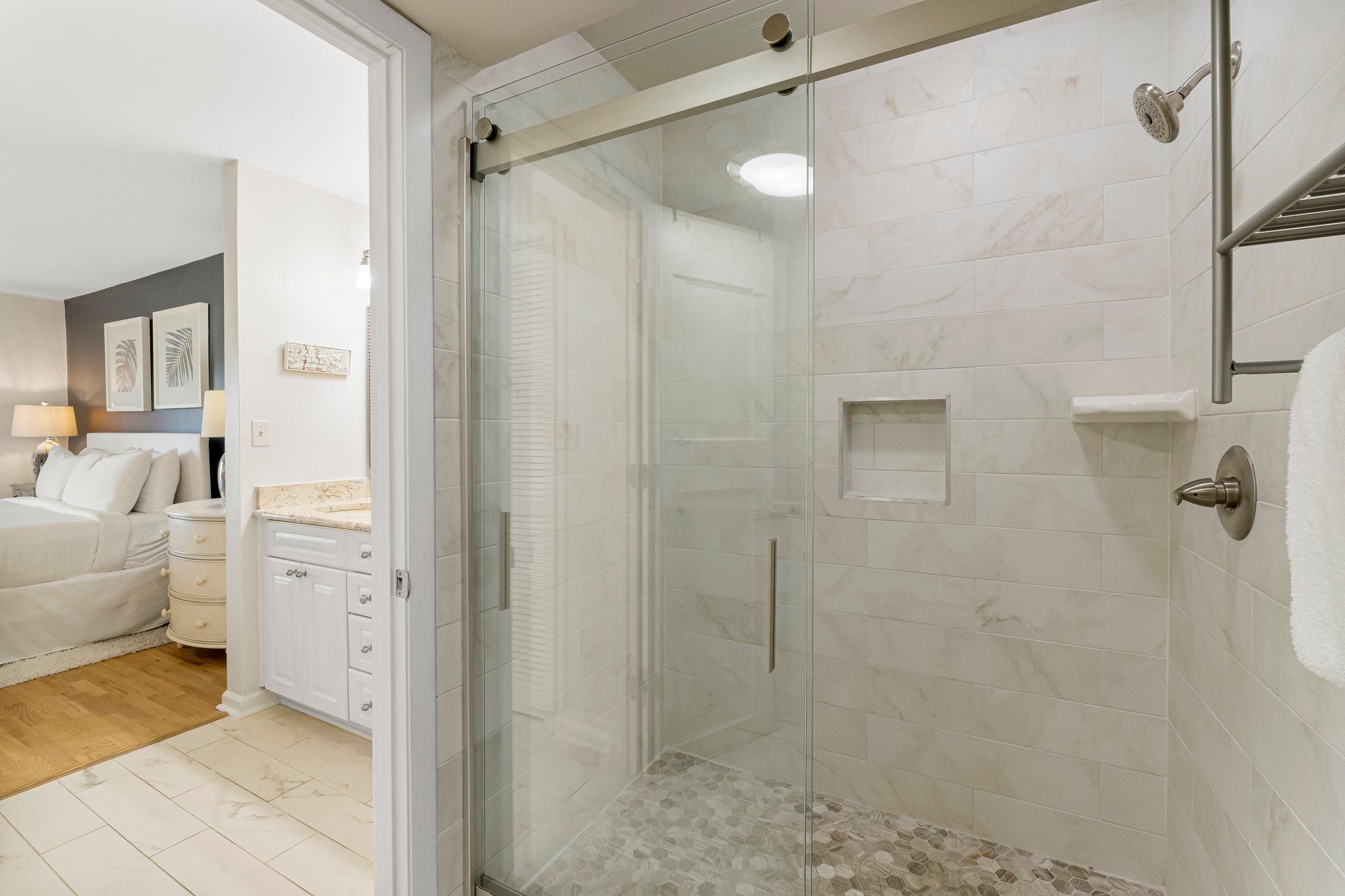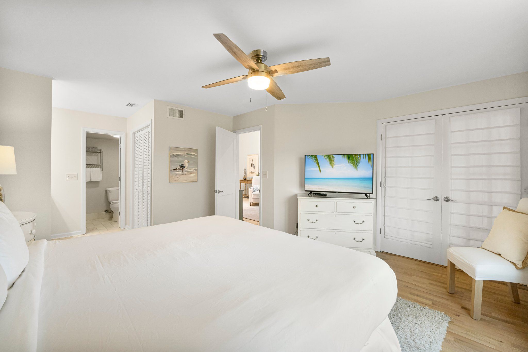When it comes to sleeping, this bayside gem offers 3 bedrooms with hardwood floors spanning over 2 floors of space. On the first floor, you’ll find a master bedroom featuring king bed, flat screen TV, oversized window with views of the bay, and ensuite bath with double vanity sinks and tiled walk-in shower. You’ll also find a guest bedroom with queen bed and flat screen TV. The second floor houses another master bedroom with king bed, flat screen TV, the same great views, and another spacious ensuite bath. Sleeping up to 6 comfortably with a third full bath in the first floor hall, everyone will have the space they need to rest and relax.