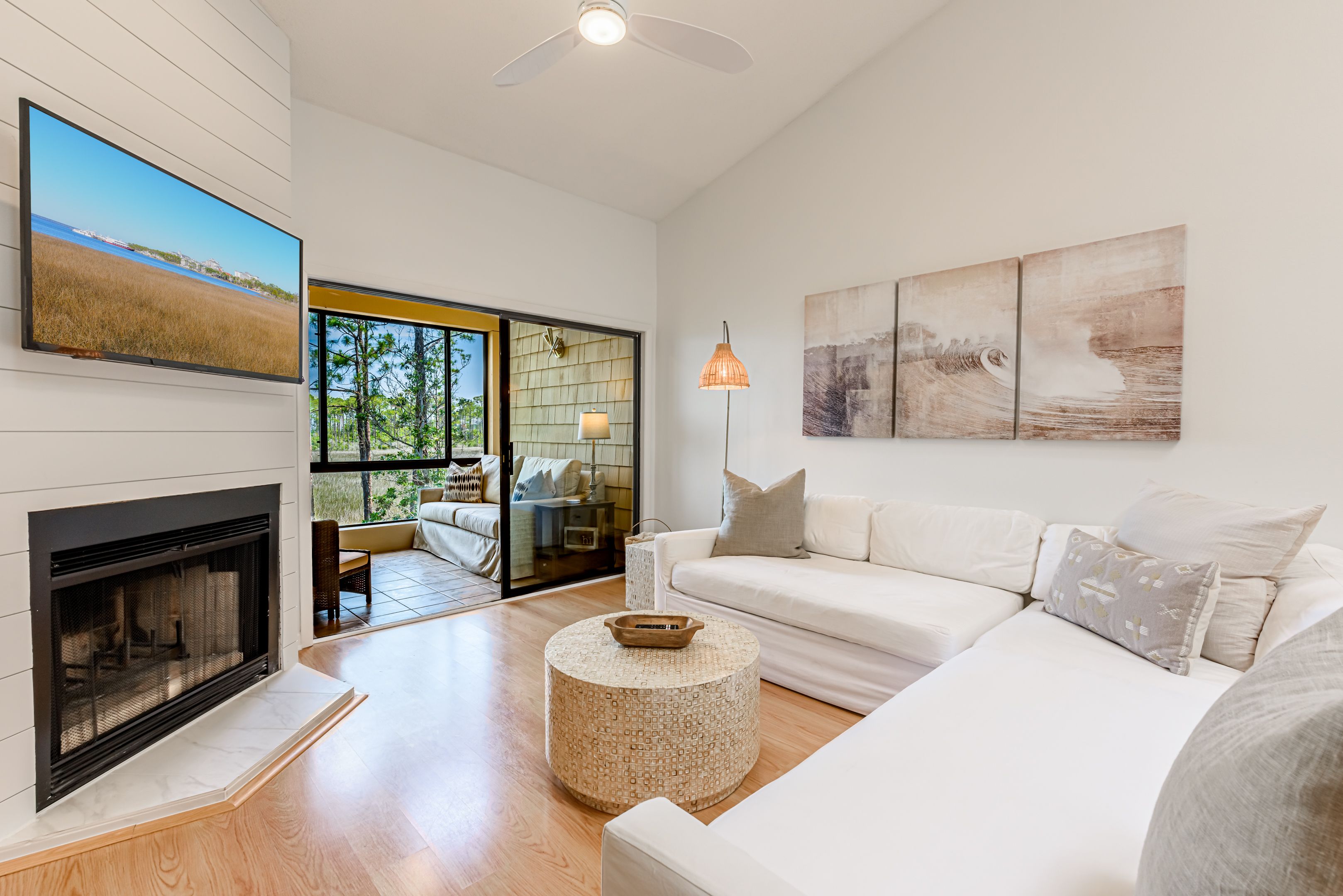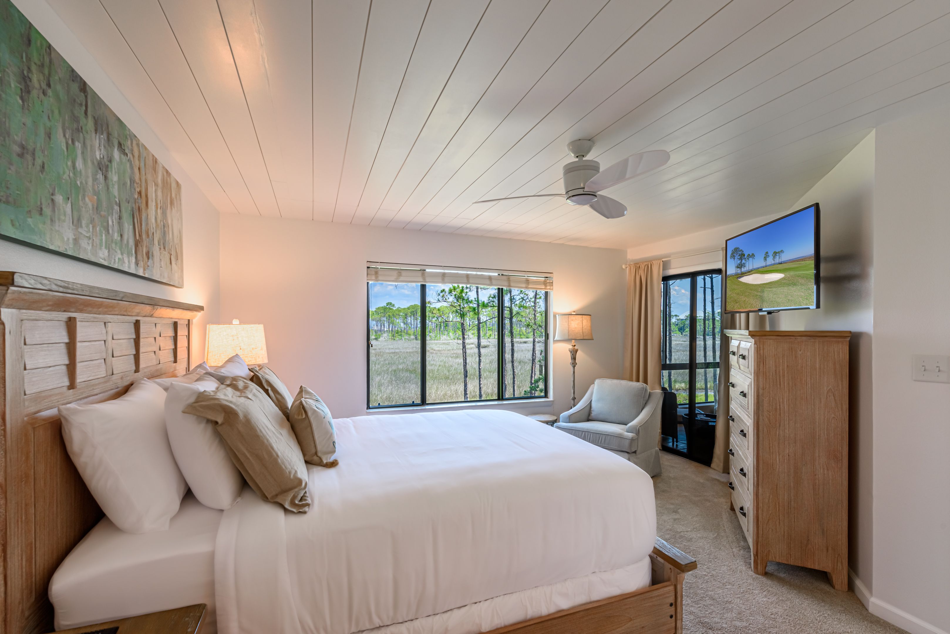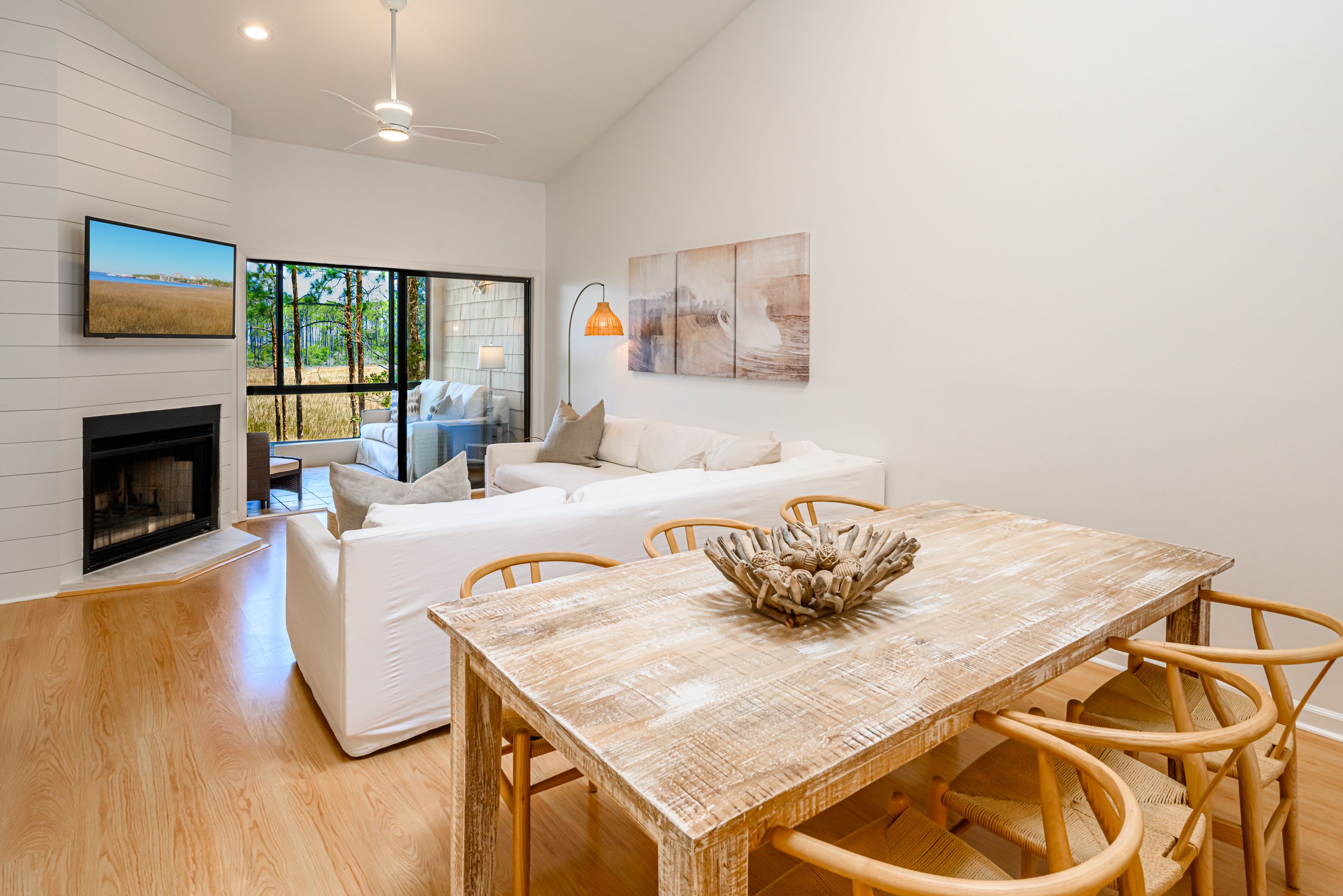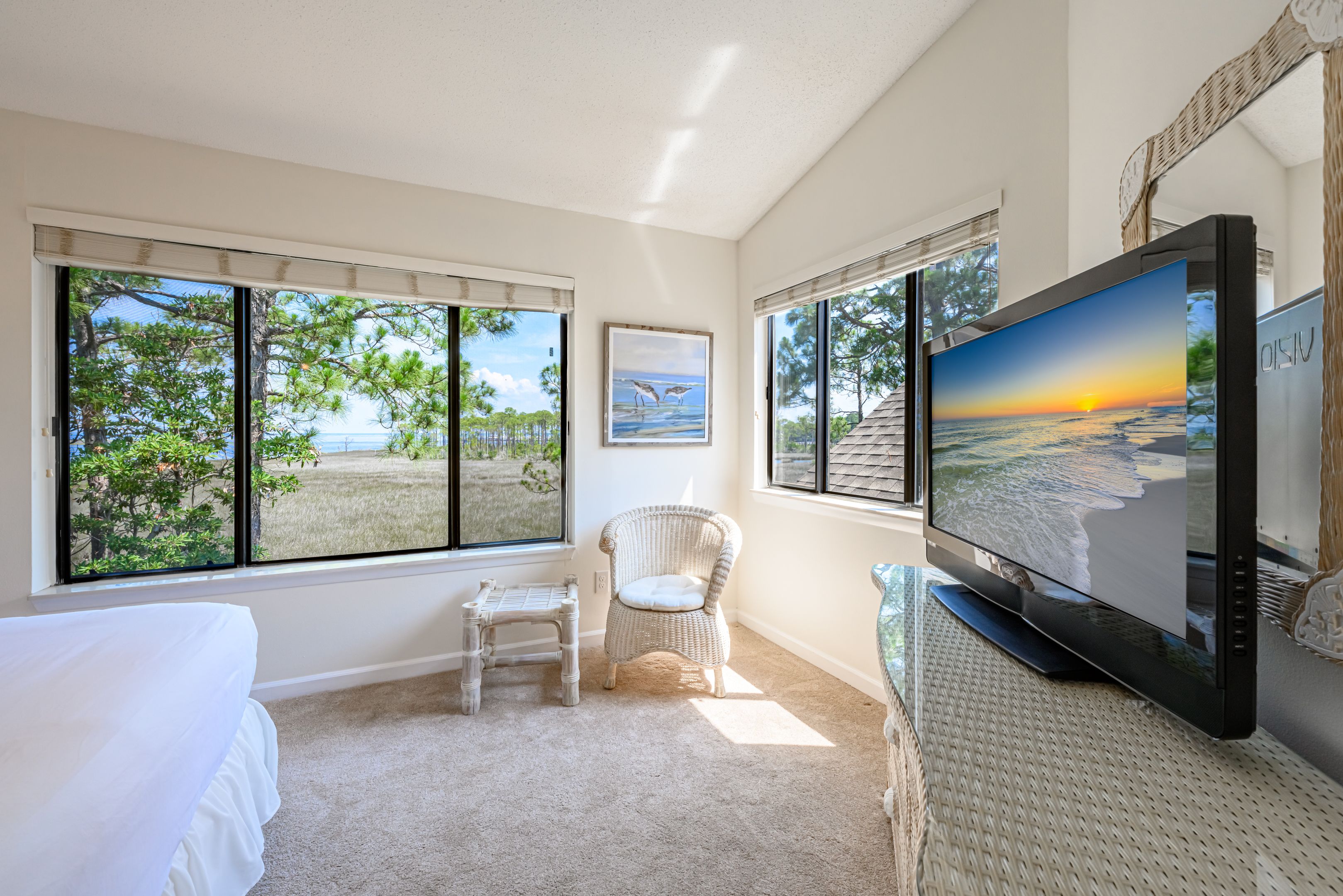Unit 8971 is a two story townhome decorated in light colors, shiplap walls, and features vaulted ceilings. The main living space is located on the first floor (requires stair access) and features a full kitchen with stainless steel appliances, stone countertop, white cabinetry, and a breakfast bar for added seating. From here, make your way into the dining area with rustic 6-person table, great for family meals and entertaining guests. Leading from this space is the living area featuring comfy seating, flat screen TV, and fireplace. Spend your nights here relaxing in style or head out to the sunroom by day to enjoy the warm weather. You’re sure to catch some great views of wildlife in the bay!
