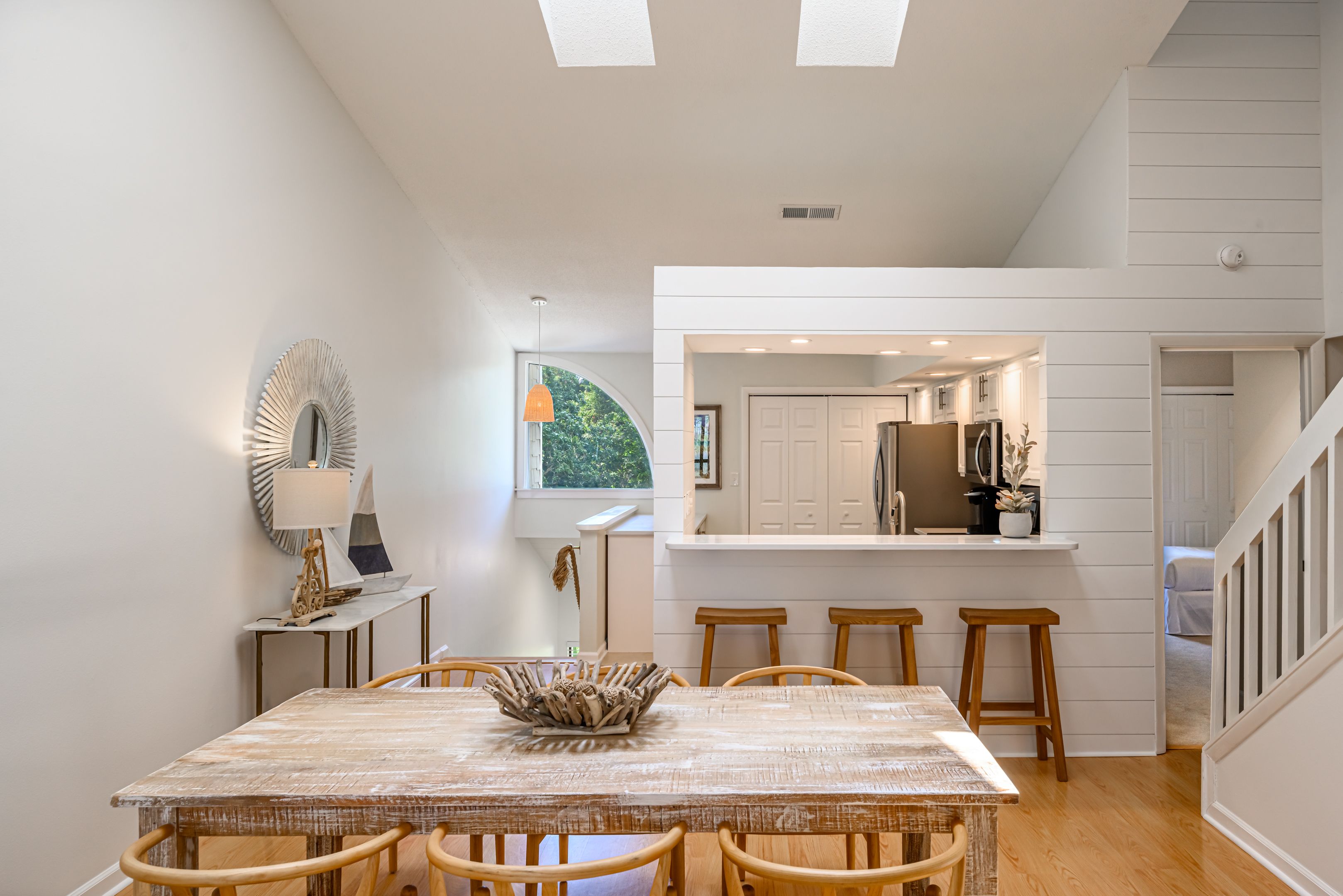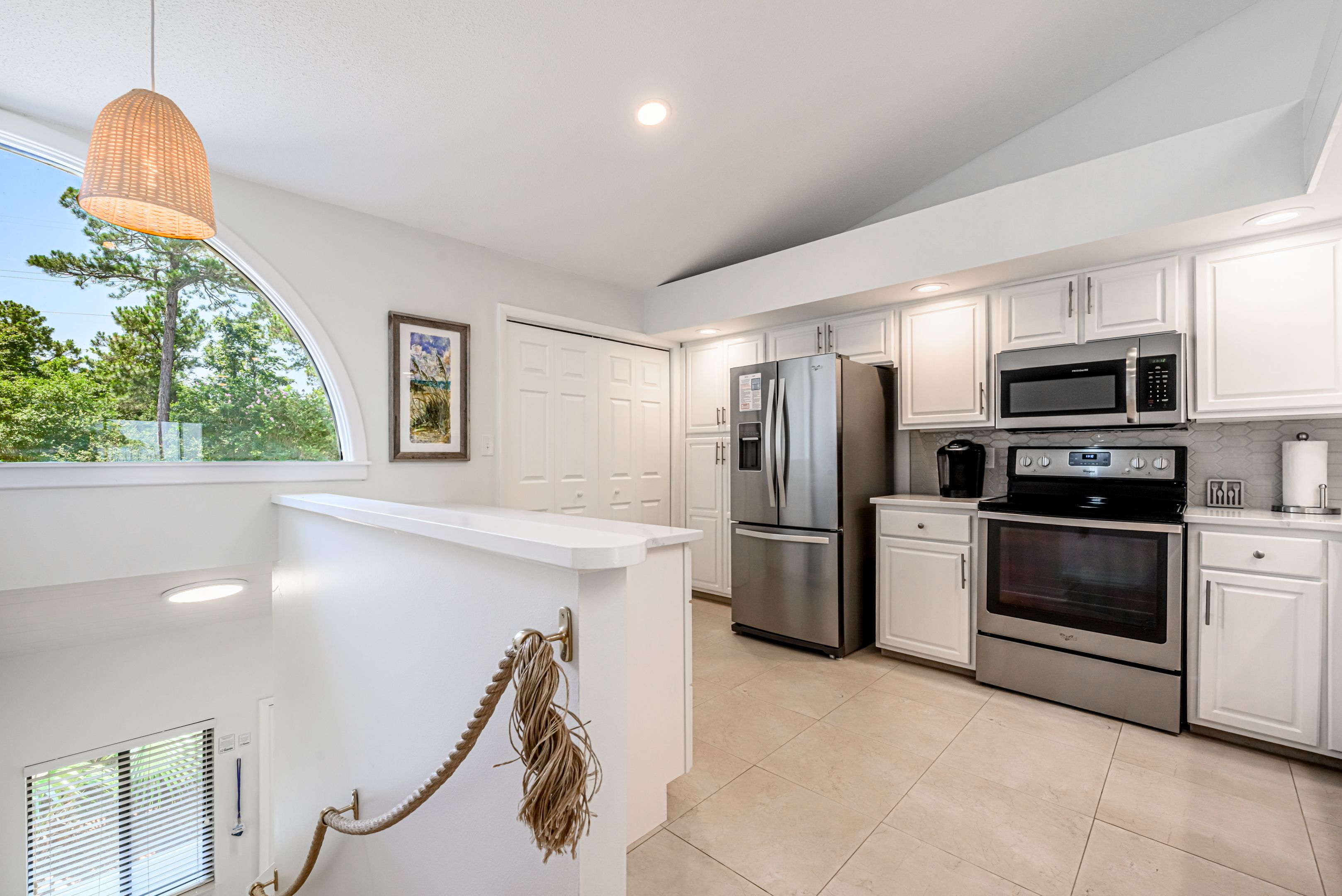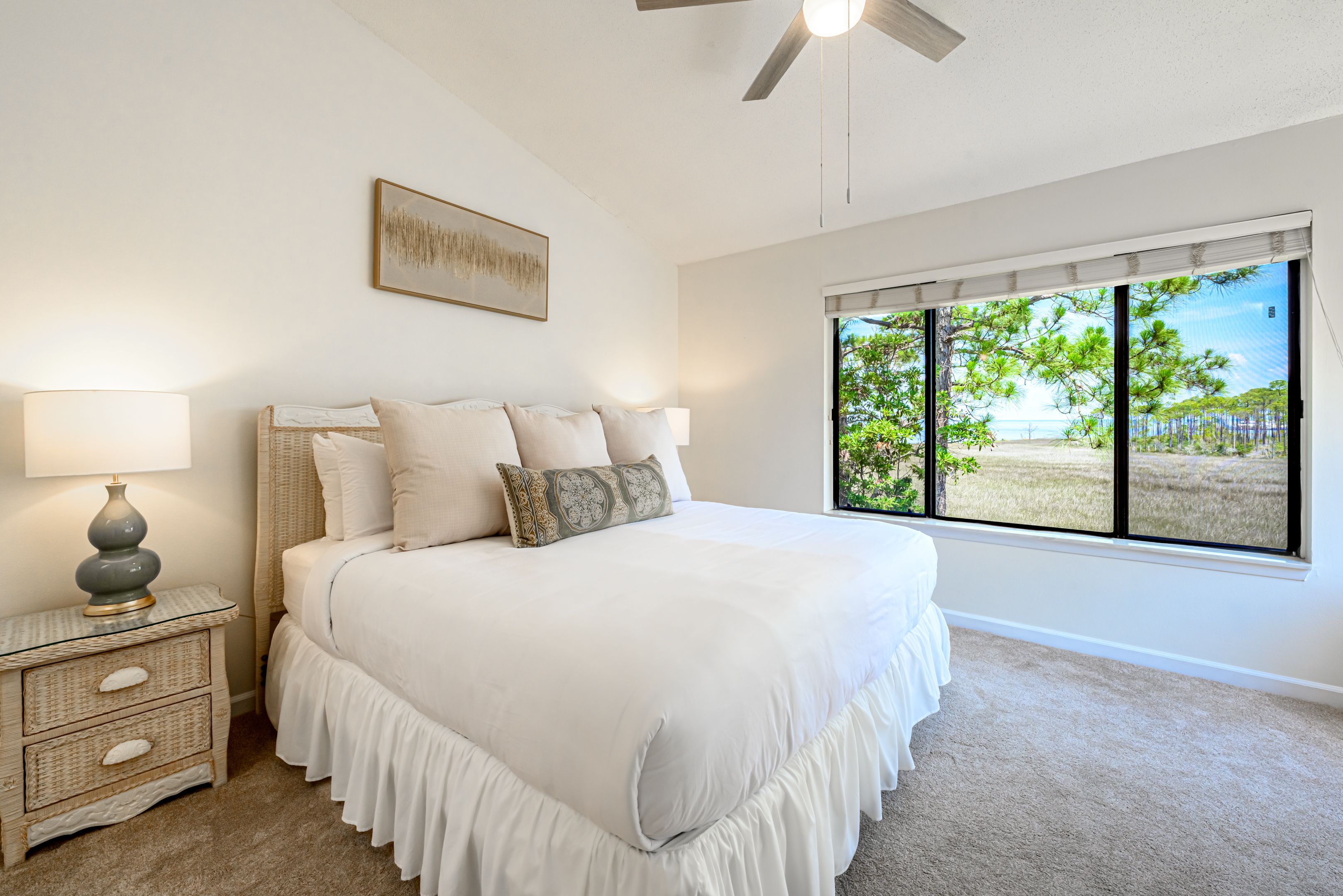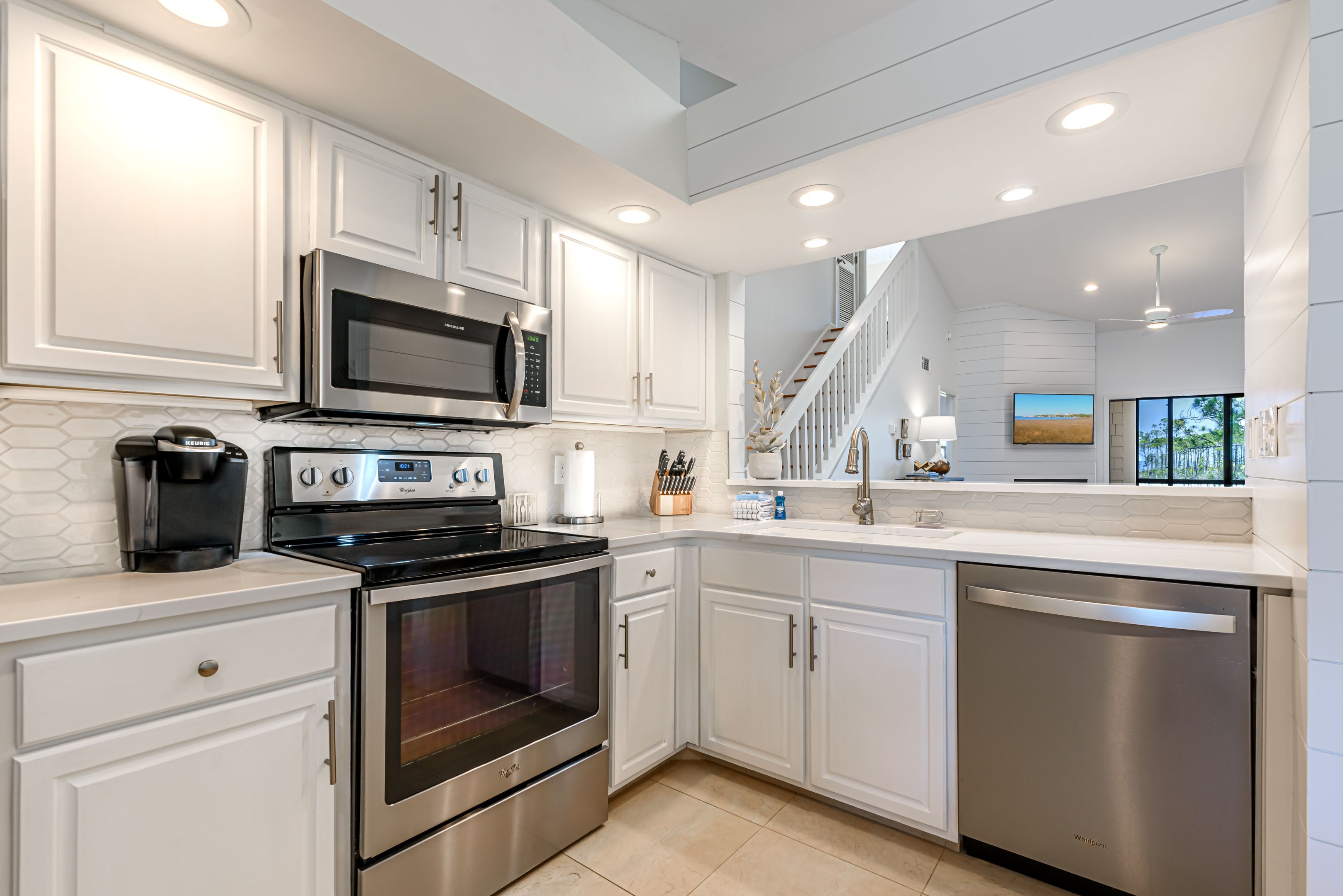 Unit 8971 is a two story townhome decorated in light colors, shiplap walls, and features vaulted ceilings. The main living space is located on the first floor (requires stair access) and features a full kitchen with stainless steel appliances, stone countertop, white cabinetry, and a breakfast bar for added seating. From here, make your way into the dining area with rustic 6-person table, great for family meals and entertaining guests. Leading from this space is the living area featuring comfy seating, flat screen TV, and fireplace. Spend your nights here relaxing in style or head out to the sunroom by day to enjoy the warm weather. You’re sure to catch some great views of wildlife in the bay!