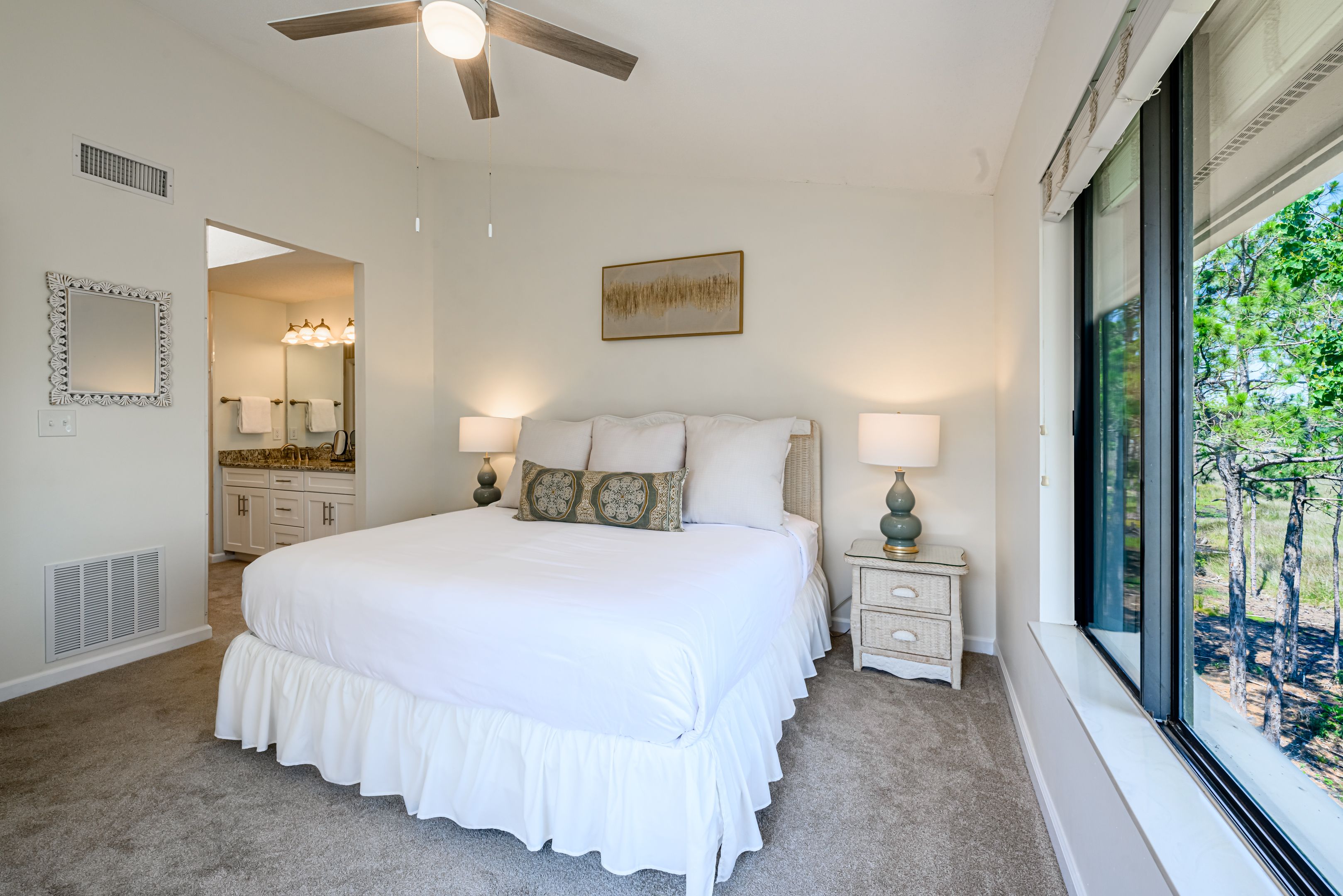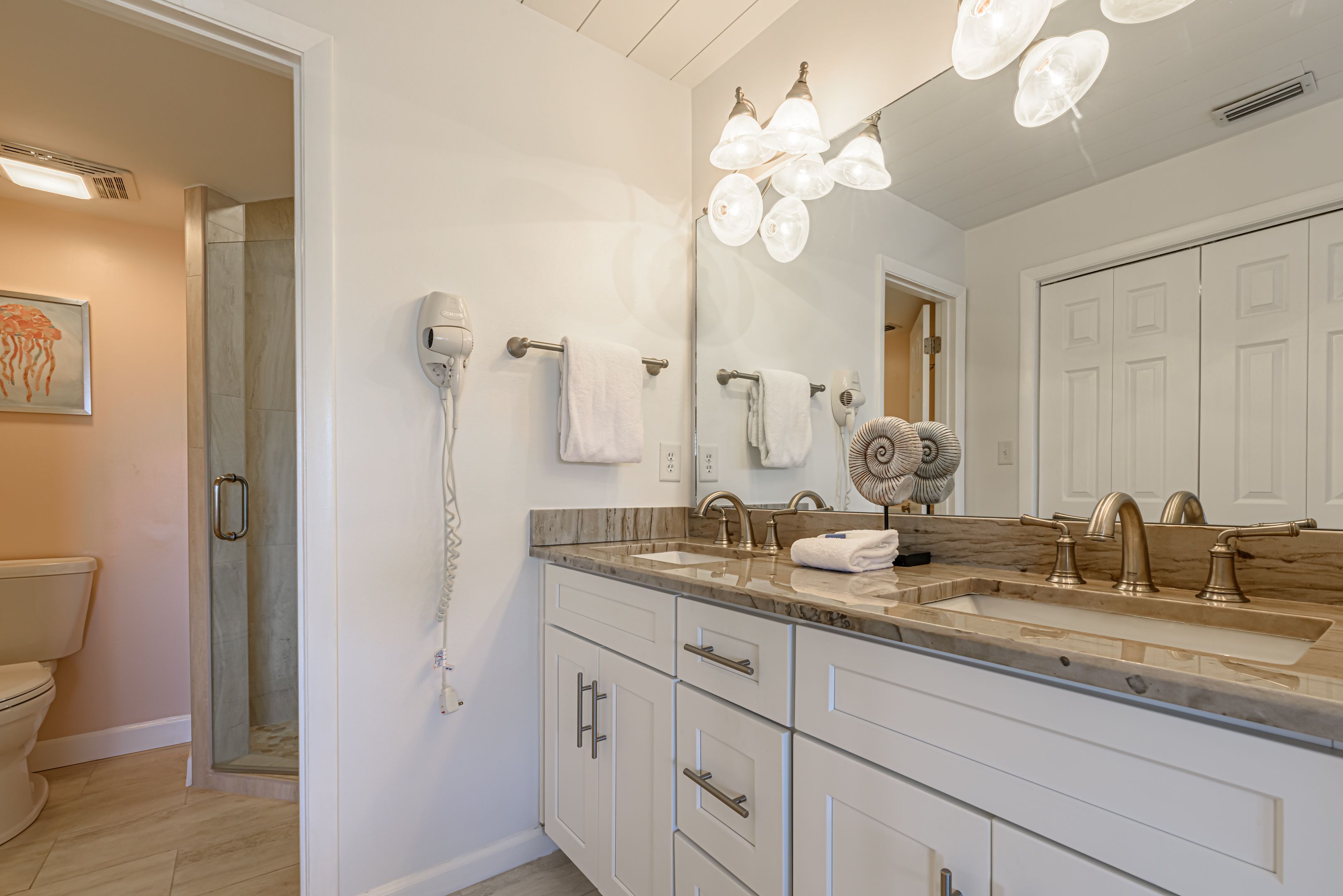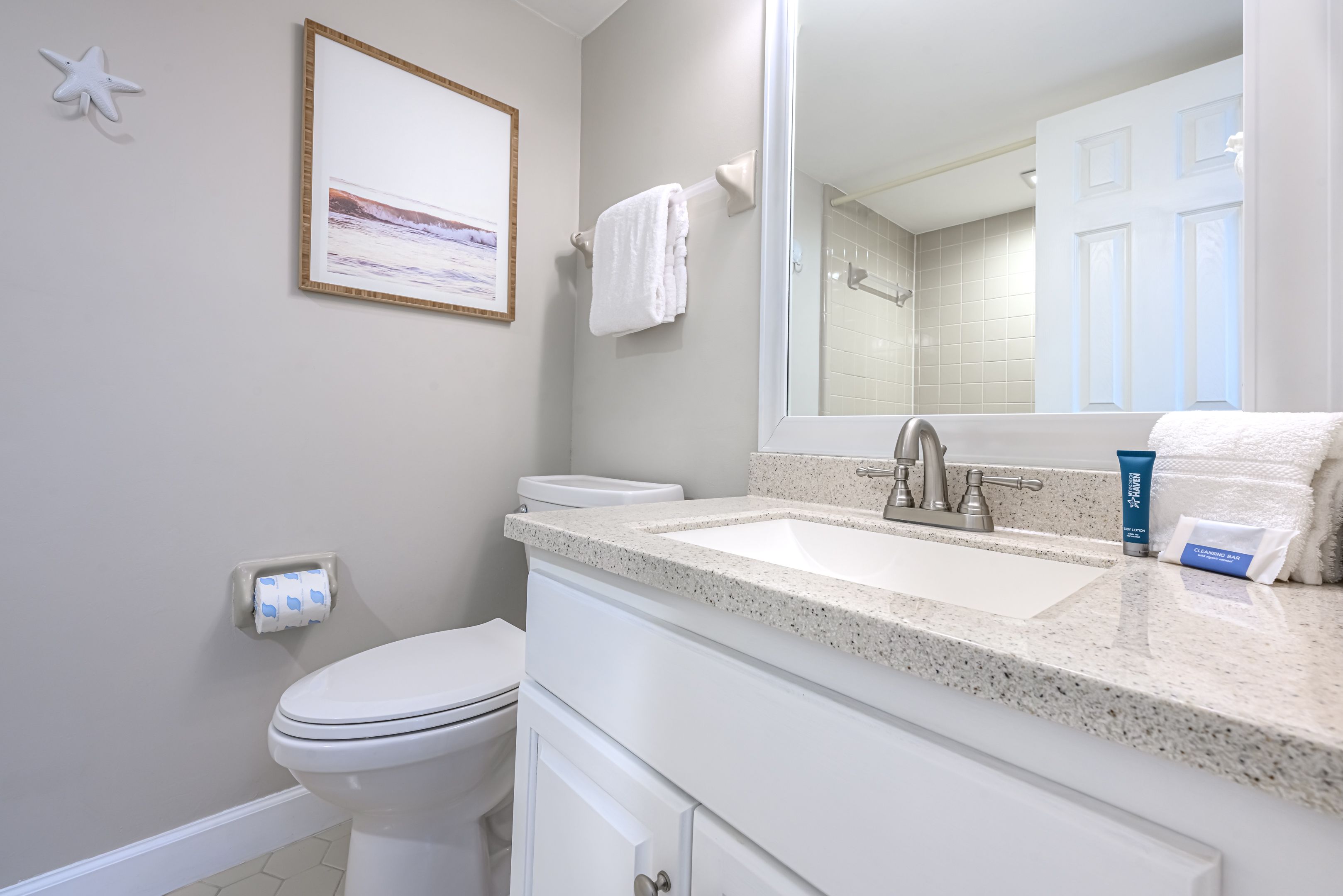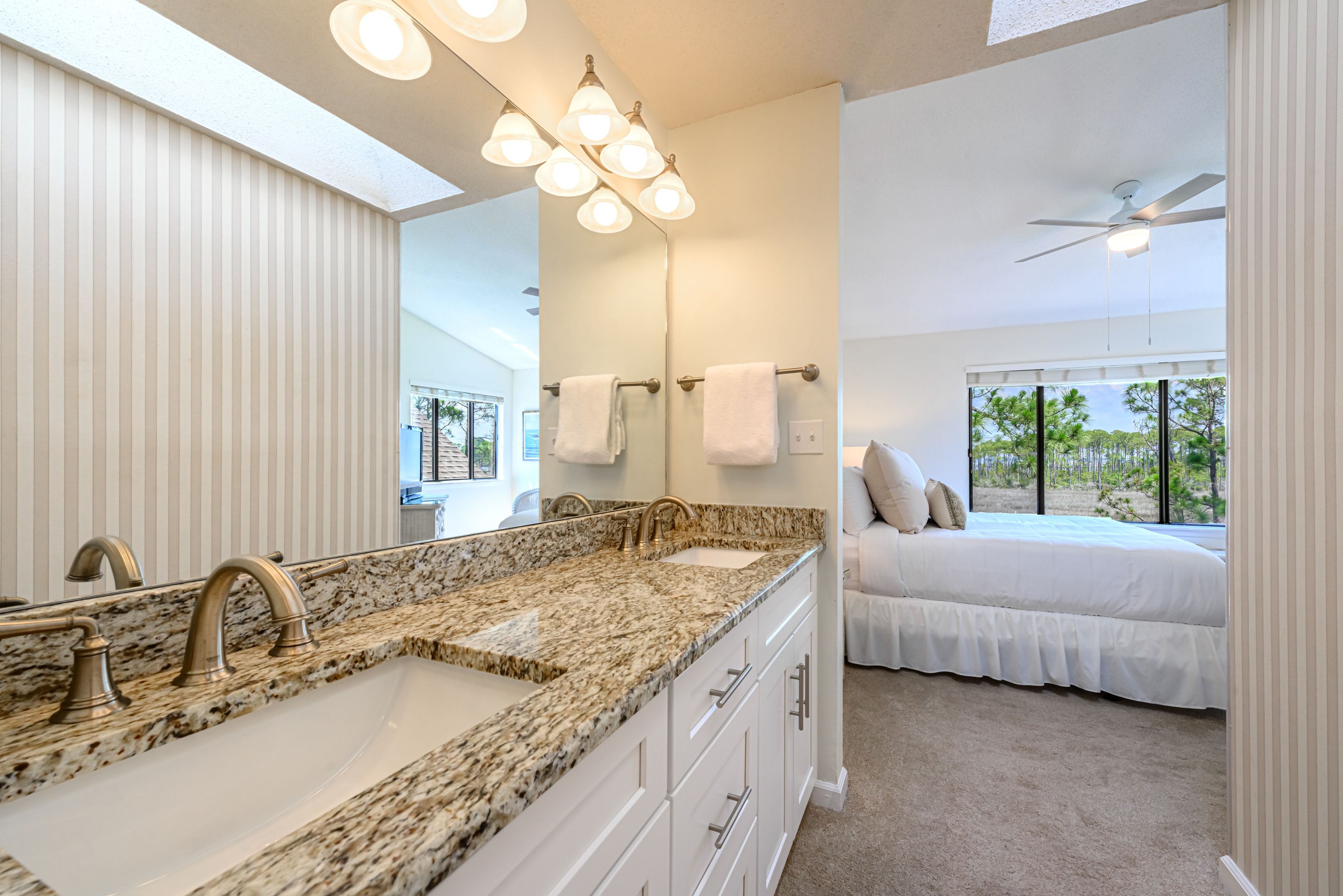 When it comes to sleeping arrangements, home can sleep up to 8 guests comfortably. On the first floor, you’ll find both guest rooms, each featuring private baths for maximum comfort. Upstairs, you’ll find the master suite with king bed, double vanity, tub/shower combo, and lots of closet space.
