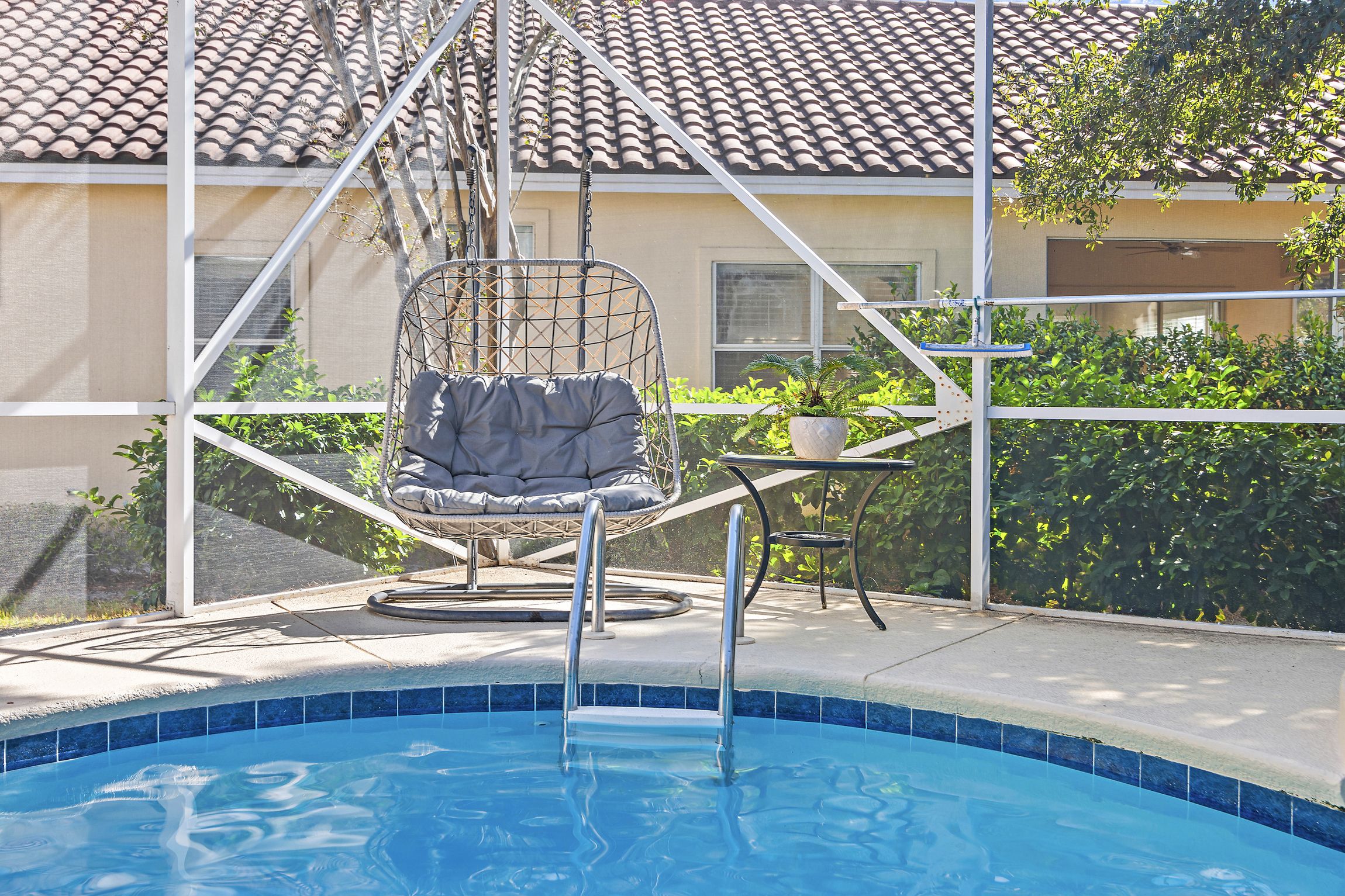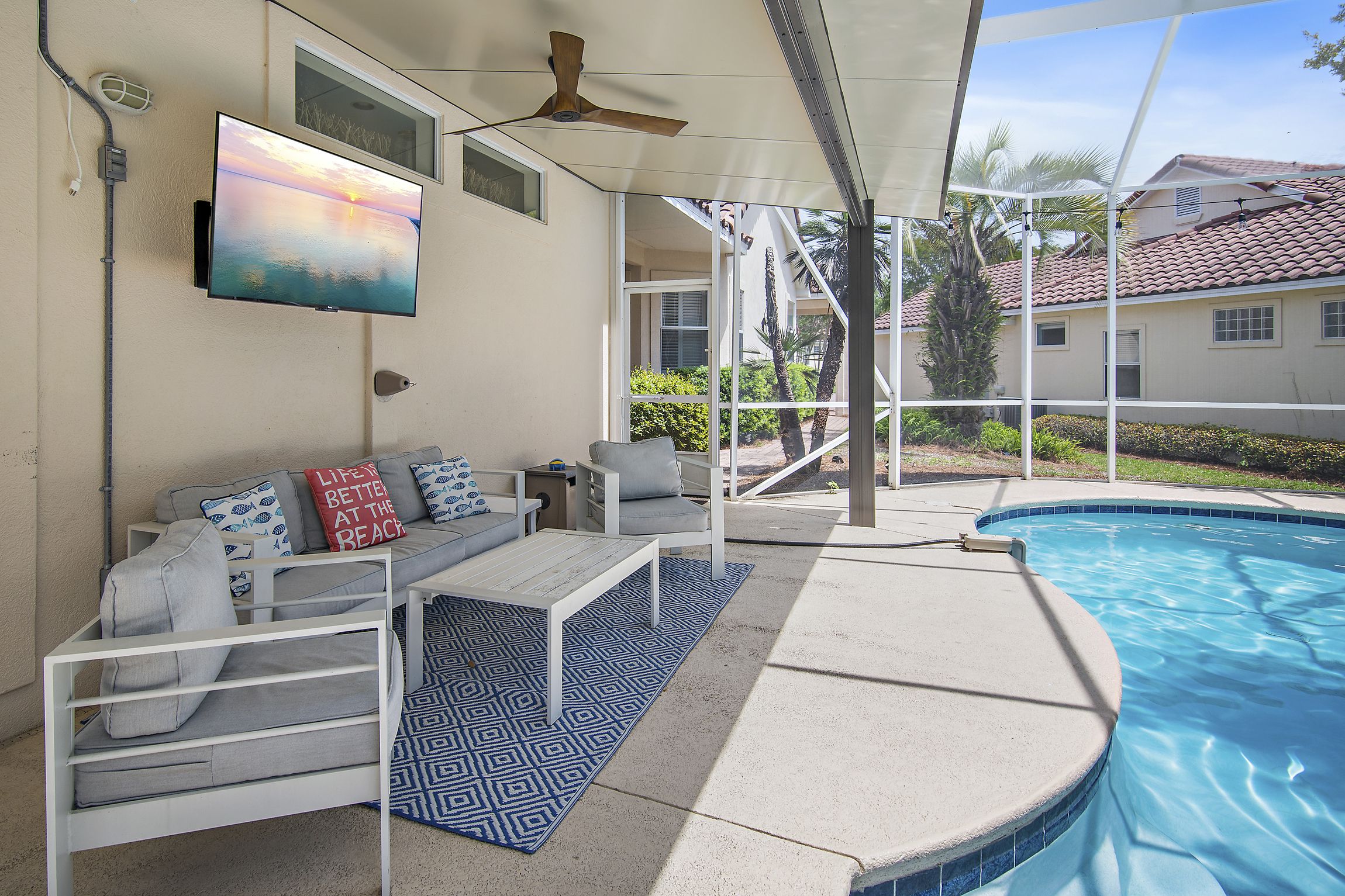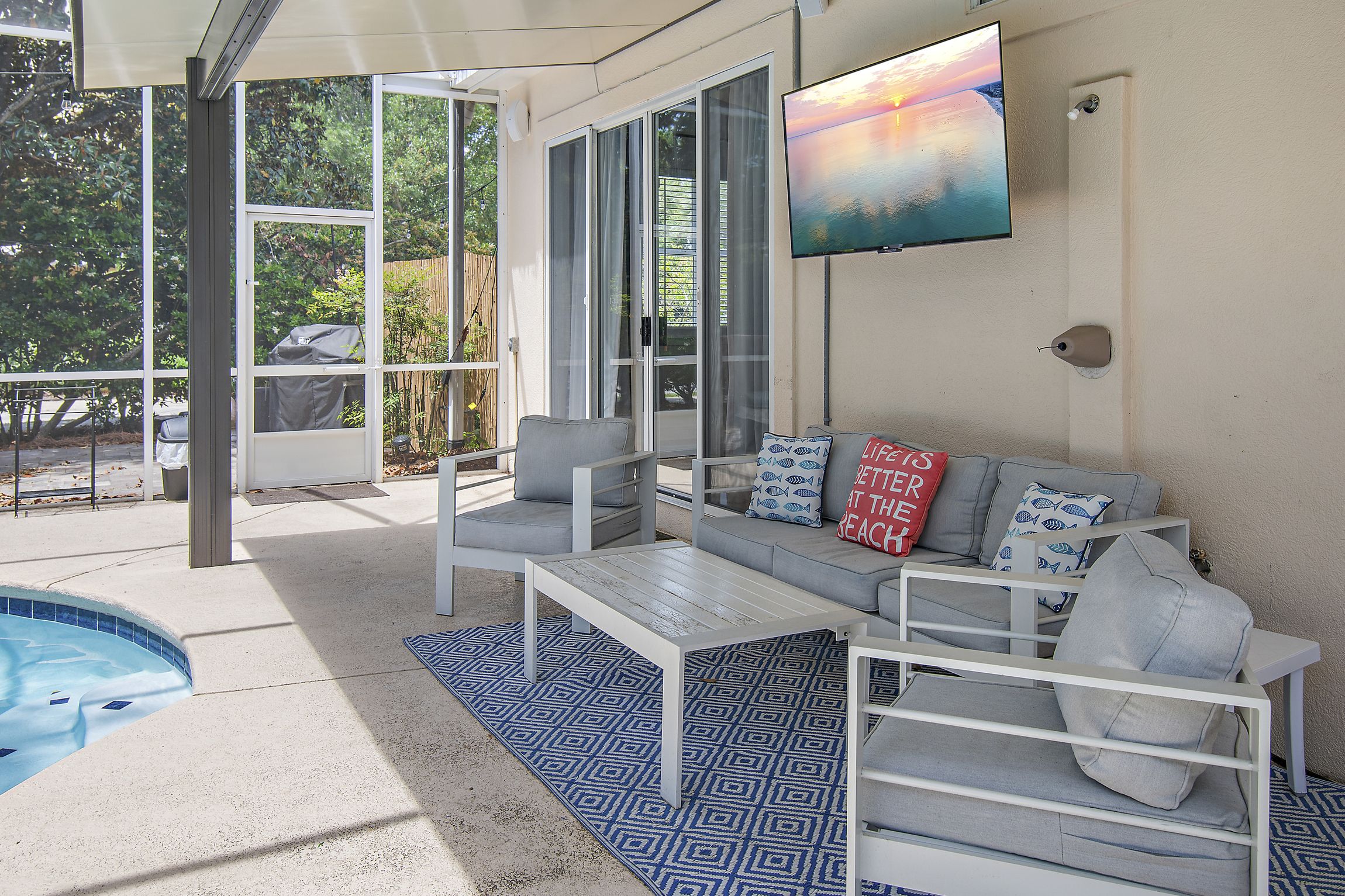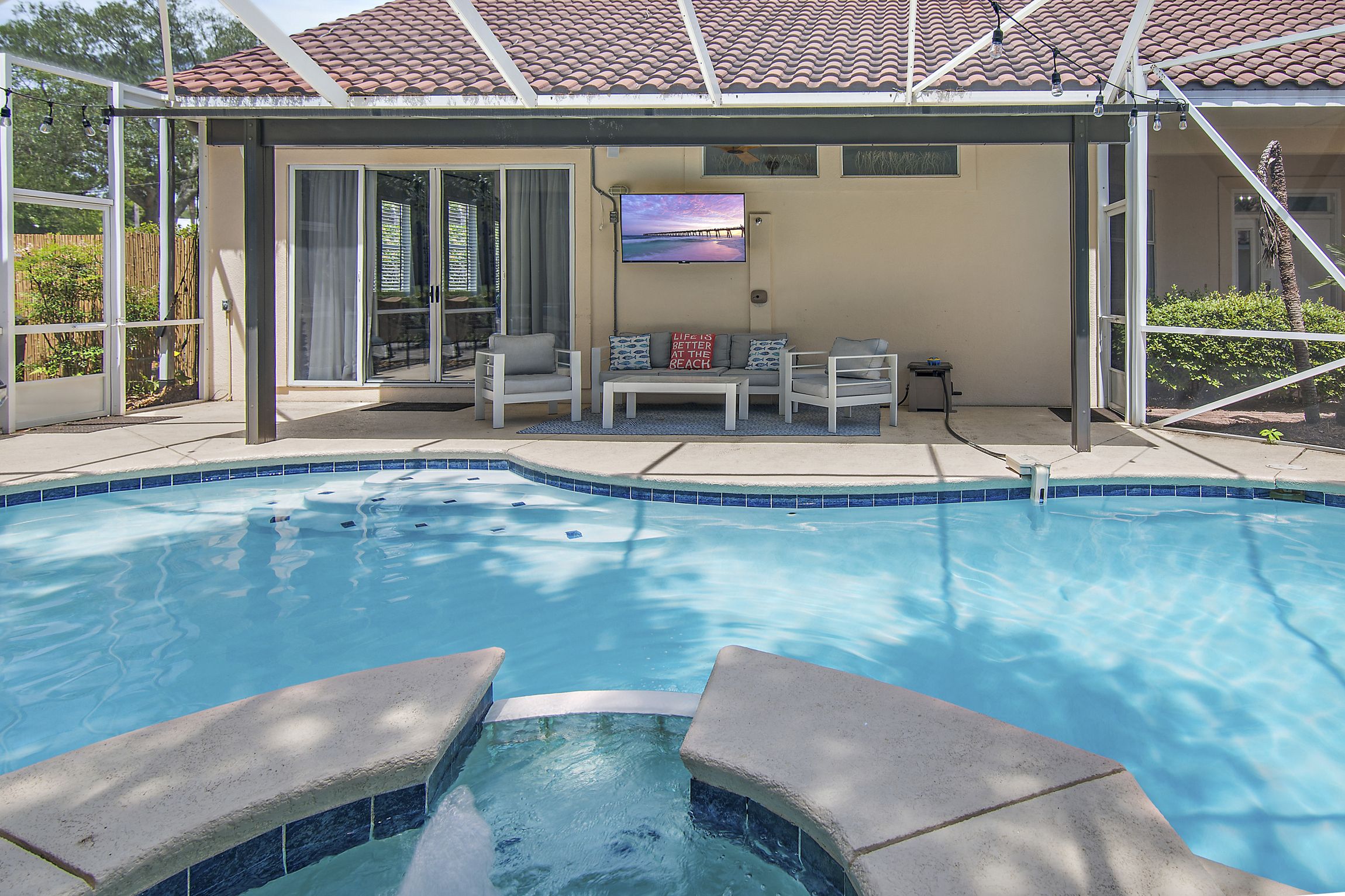 Just off the living area, you’ll find the real reason to stay at this beachy treasure—a pool! Escape into tranquility as you enjoy your private oasis, screened and equipped with loungers, tables, and shade. Grill up a great lunch on your personal grill and make lasting memories with loved ones as you soak up the Florida sun.