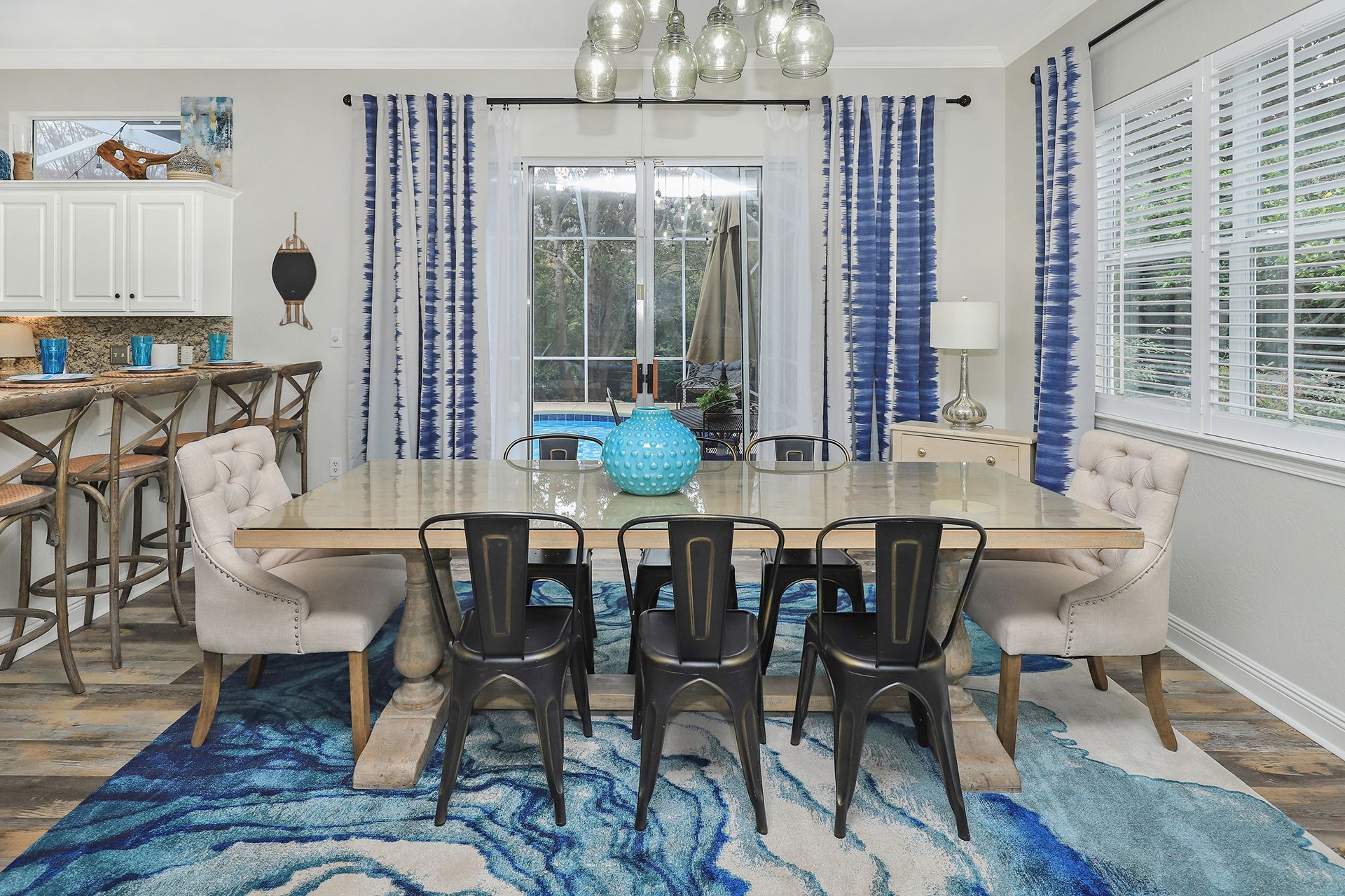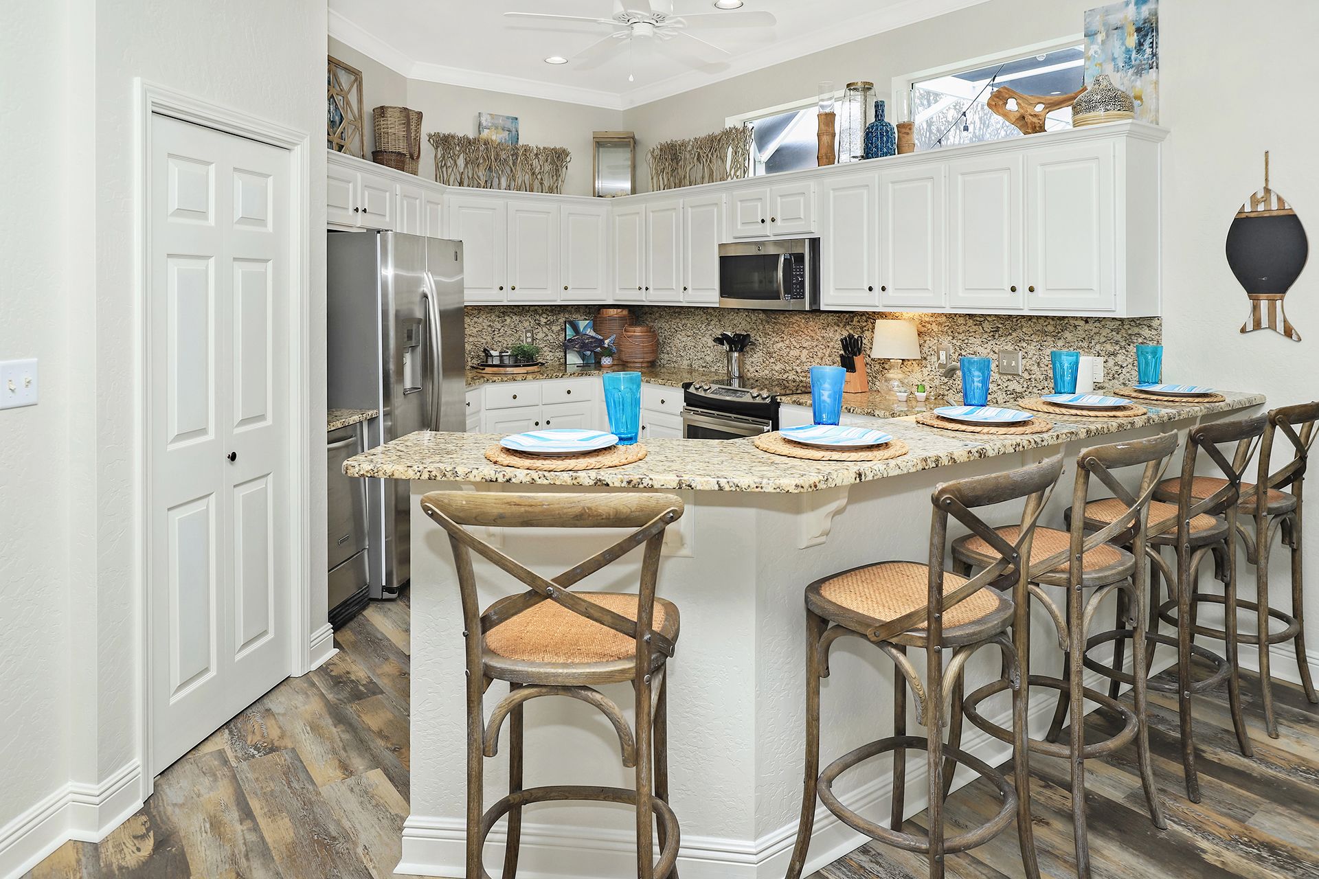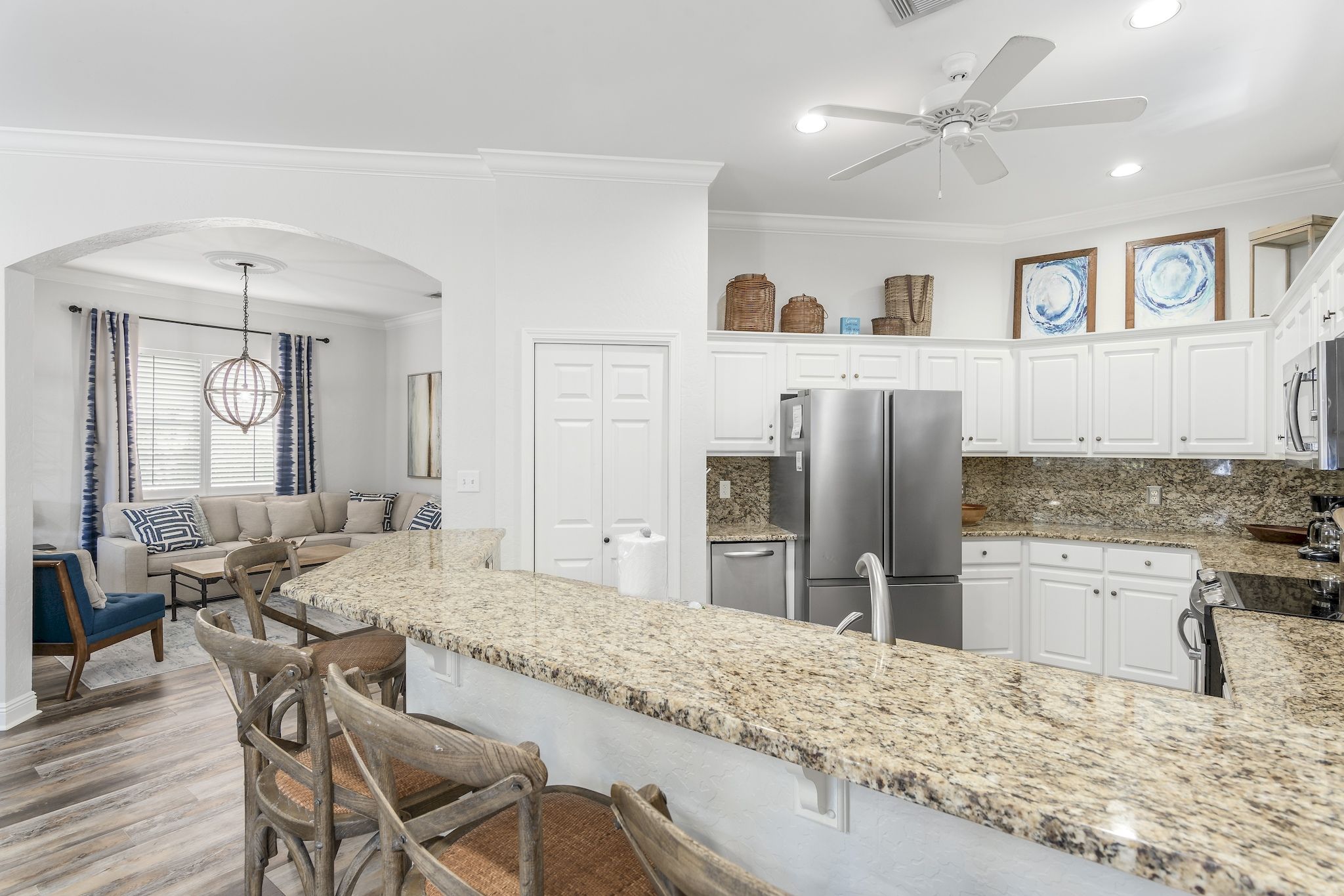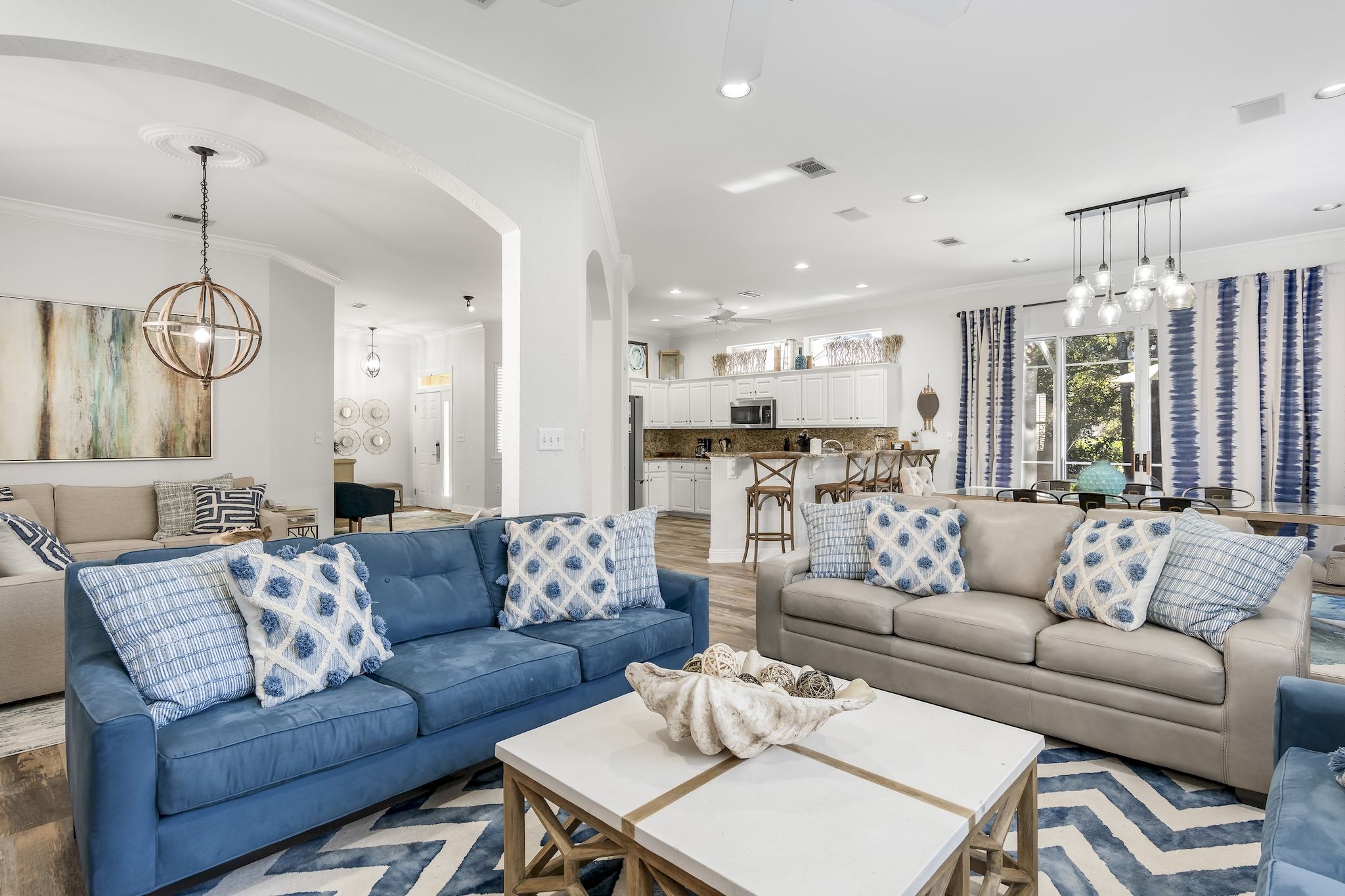 The home has a large kitchen with breakfast bar and a spacious dining area with 8-person table. Along with 2 living rooms, this open concept space is perfect for large family gatherings and snowbirds looking to entertain friends and family as they escape the winter months.