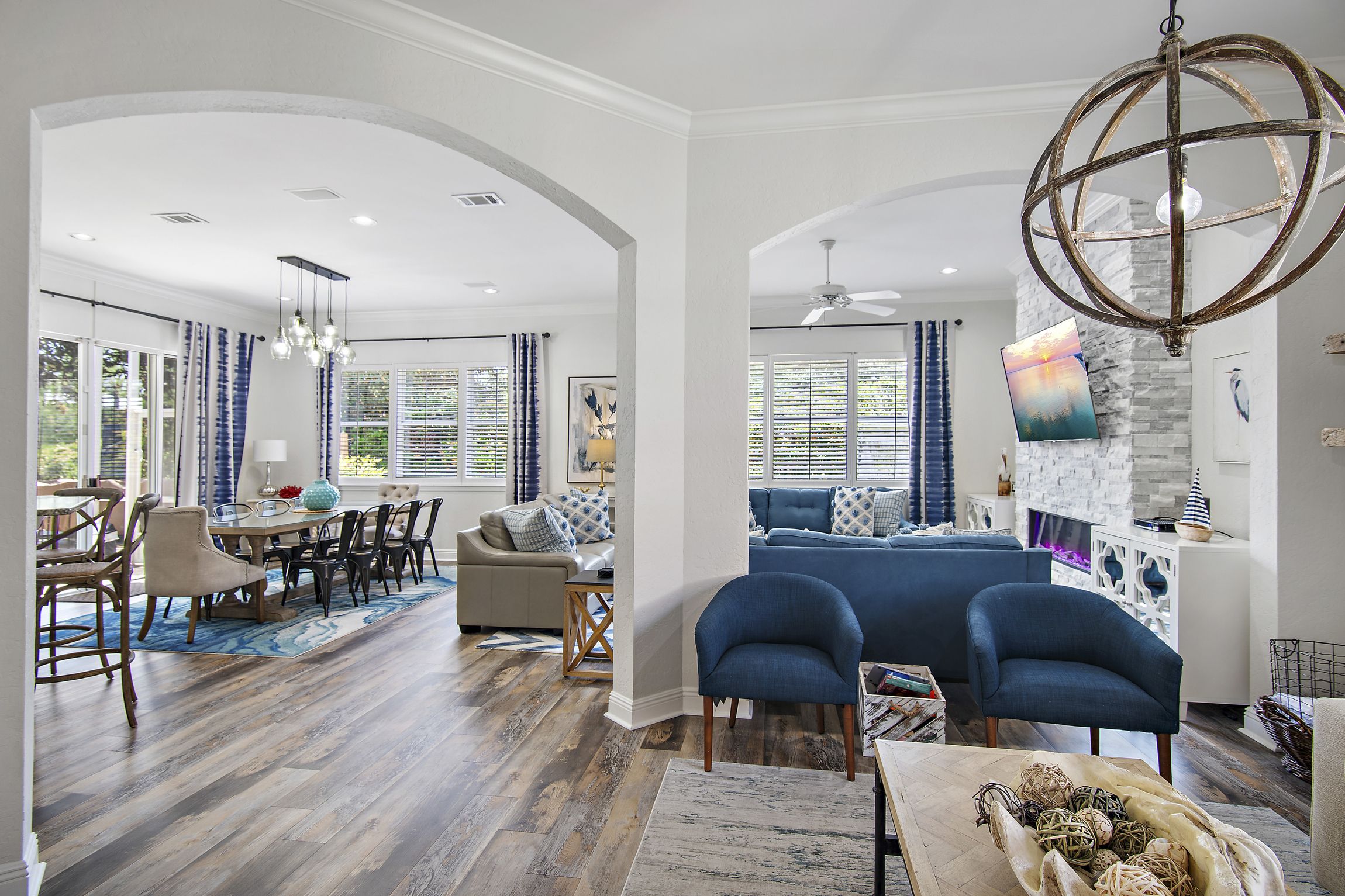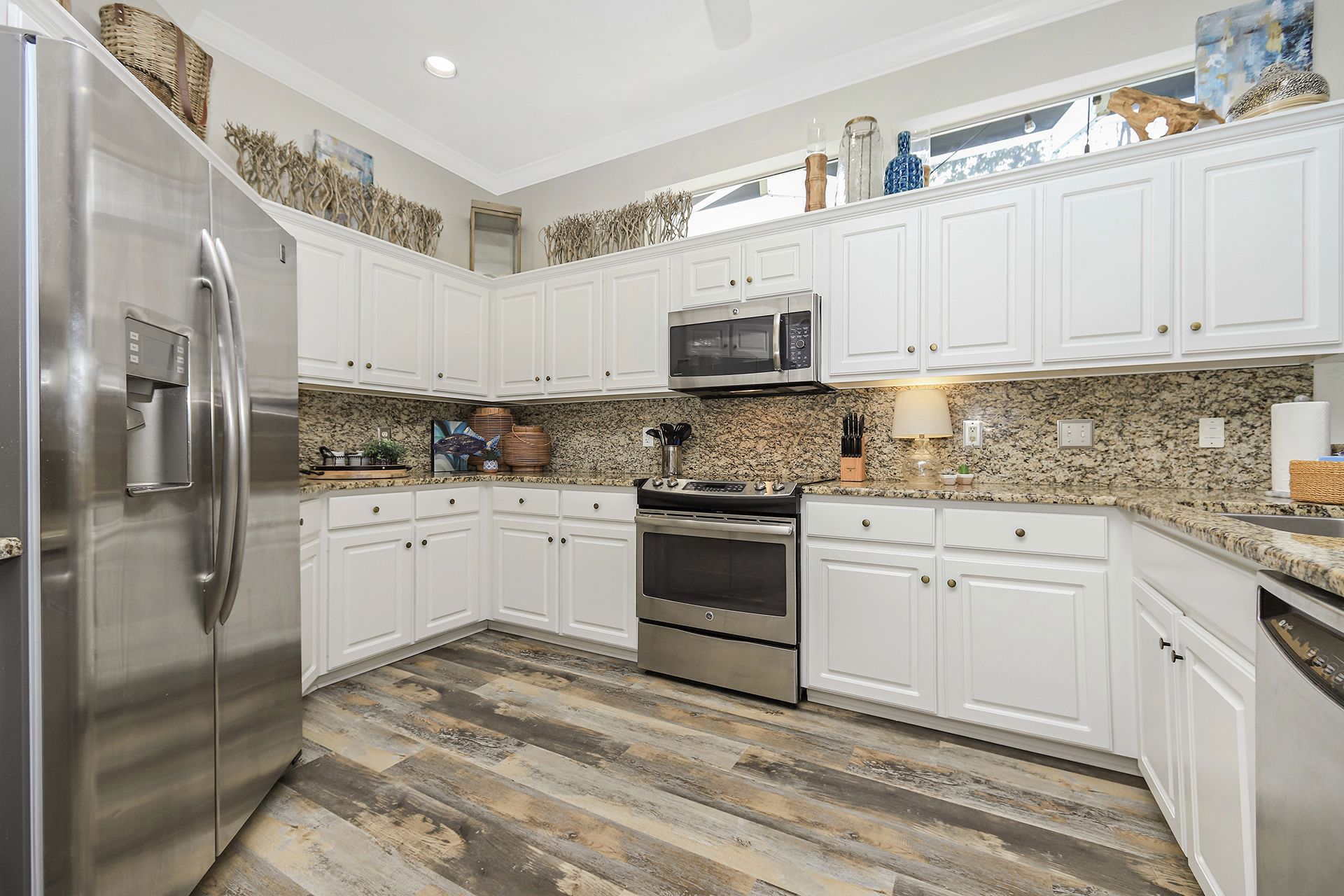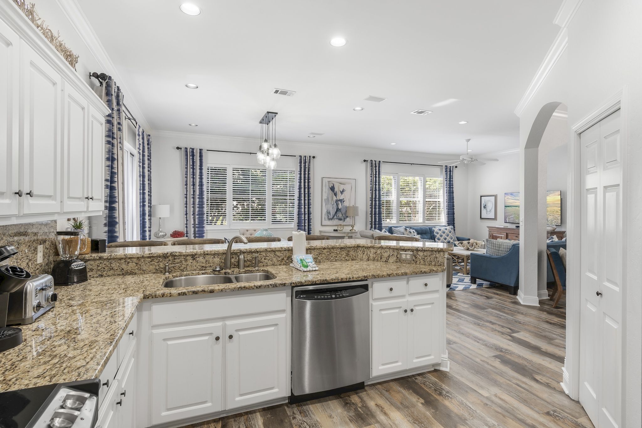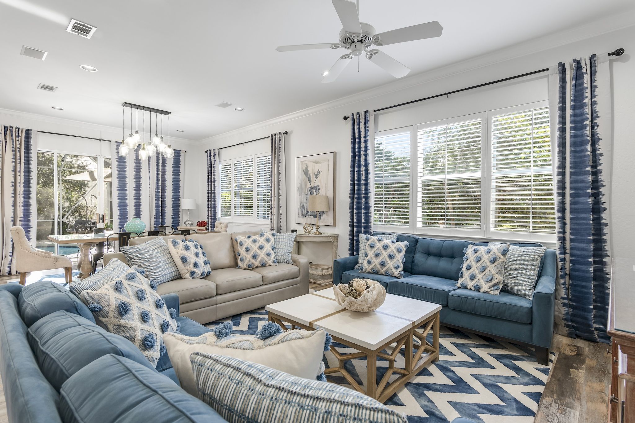 The home has a large kitchen with breakfast bar and a spacious dining area with 8-person table. Along with 2 living rooms, this open concept space is perfect for large family gatherings and snowbirds looking to entertain friends and family as they escape the winter months.