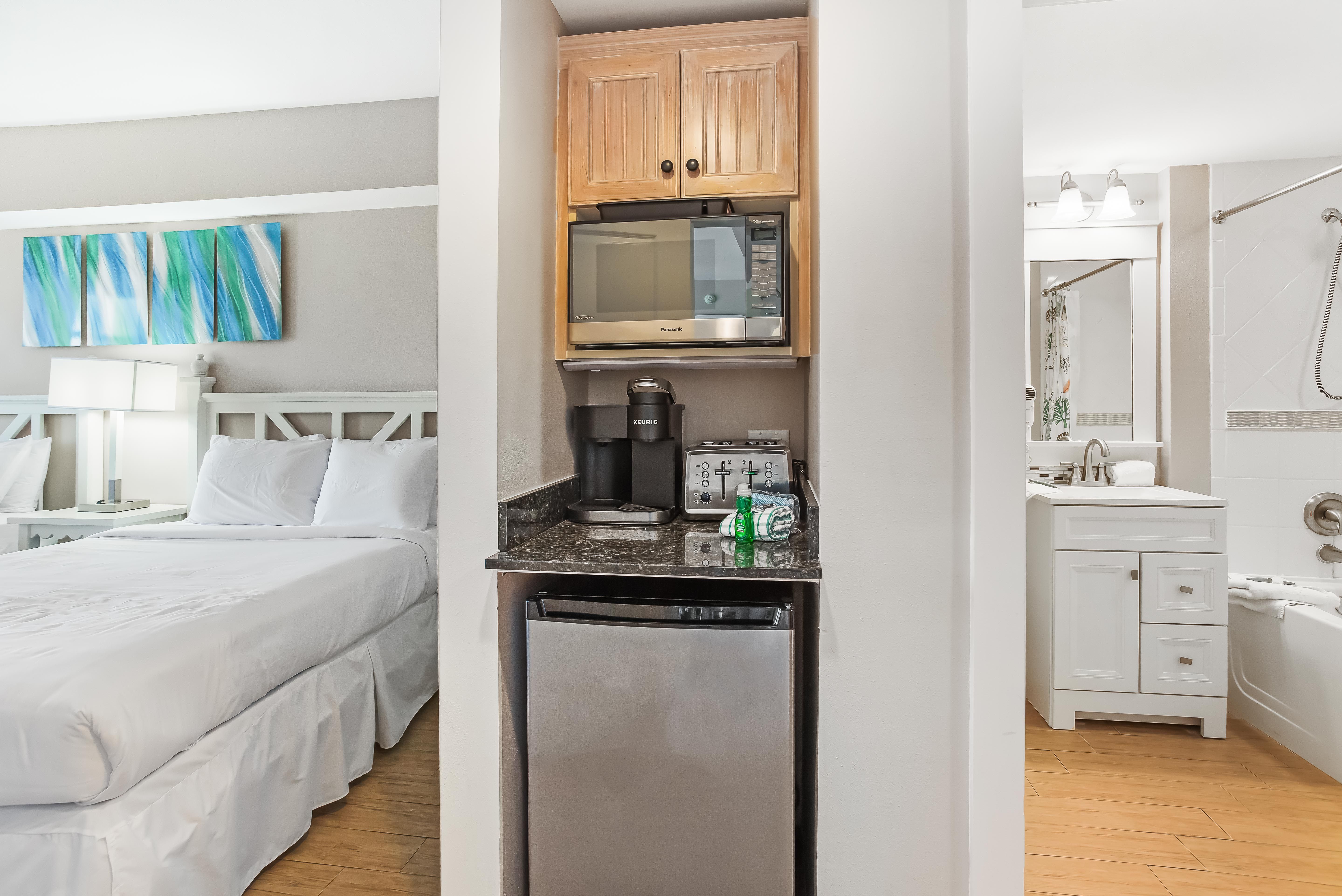 The kitchenette features a mini-fridge, microwave, toaster, Keurig coffee maker, and dining utensils. You have everything you need for starting the day and whipping up pool or beach snacks.