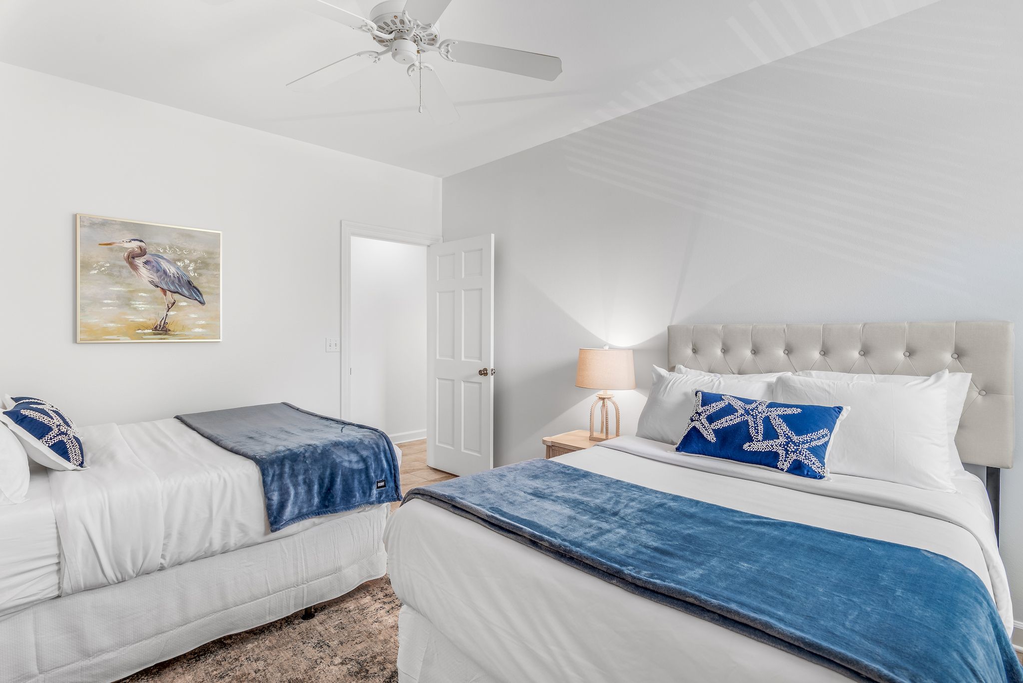 The master bedroom features a king bed and an en suite bathroom with a shower and separate soaking tub. One guest bedroom features a king bed and the other guest bedroom offers two full beds. The second bathroom includes a tub/shower combo and vanity area.