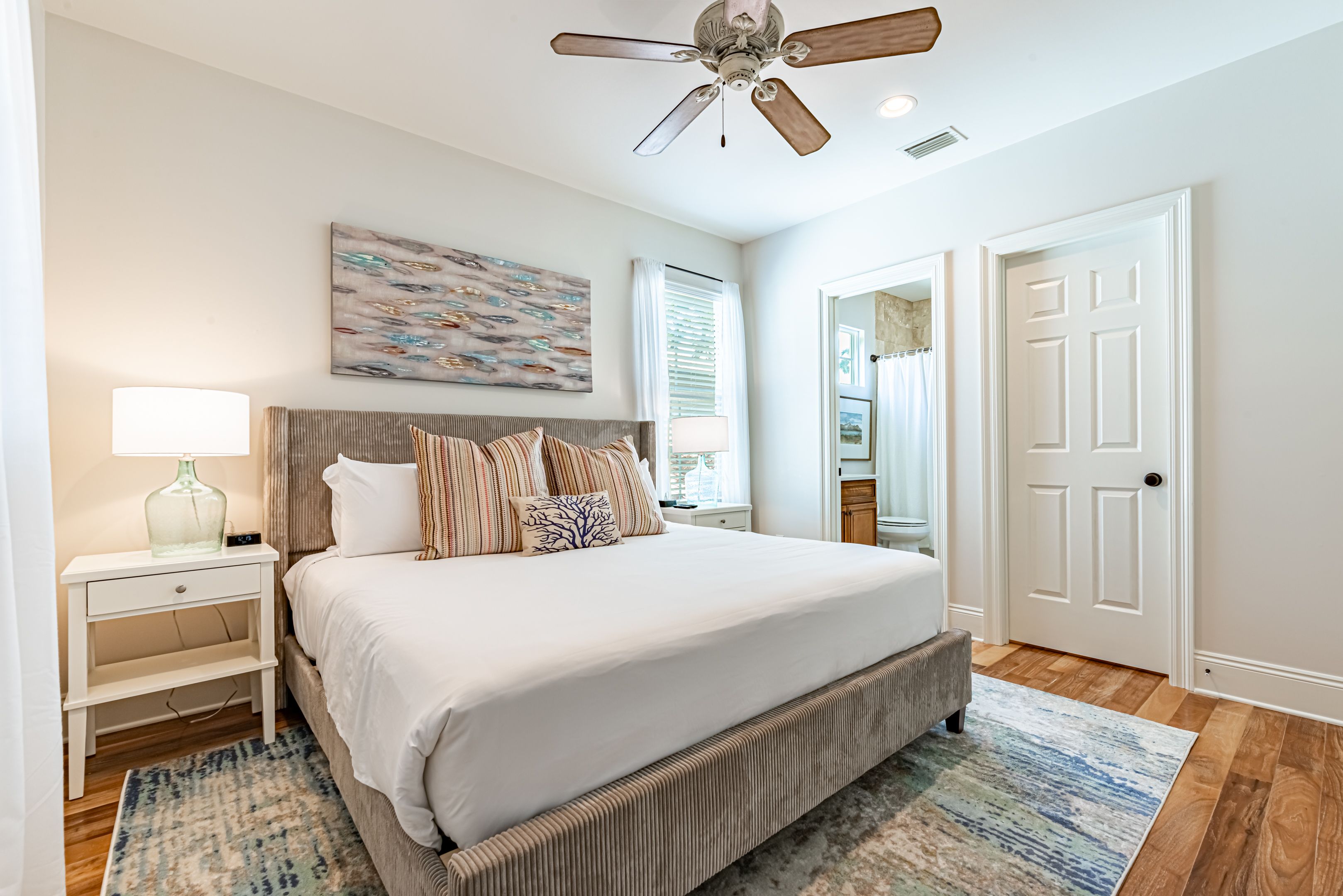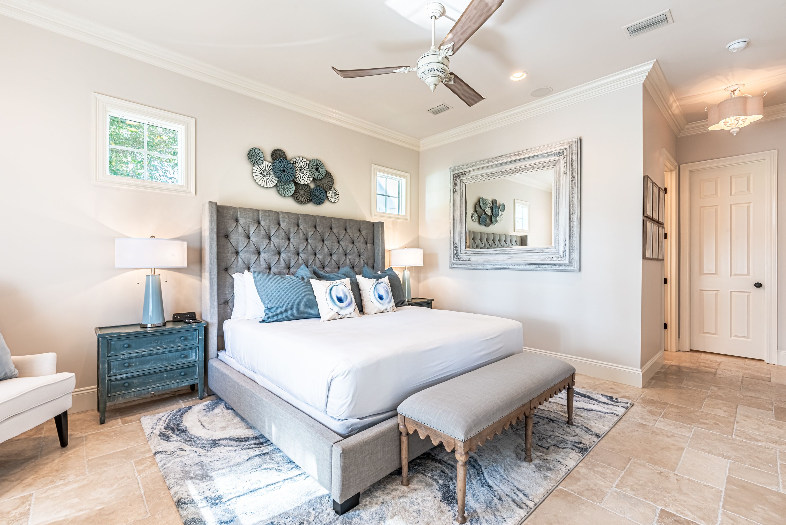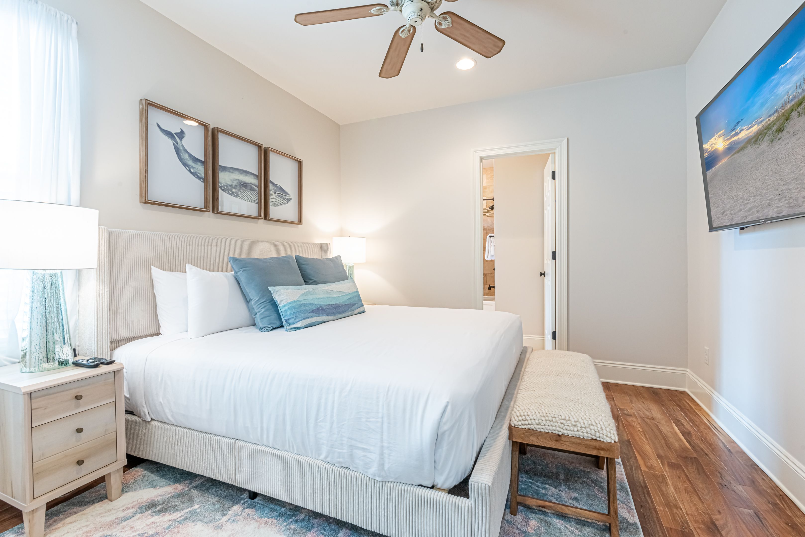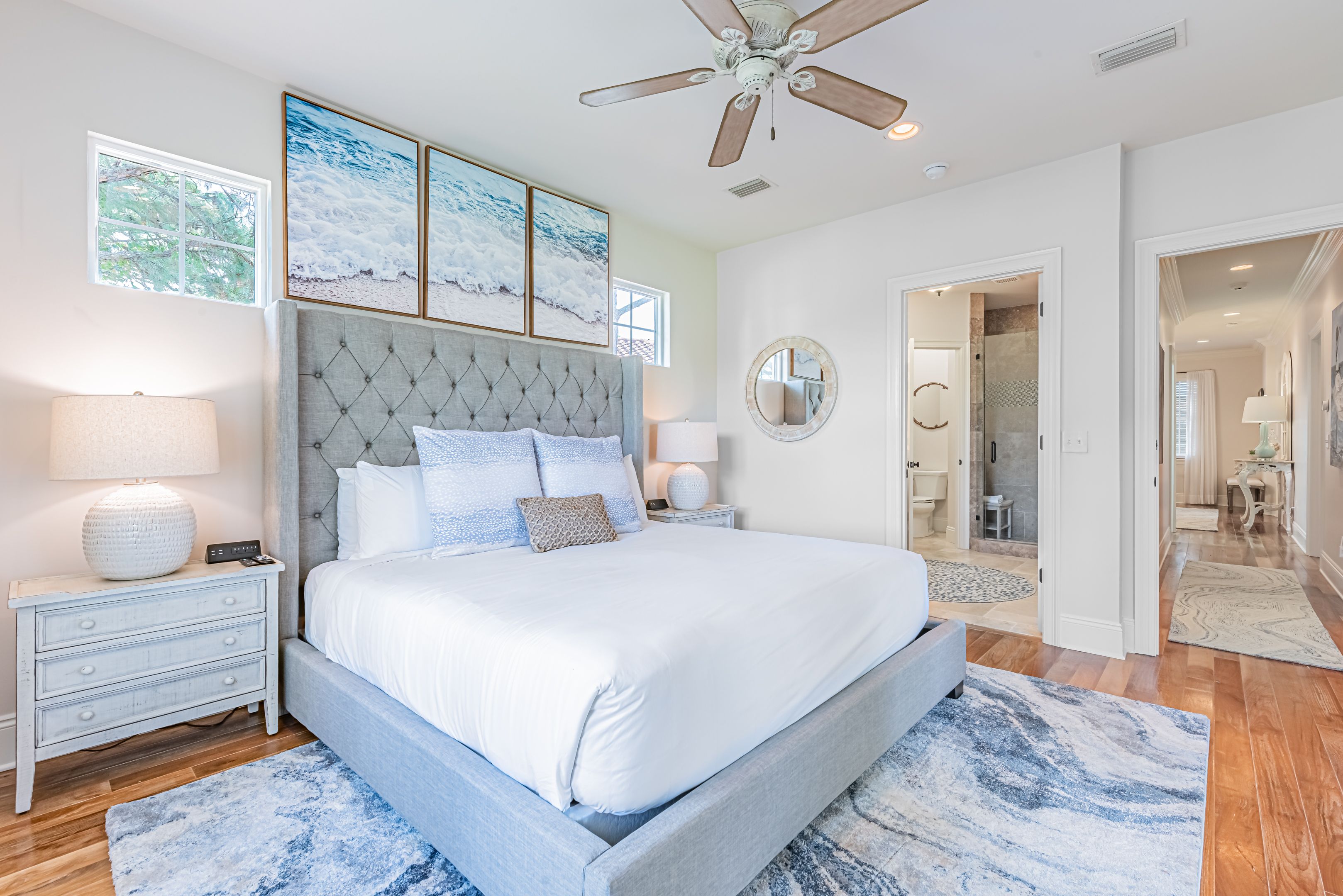 The home’s bedrooms offer restful retreats, with a master suite on each floor. The first-floor master features a king bed and an en-suite bathroom with a luxurious oversized walk-in shower. Upstairs, the second master suite includes a private balcony, perfect for soaking in the coastal air, along with its own en-suite bath. Two additional guest rooms, each with king beds and en-suite bathrooms, ensure your guests enjoy their own slice of paradise.