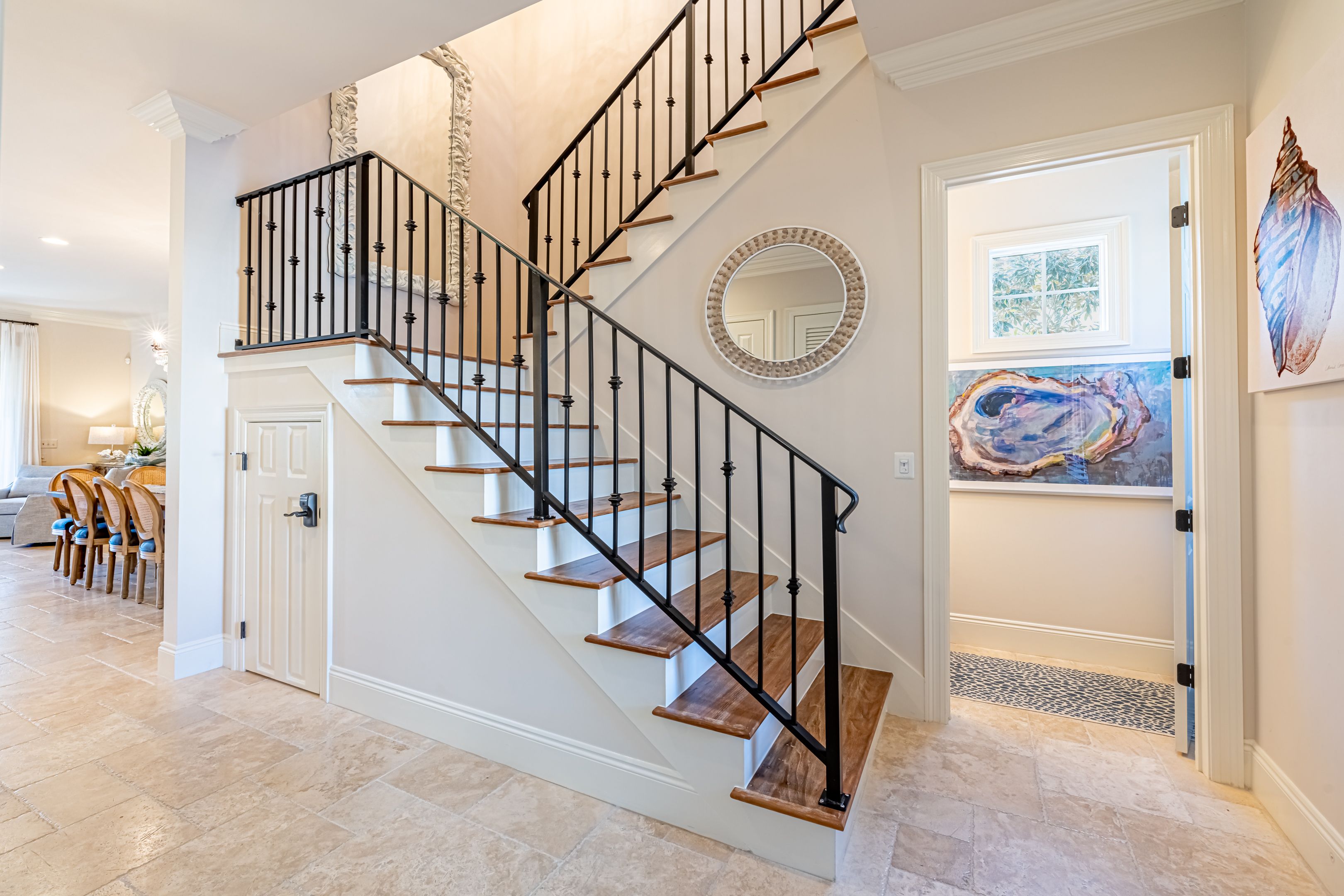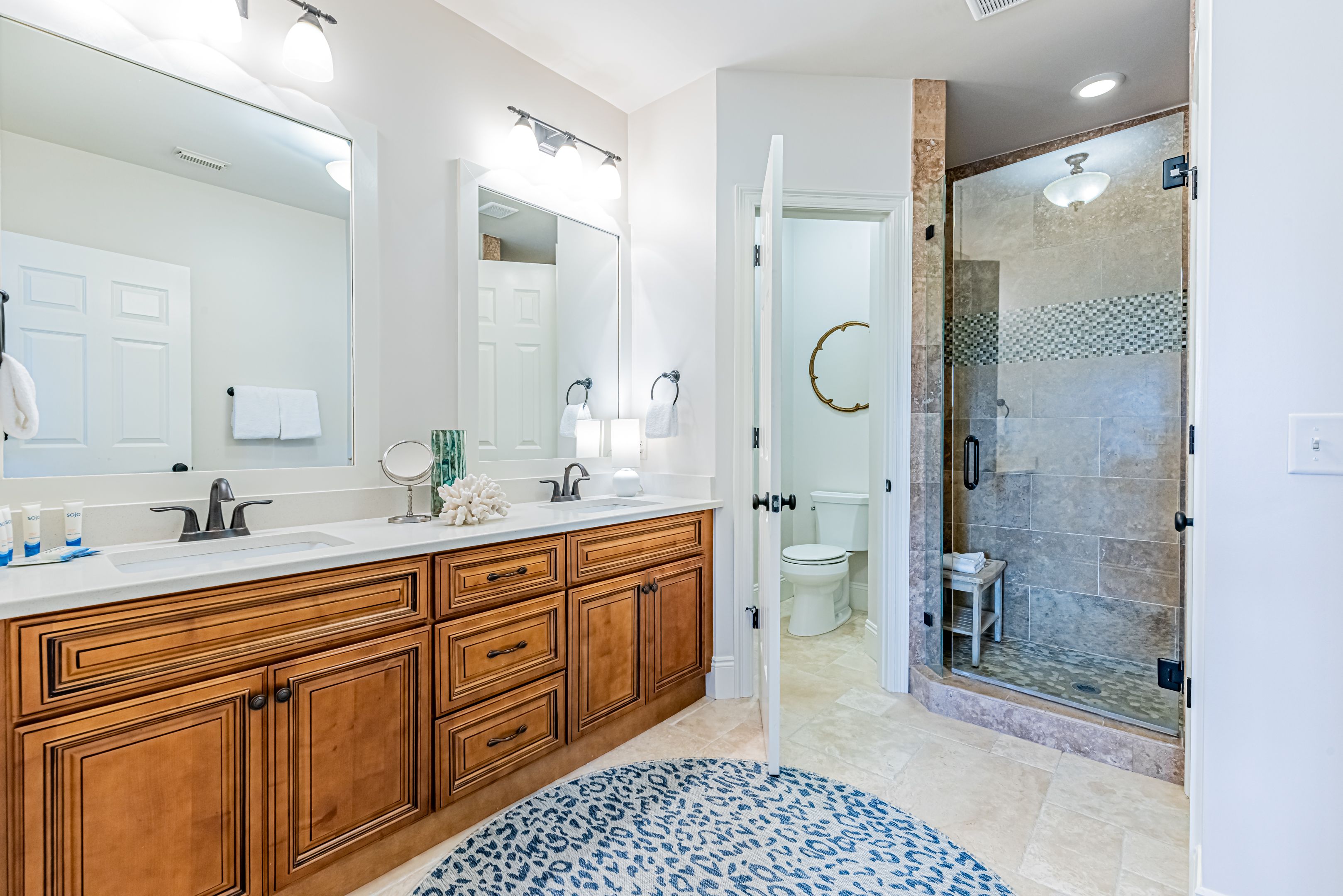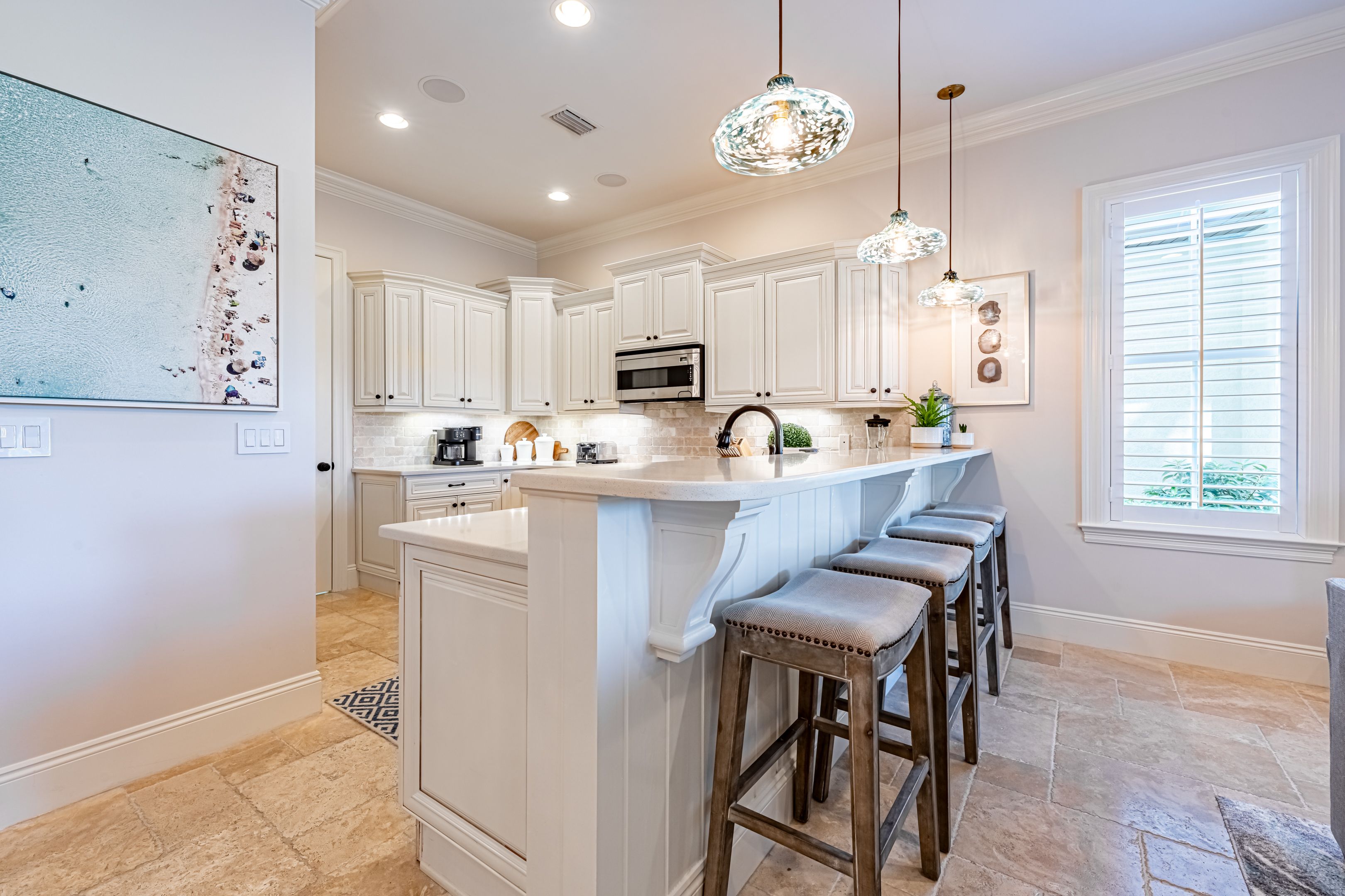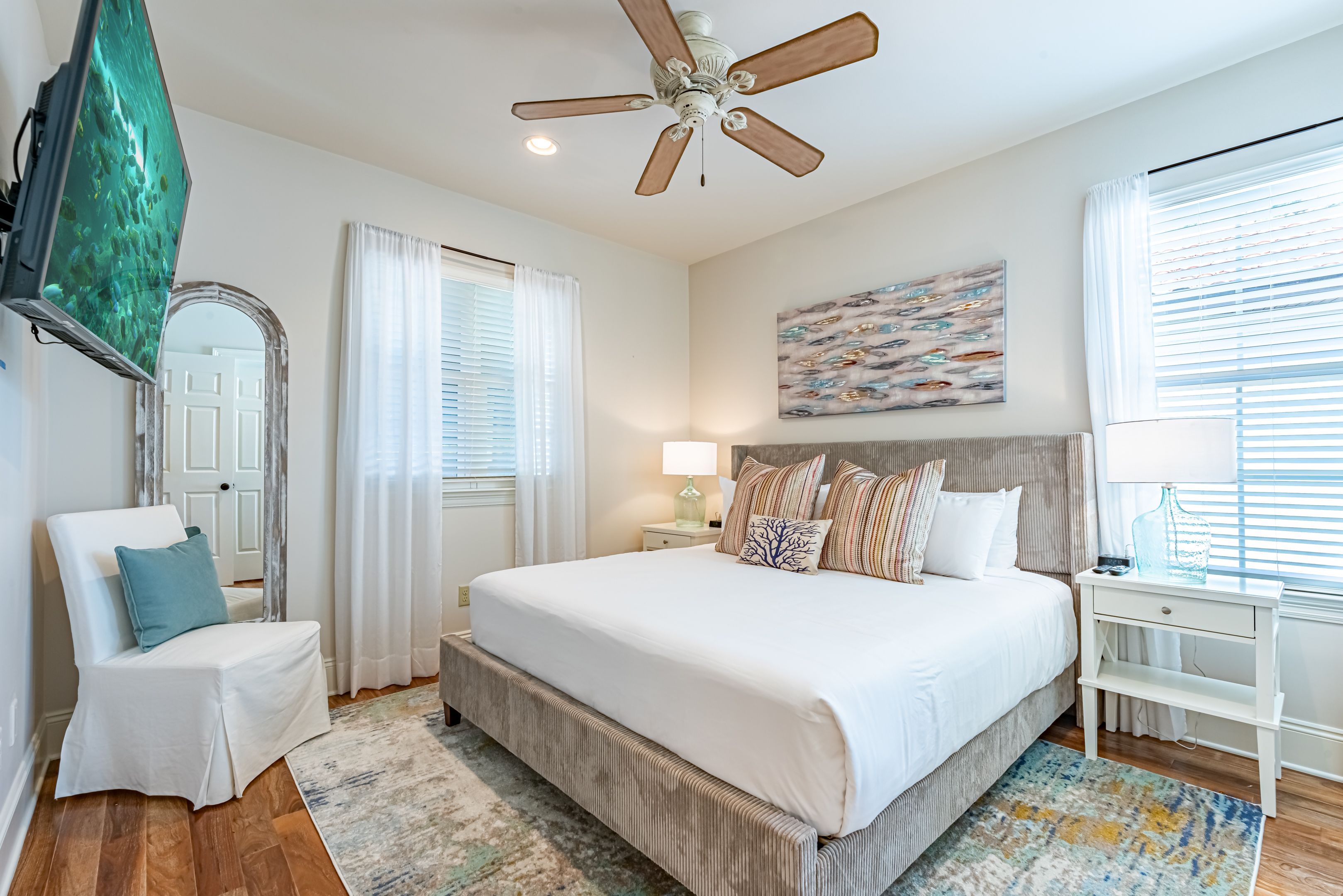 The home’s bedrooms offer restful retreats, with a master suite on each floor. The first-floor master features a king bed and an en-suite bathroom with a luxurious oversized walk-in shower. Upstairs, the second master suite includes a private balcony, perfect for soaking in the coastal air, along with its own en-suite bath. Two additional guest rooms, each with king beds and en-suite bathrooms, ensure your guests enjoy their own slice of paradise.
