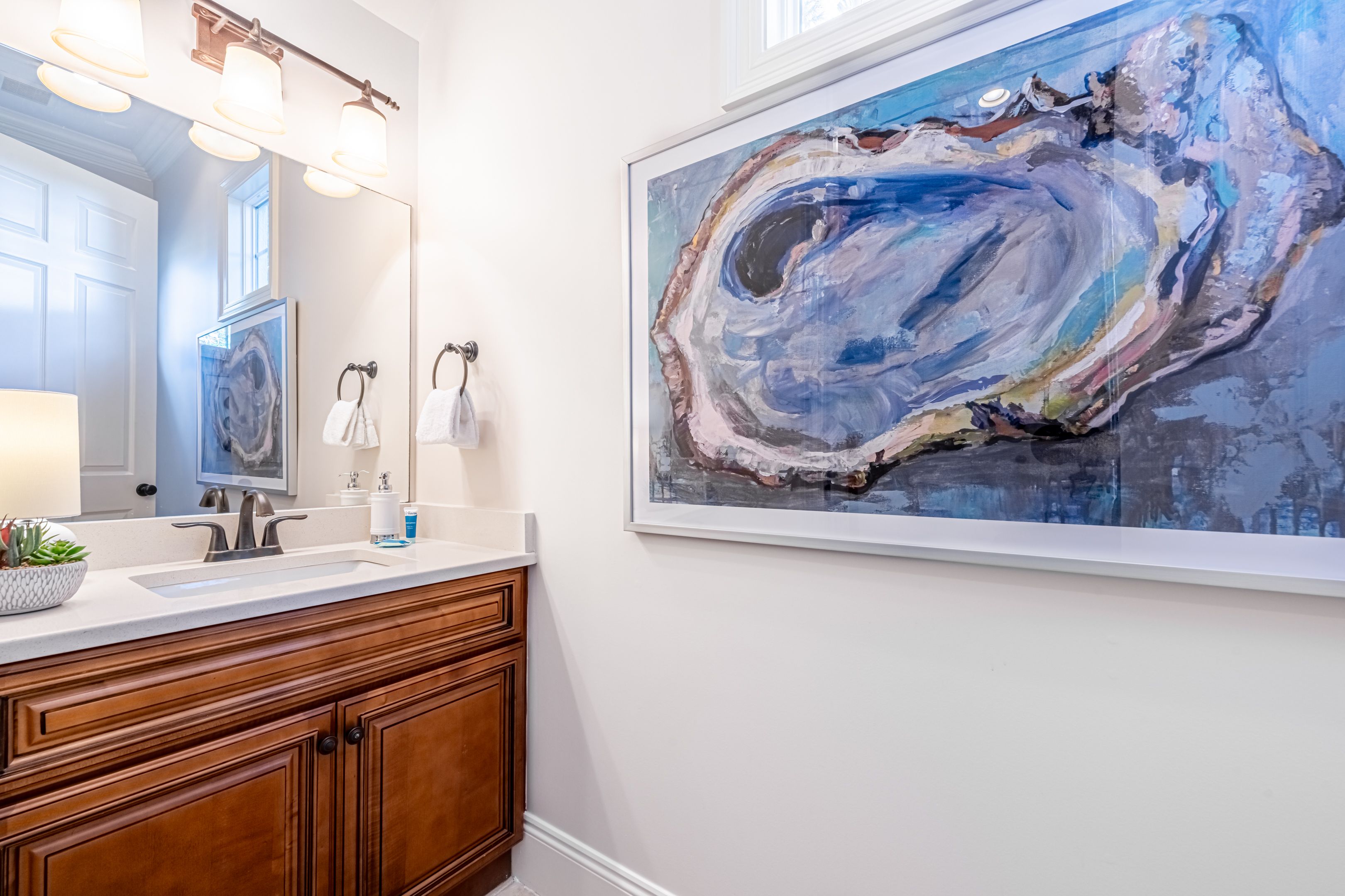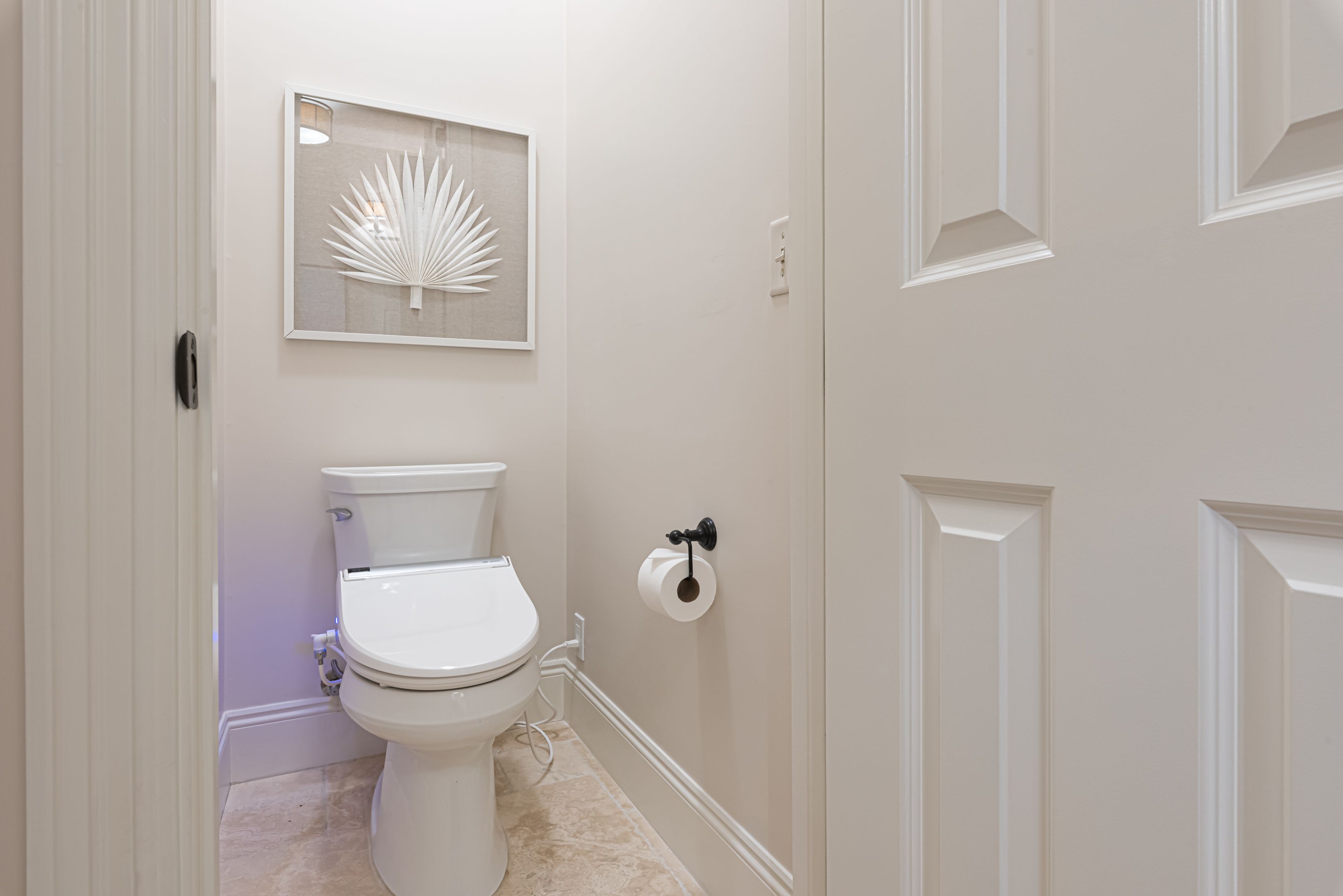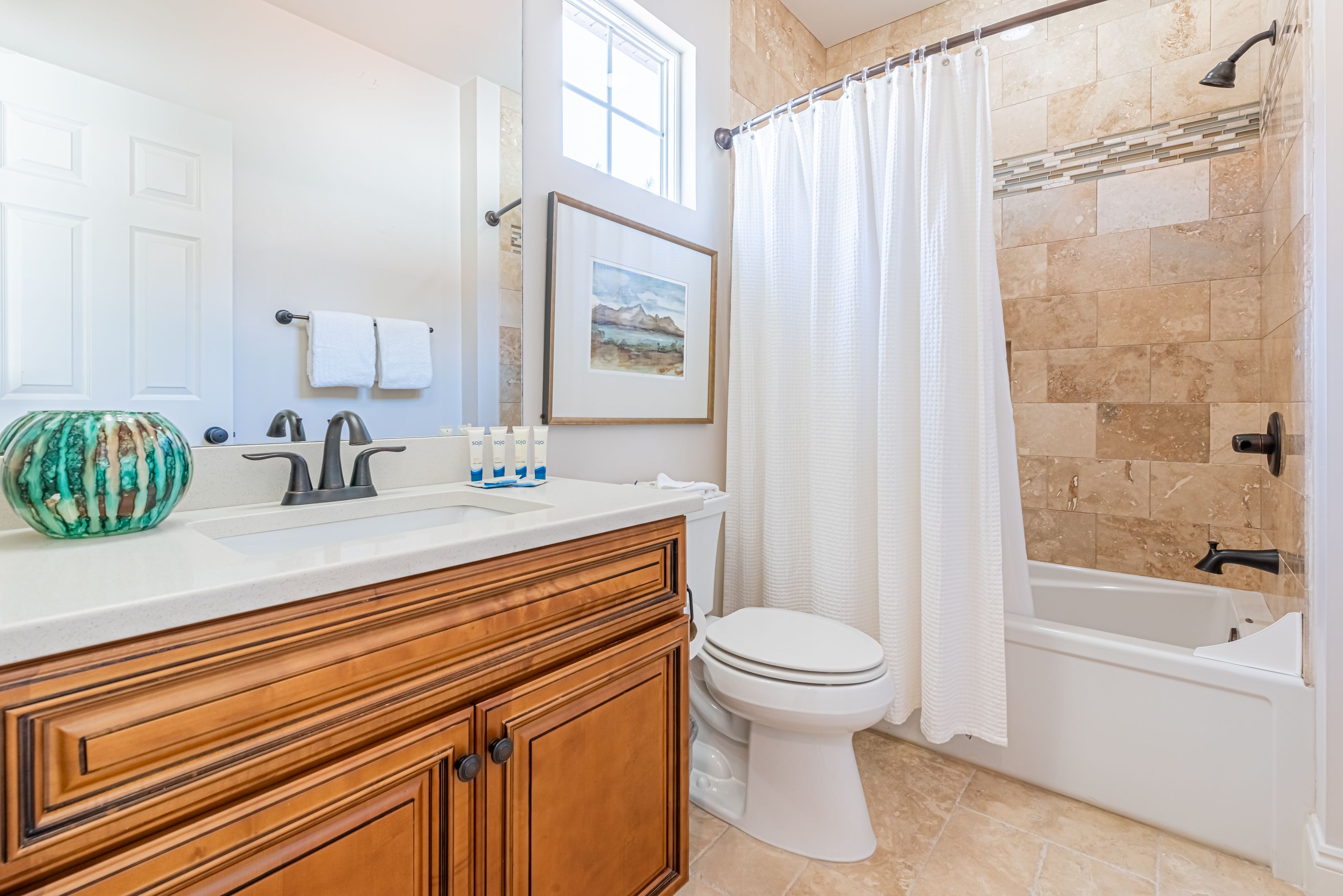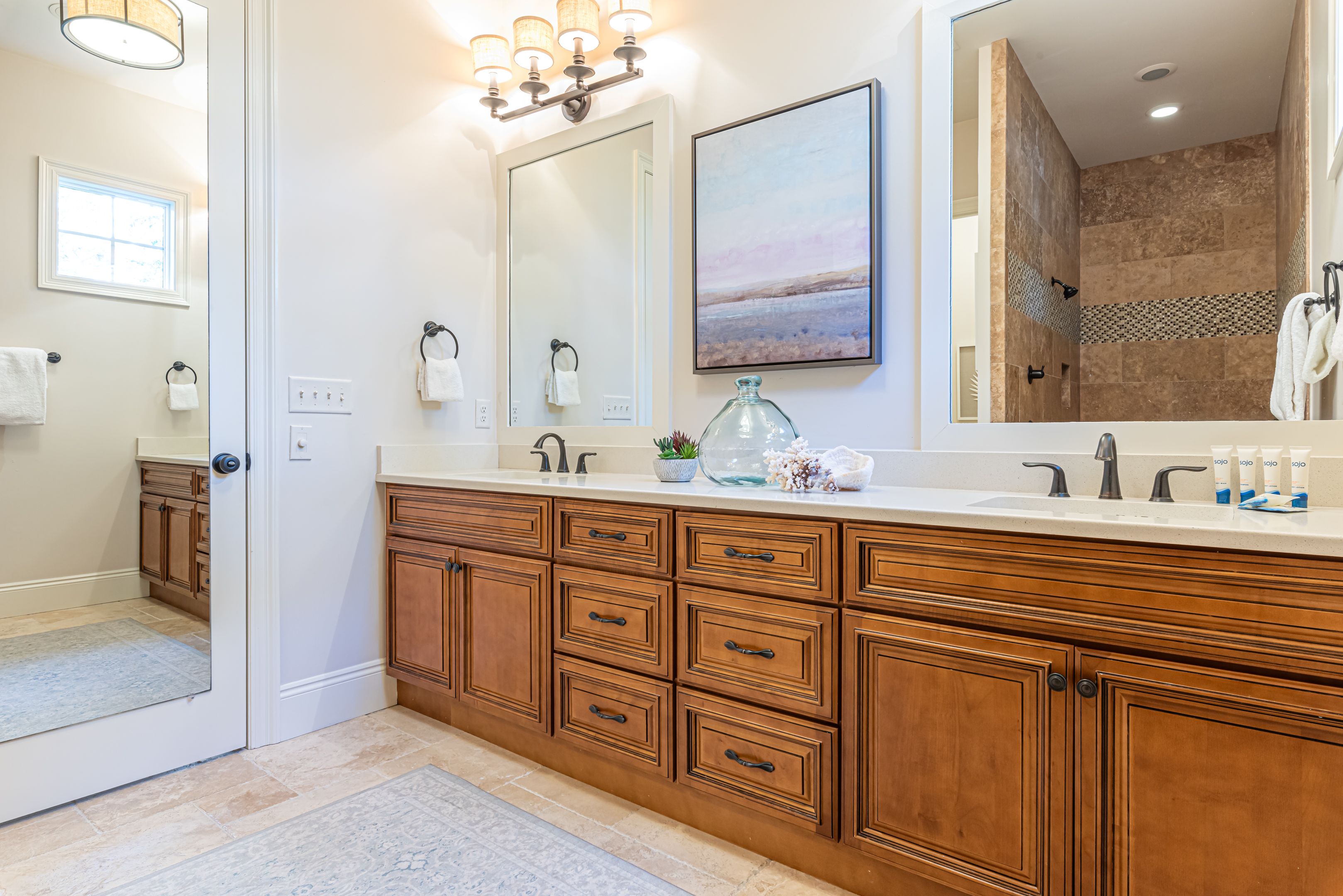 The home’s bedrooms offer restful retreats, with a master suite on each floor. The first-floor master features a king bed and an en-suite bathroom with a luxurious oversized walk-in shower. Upstairs, the second master suite includes a private balcony, perfect for soaking in the coastal air, along with its own en-suite bath. Two additional guest rooms, each with king beds and en-suite bathrooms, ensure your guests enjoy their own slice of paradise.