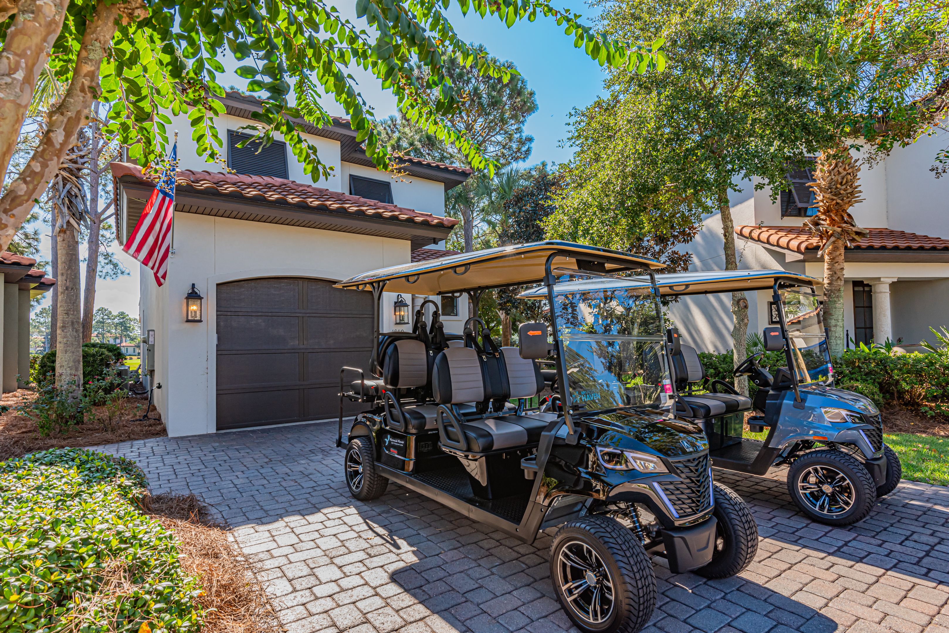 Discover the ultimate coastal retreat at "Mermaid Manor," a stunning Mediterranean-style villa nestled in the heart of SANDESTIN GOLF AND BEACH RESORT®, just steps from the vibrant Village of Baytowne Wharf. This two-story home offers one of the largest floor plans in the Villa Lago community, complete with ample driveway space and two brand-new 6-seat golf carts.