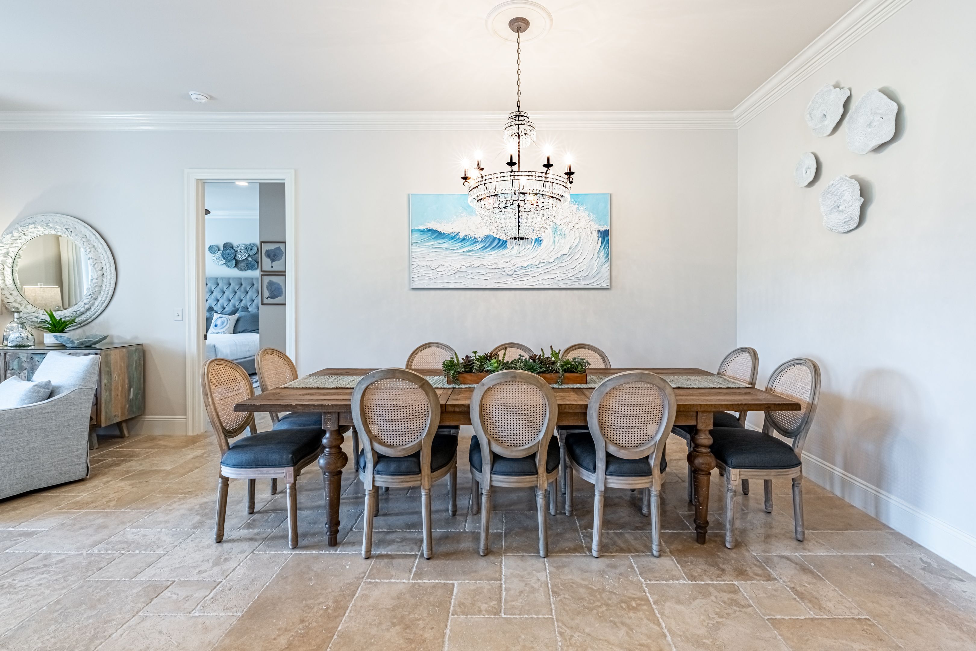 The well-appointed and fully-stocked chef’s kitchen is a culinary delight, boasting custom cabinetry, and marble countertops. An in-house coffee bar and wine cabinet ensure you’re always ready for any occasion. Whether dining at the stylish breakfast bar or the grand 10-person dining table, you'll enjoy beautiful views of the lush greens and sparkling lake.