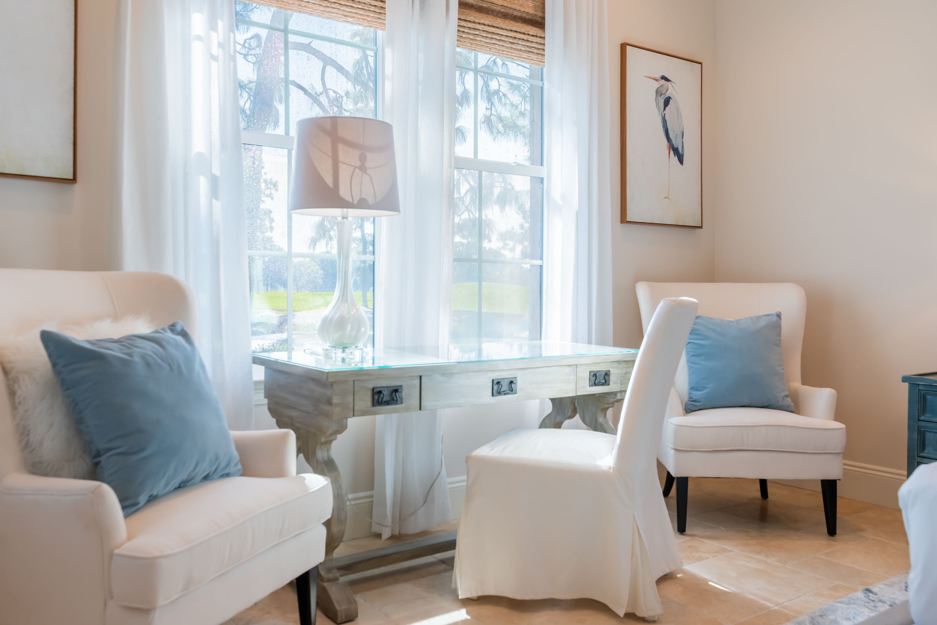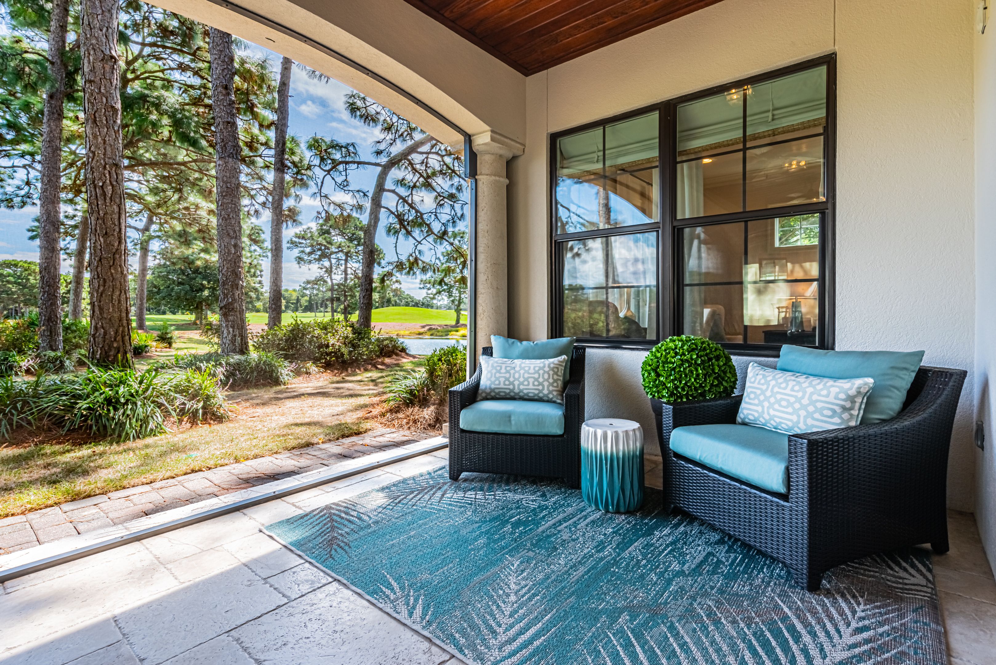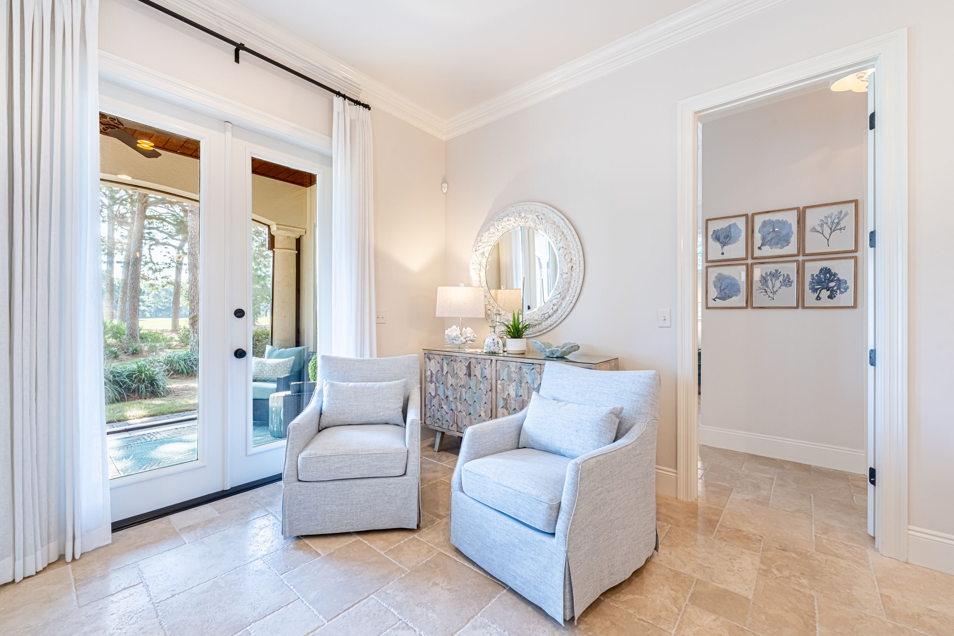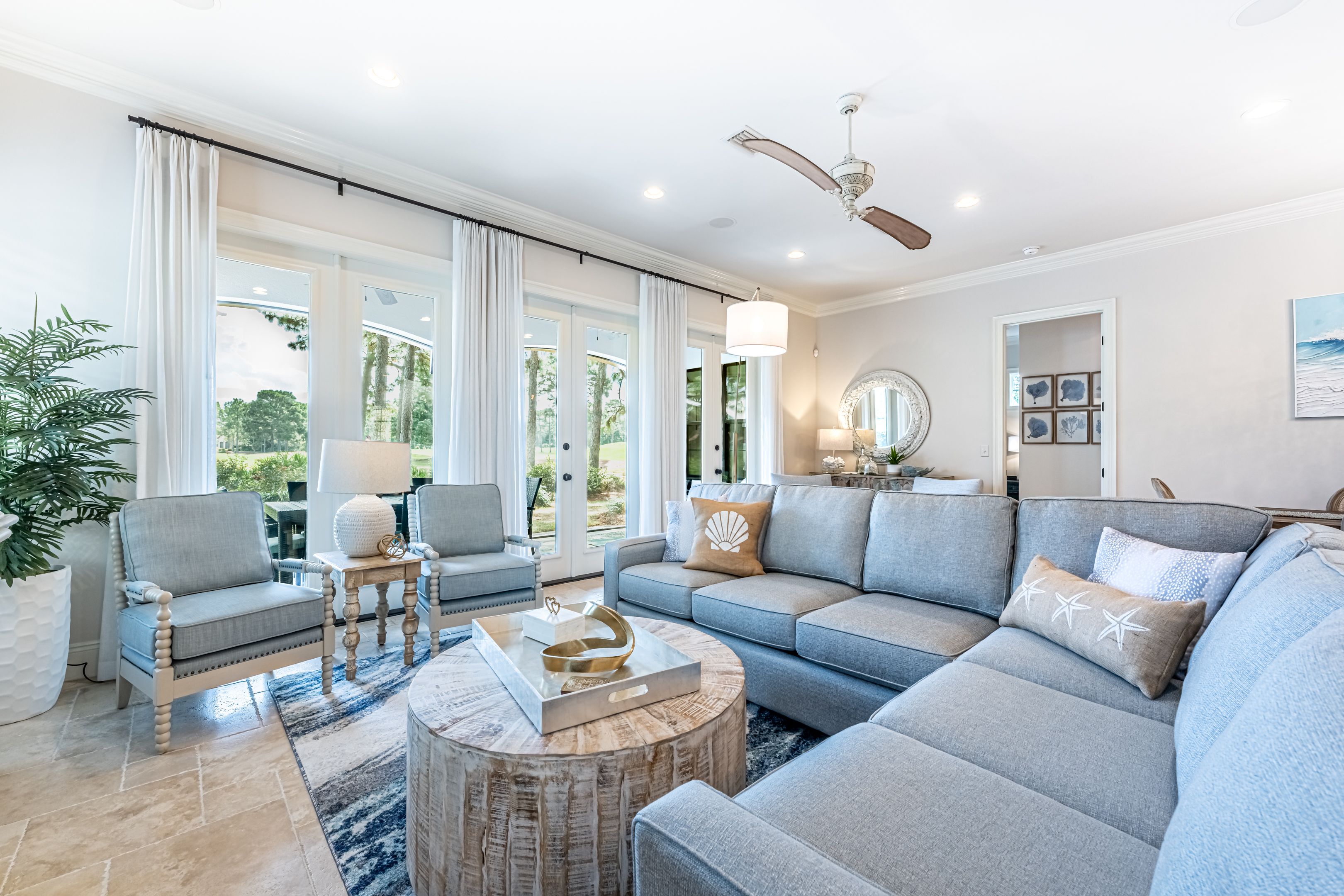 From the moment you cross the threshold into the grand foyer, you’ll feel the serenity of coastal living embrace you. The professionally designed interior, with its artful blend of upscale elegance and comfort, invites you to relax and unwind. The spacious living area is ideal for slow mornings and lingering evenings. French doors open onto an expansive screened patio, where lake and golf course views create the perfect backdrop for al fresco dining and morning coffee.