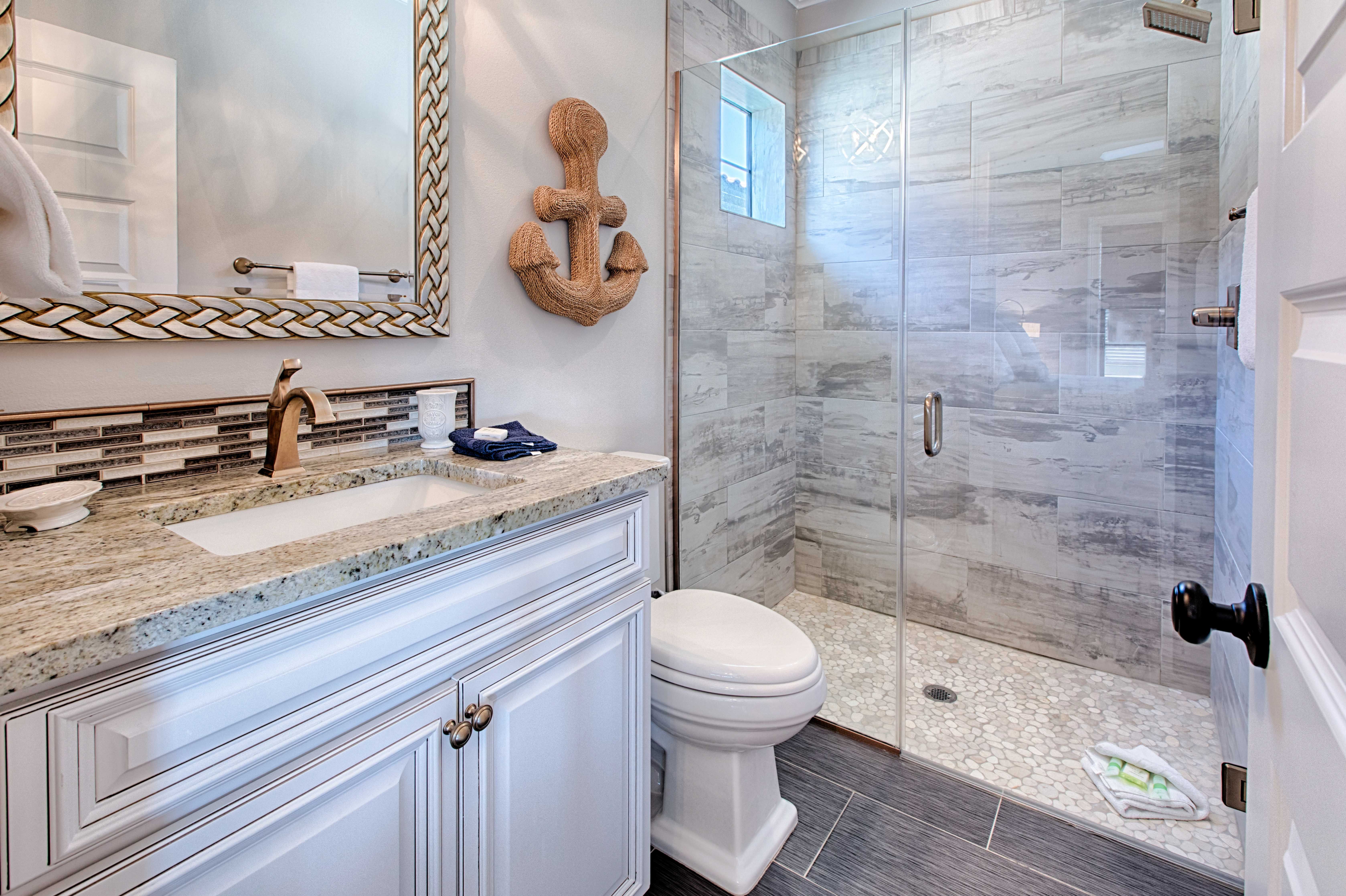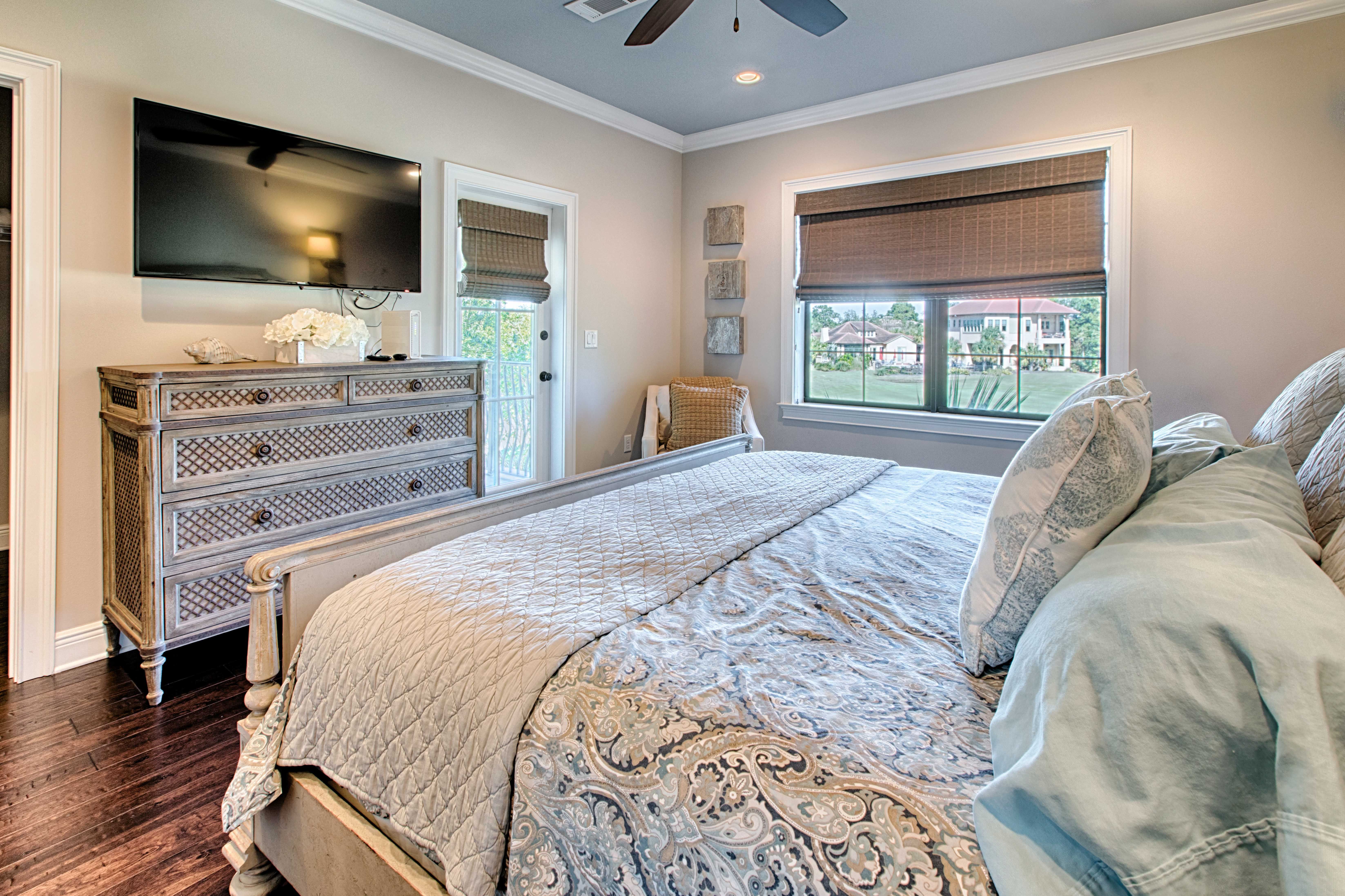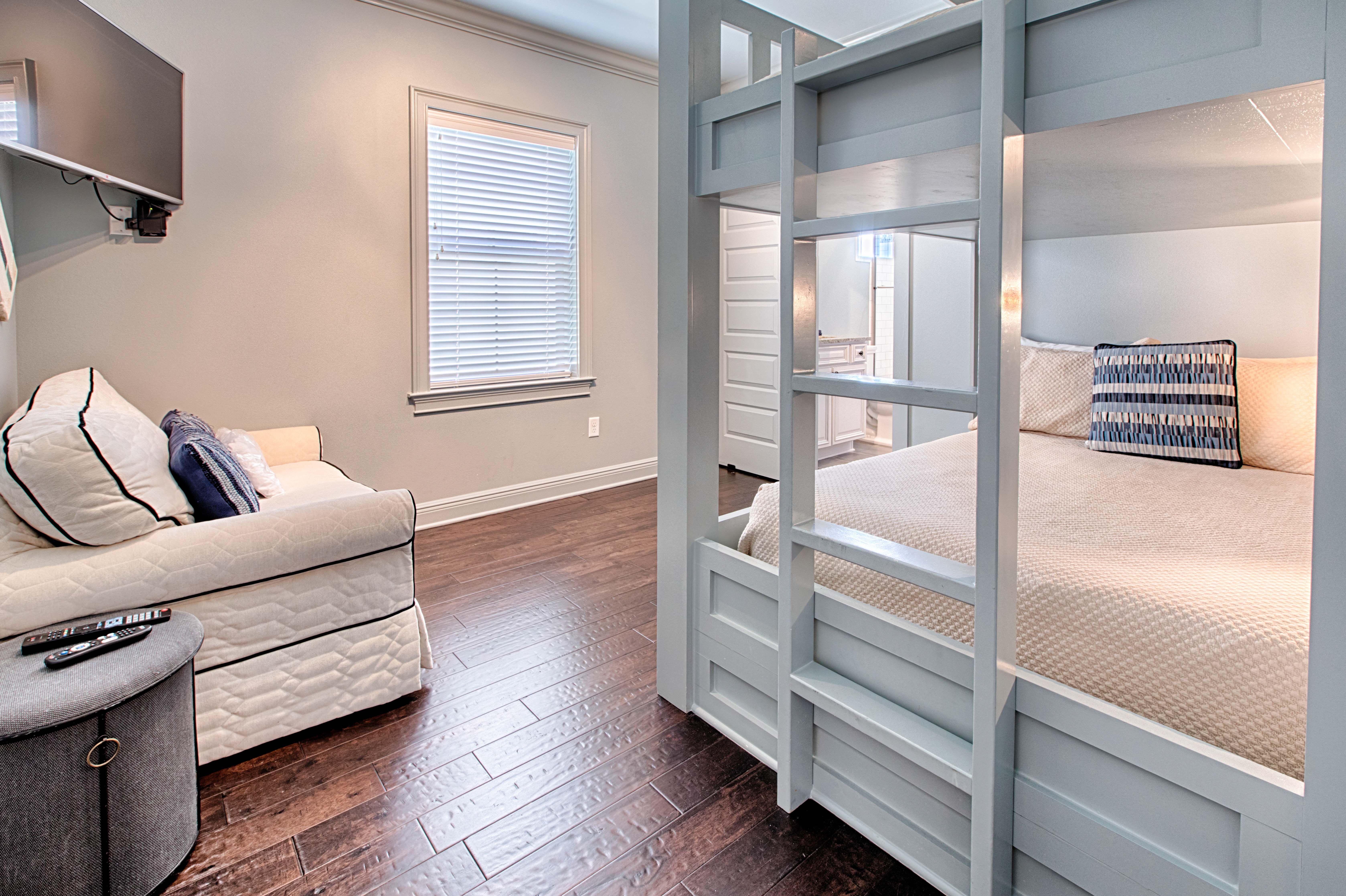 Beautiful tile-work and comfortable décor extend into the first floor bedroom and full bath across the hall. Upstairs the master bedroom welcomes you with a true master suite with French doors leading into the unbelievable bathroom. Enjoy a separate standing shower and large soaking tub where you’re sure to soak away any additional tensions. The master bedroom has a private balcony which overlooks the award winning Baytowne golf course offering a peaceful setting to begin your day. The second floor has an additional guest bedroom with a king bed and a separate bunk room which has a set of built-in full size beds! Each bedroom has its own private en suite bathroom.