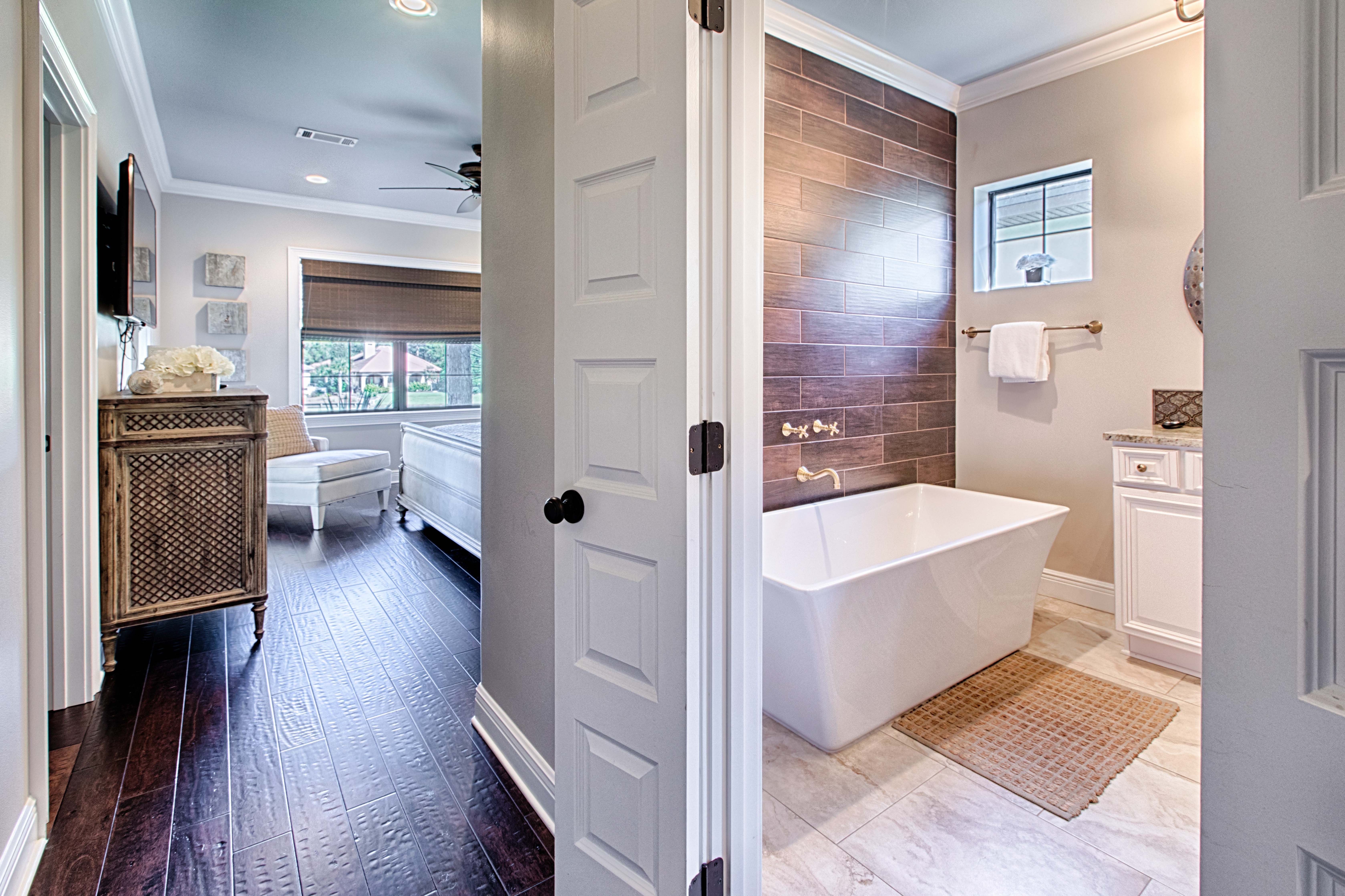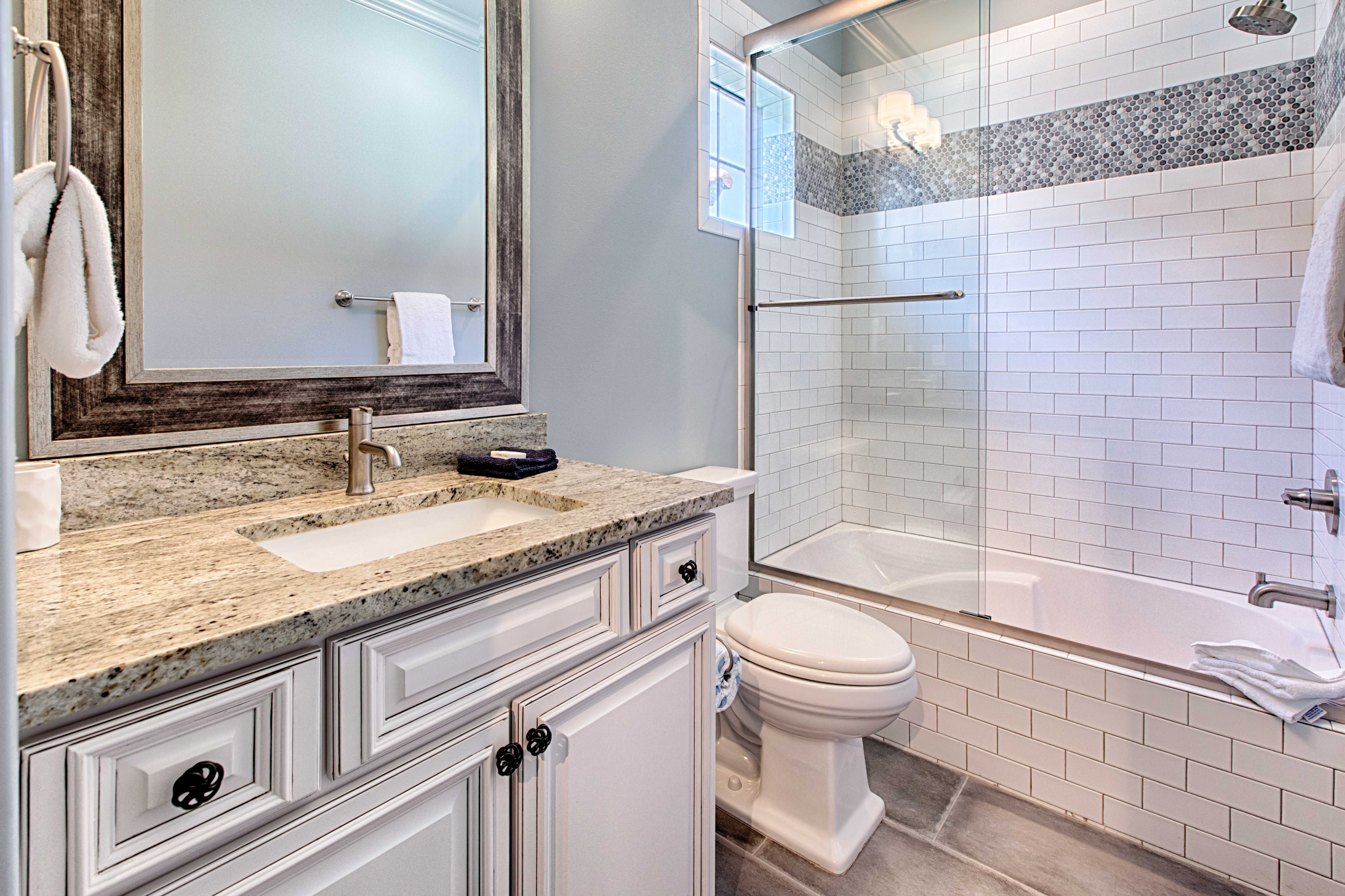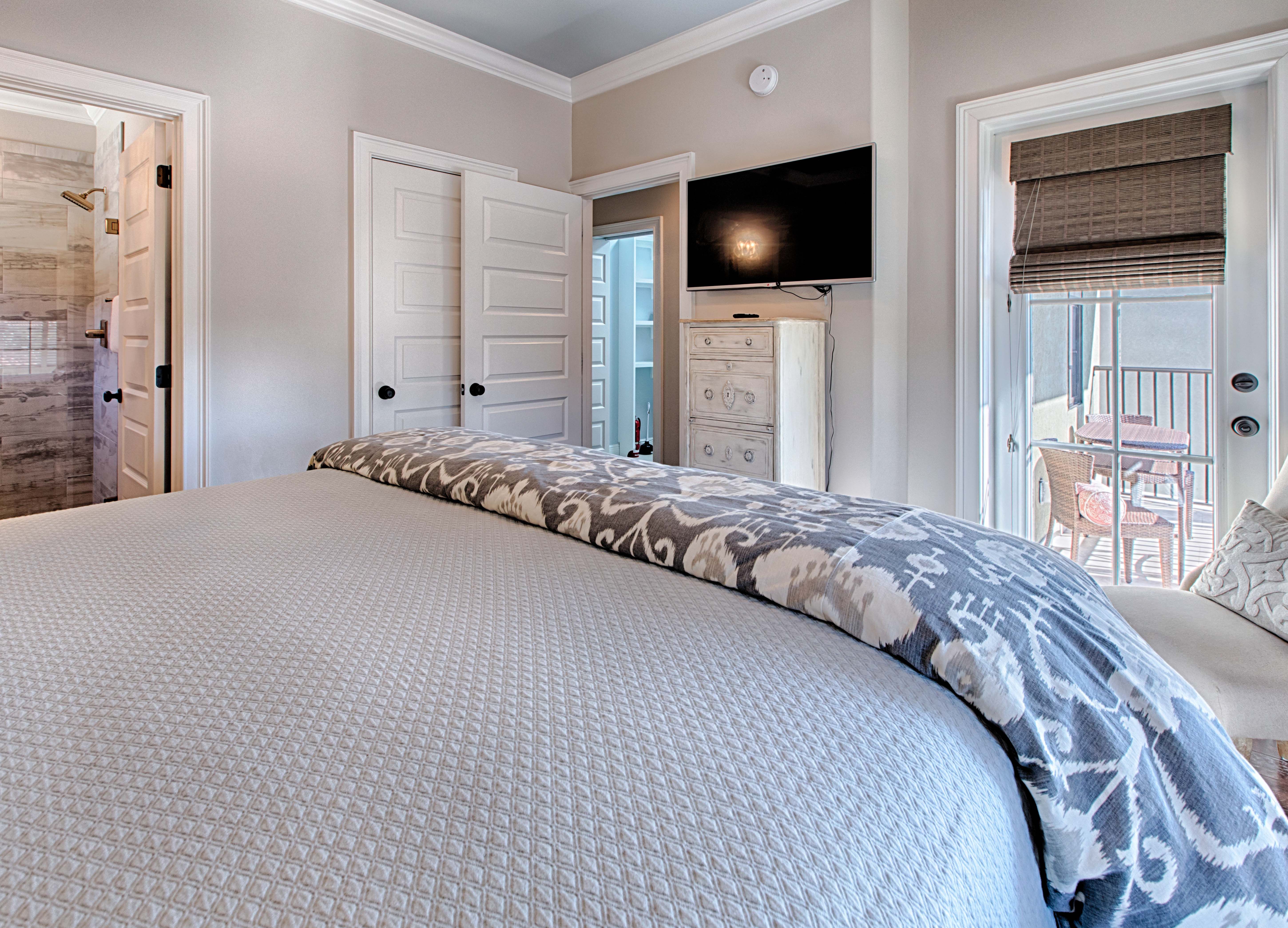 Beautiful tile-work and comfortable décor extend into the first floor bedroom and full bath across the hall. Upstairs the master bedroom welcomes you with a true master suite with French doors leading into the unbelievable bathroom. Enjoy a separate standing shower and large soaking tub where you’re sure to soak away any additional tensions. The master bedroom has a private balcony which overlooks the award winning Baytowne golf course offering a peaceful setting to begin your day. The second floor has an additional guest bedroom with a king bed and a separate bunk room which has a set of built-in full size beds! Each bedroom has its own private en suite bathroom.