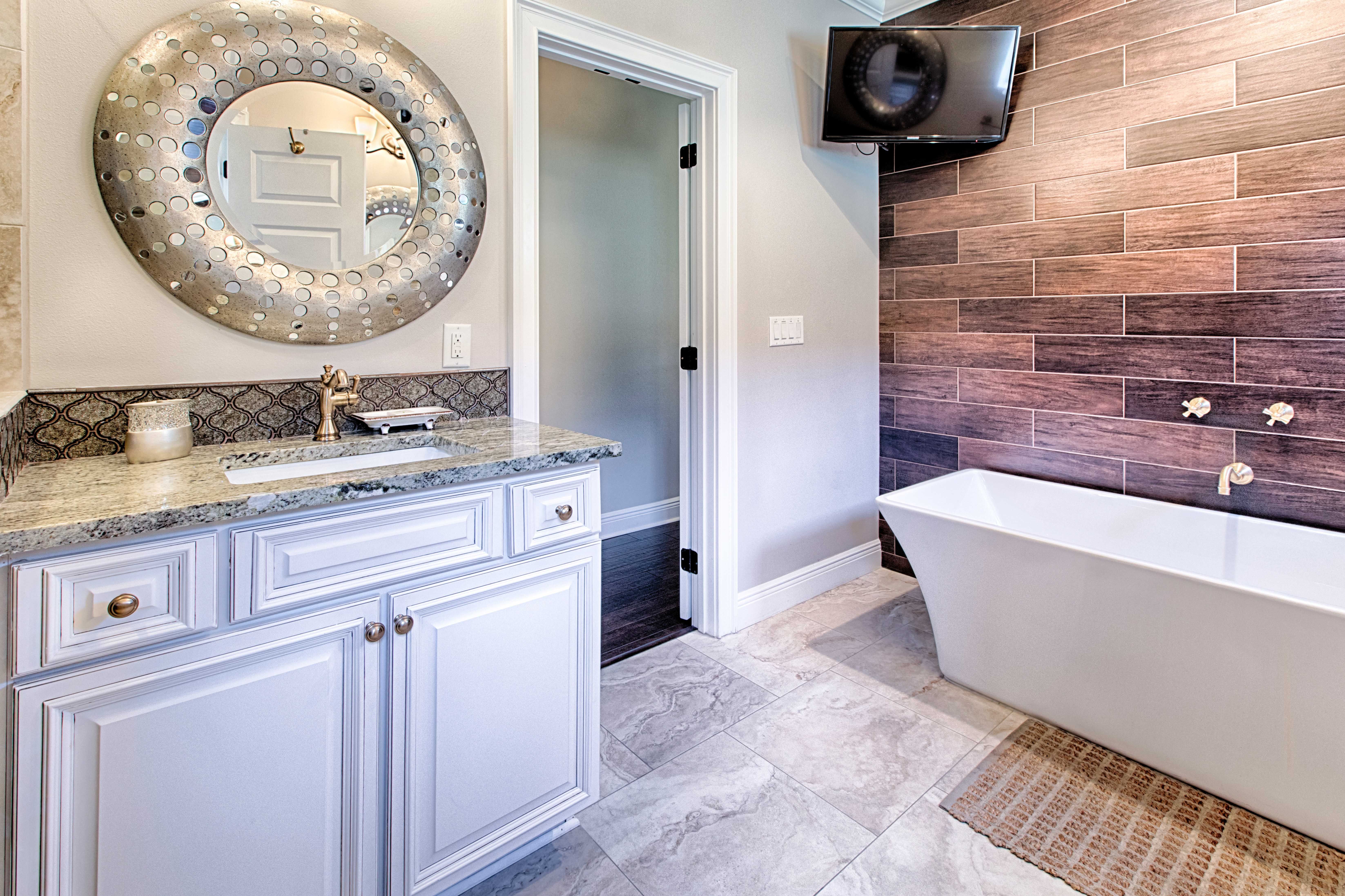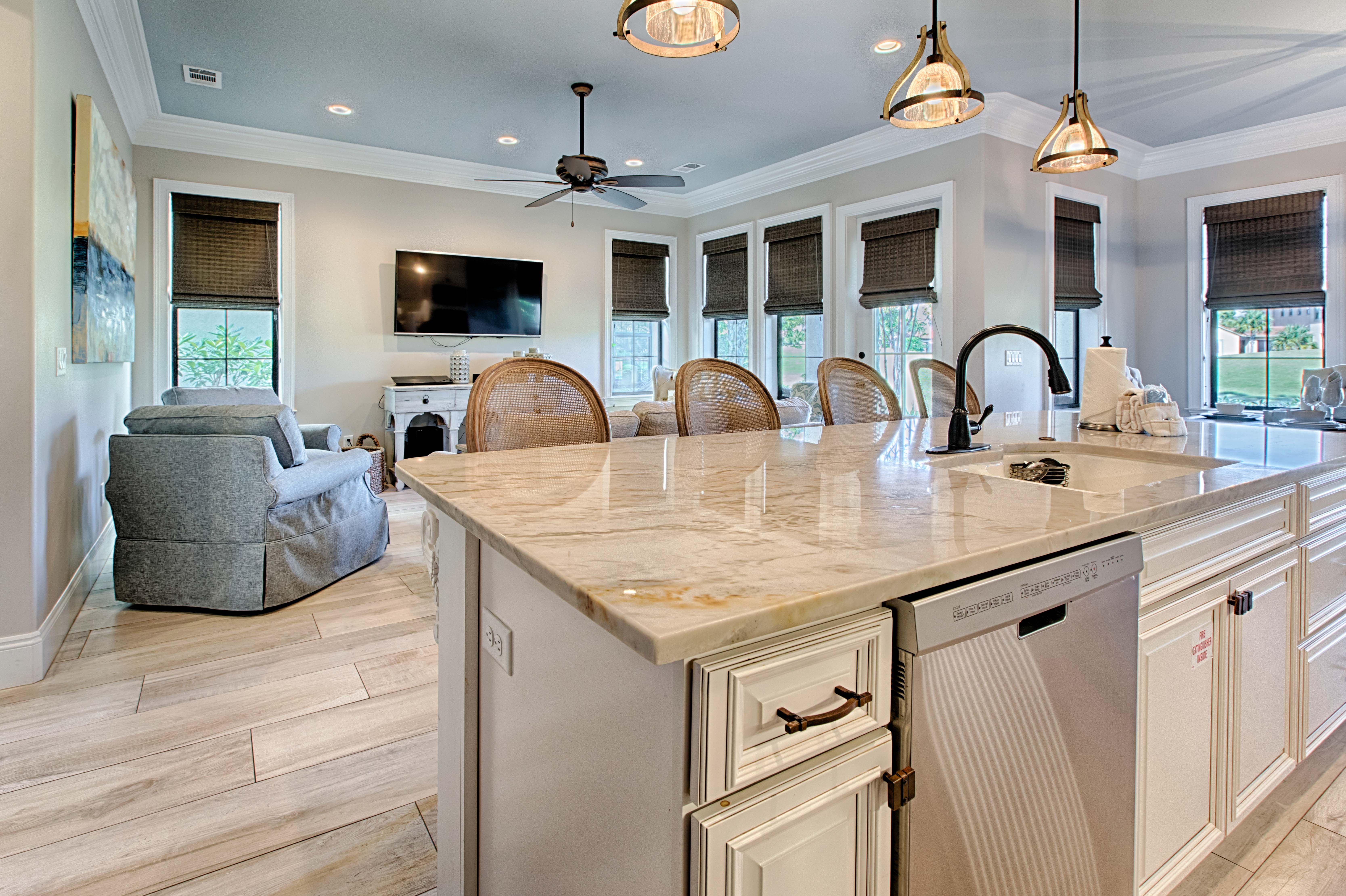 The kitchen offers a wow-factor all of its own with marble countertops and an oversized island perfect for serving up a meal to your large group (this property sleeps 12!). If you’re looking to entertain, the open floor plan extends from the kitchen into the dining space and over to the living area. The rustic dining table offers bench seating, perfect for the smaller guests in your group. Within this space your entire group will be able to sit and dine family-style.