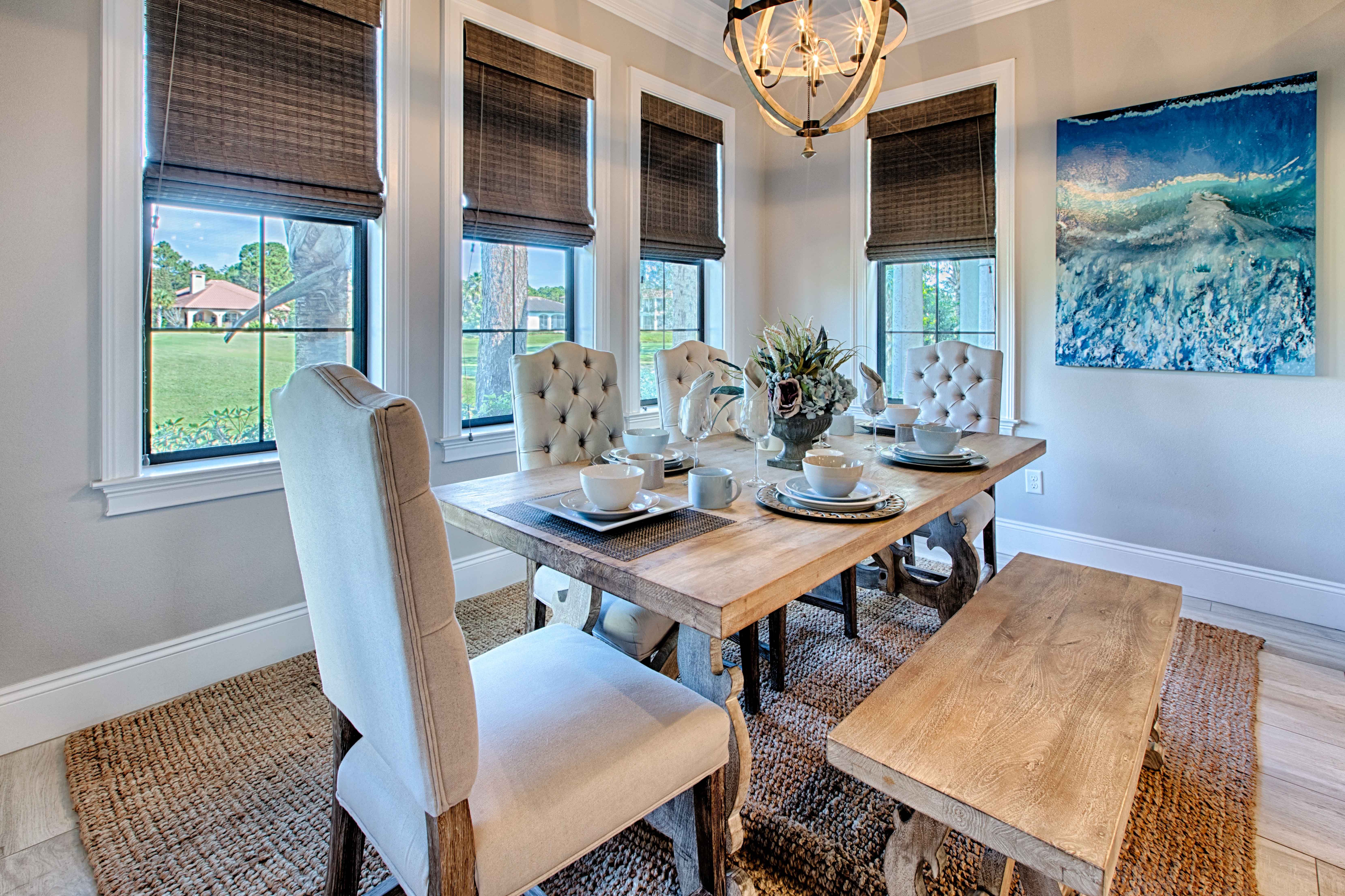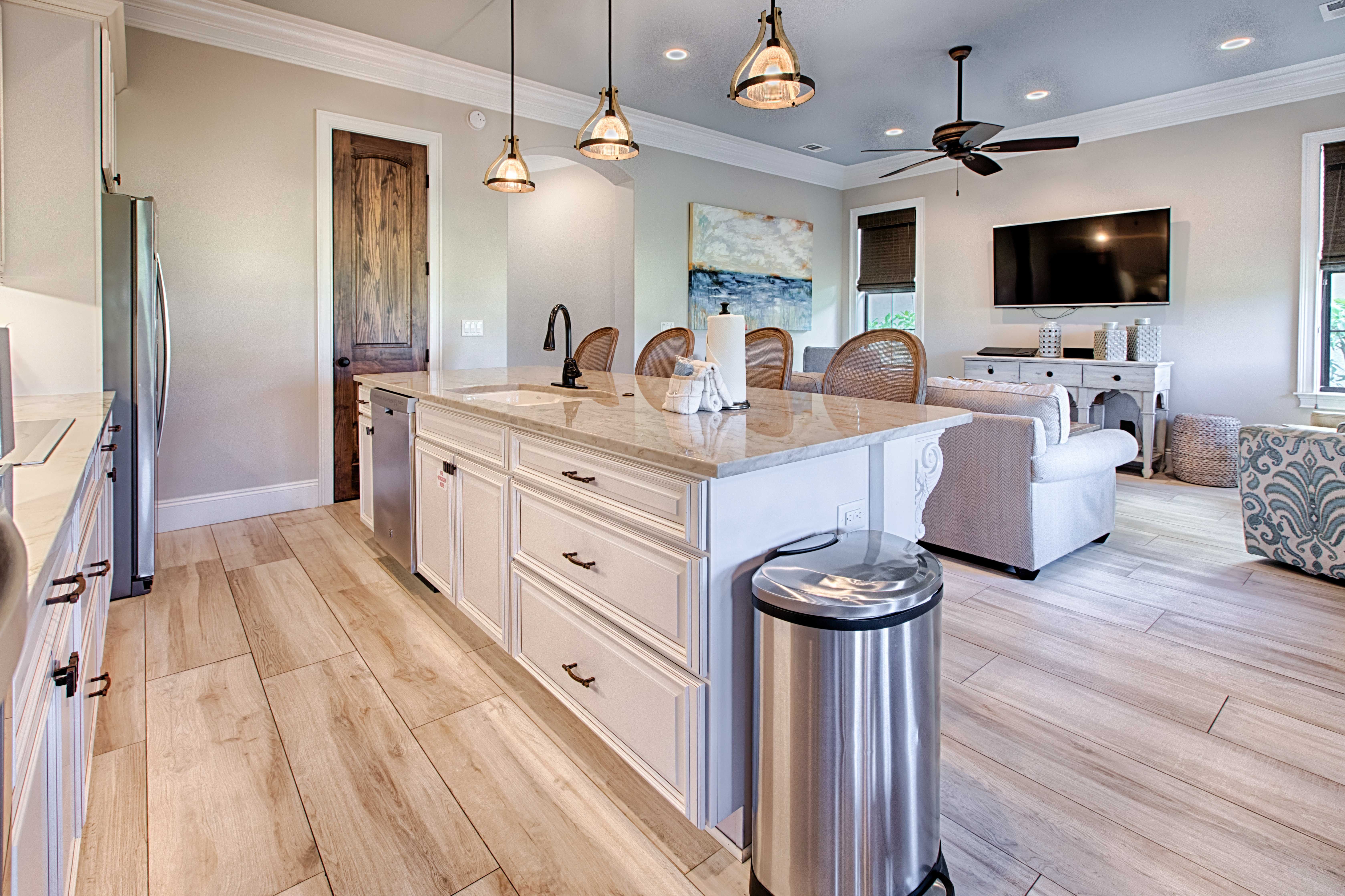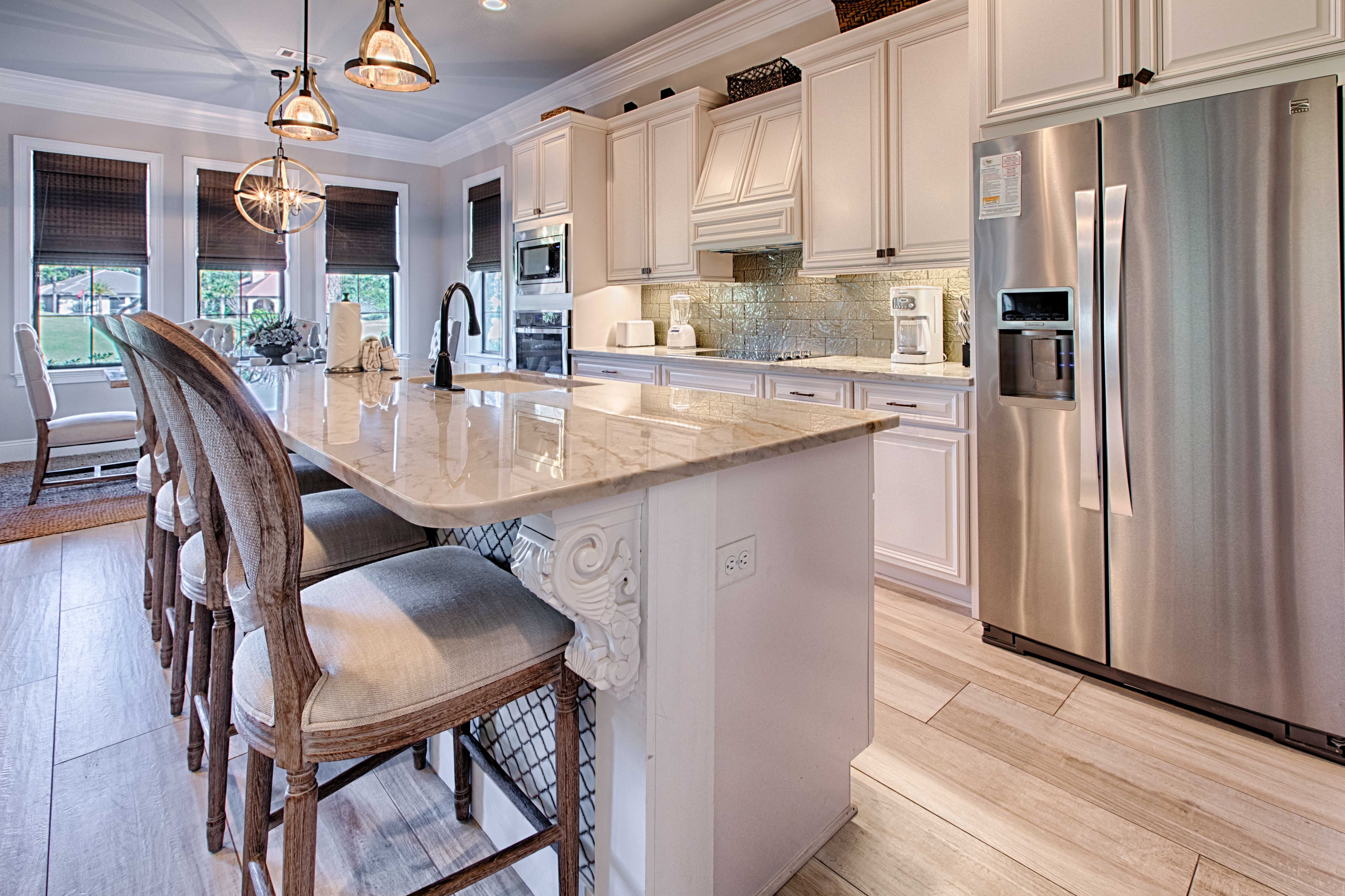 Two 6-seater GOLF CARTS included with this pet friendly vacation rental! Here it is…your vacation spot sure to unveil an experience of epic proportions! Whether with you're a golf group, tennis group or just getting away for some time on the beach, this 4-bedroom, 4-bathroom new construction home has considered every detail achieving the utmost in comfort, convenience and style. From the moment you enter the front door, this property makes it clear your vacation experience will not parallel to any other. Beautiful over-sized tiles greet you at the home’s entry and stretches throughout the entire home with a crisp clean feel.