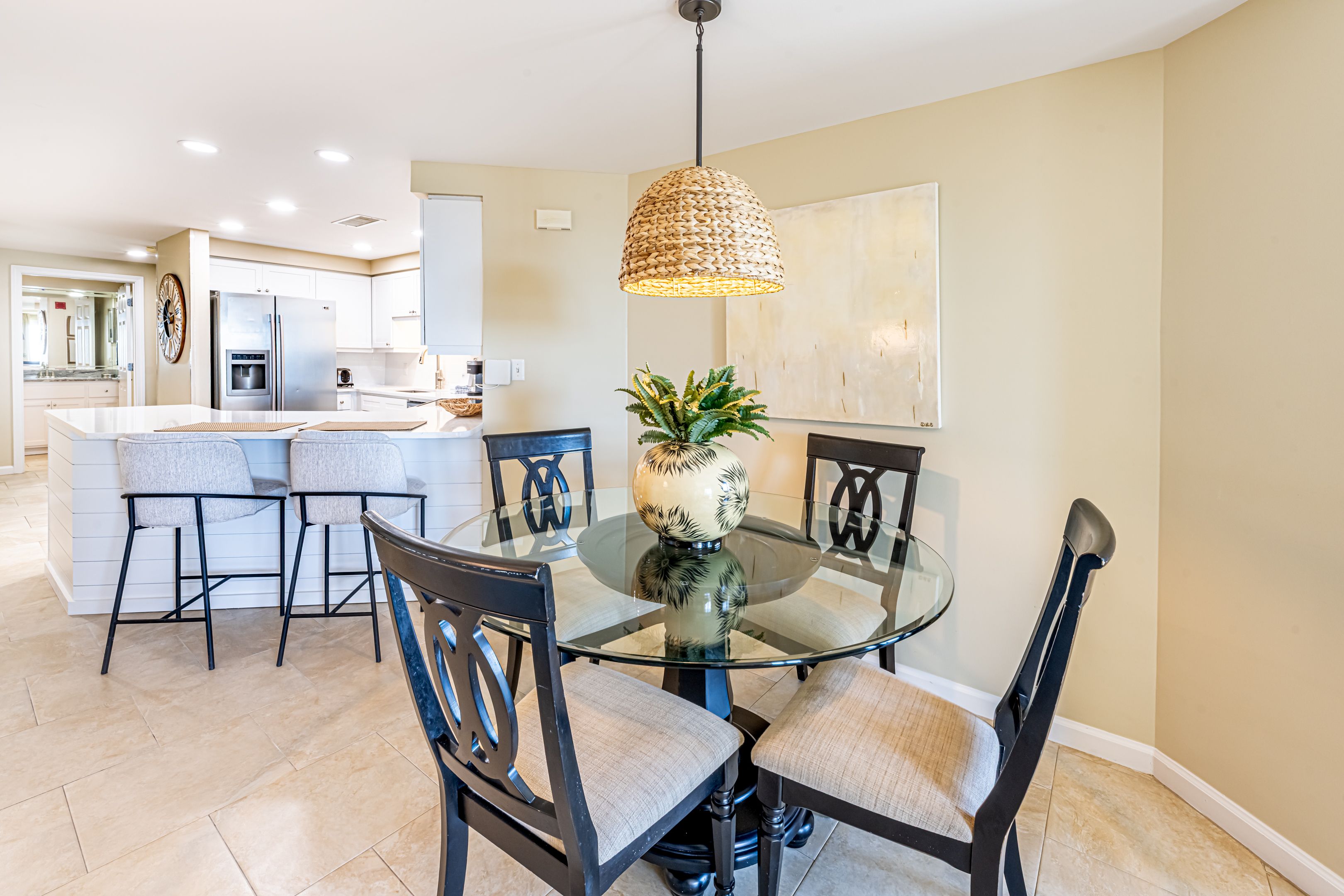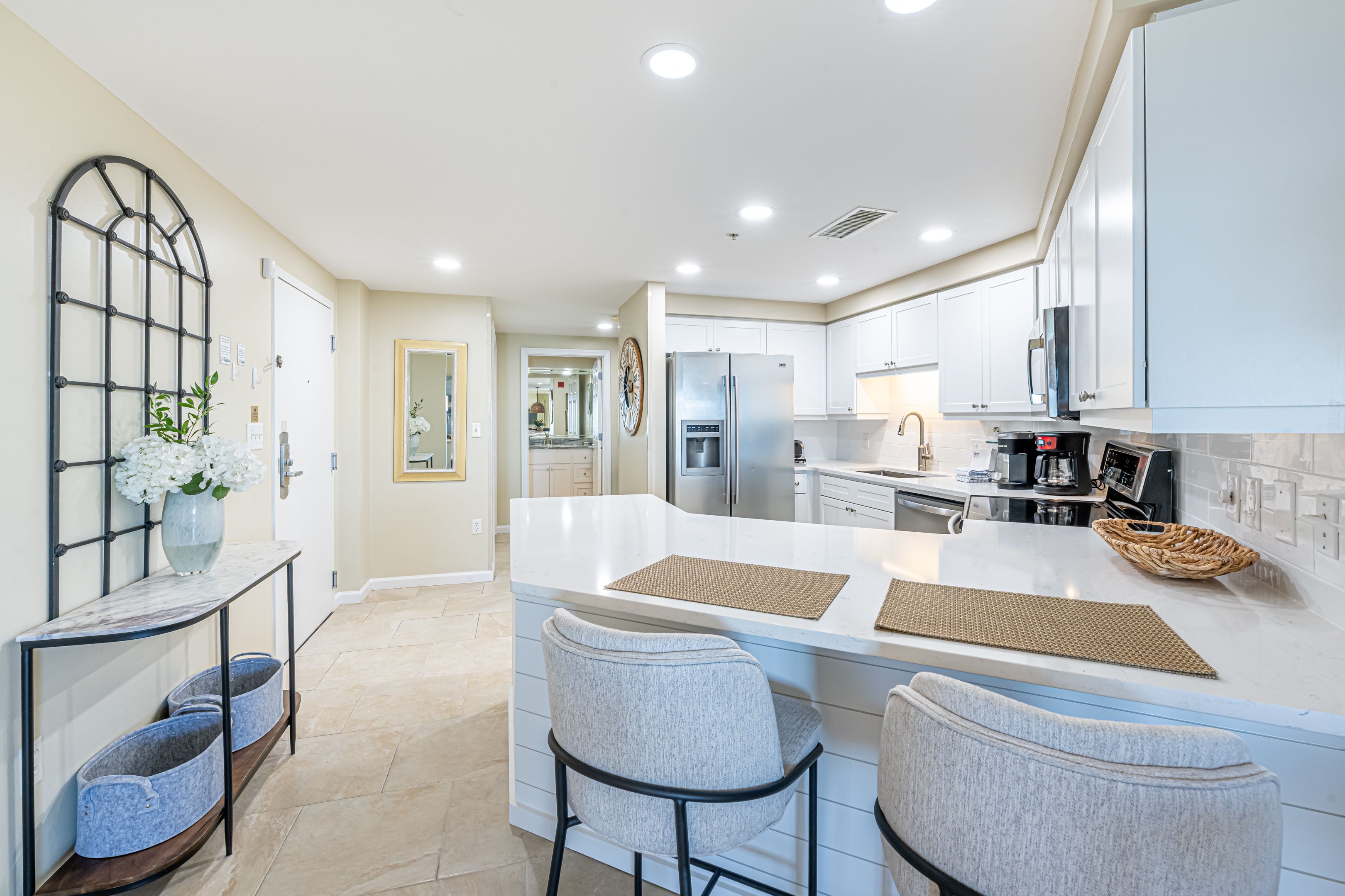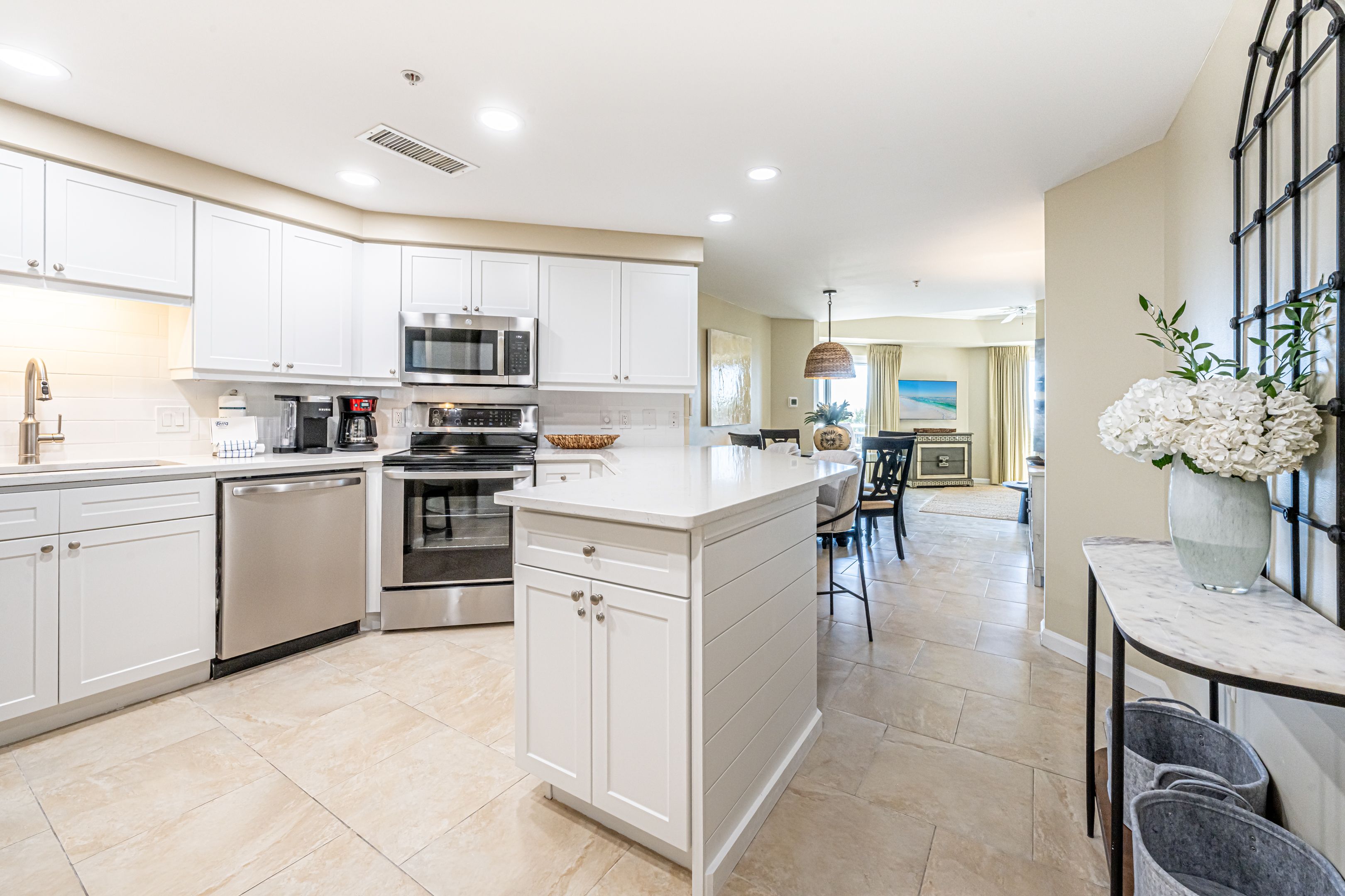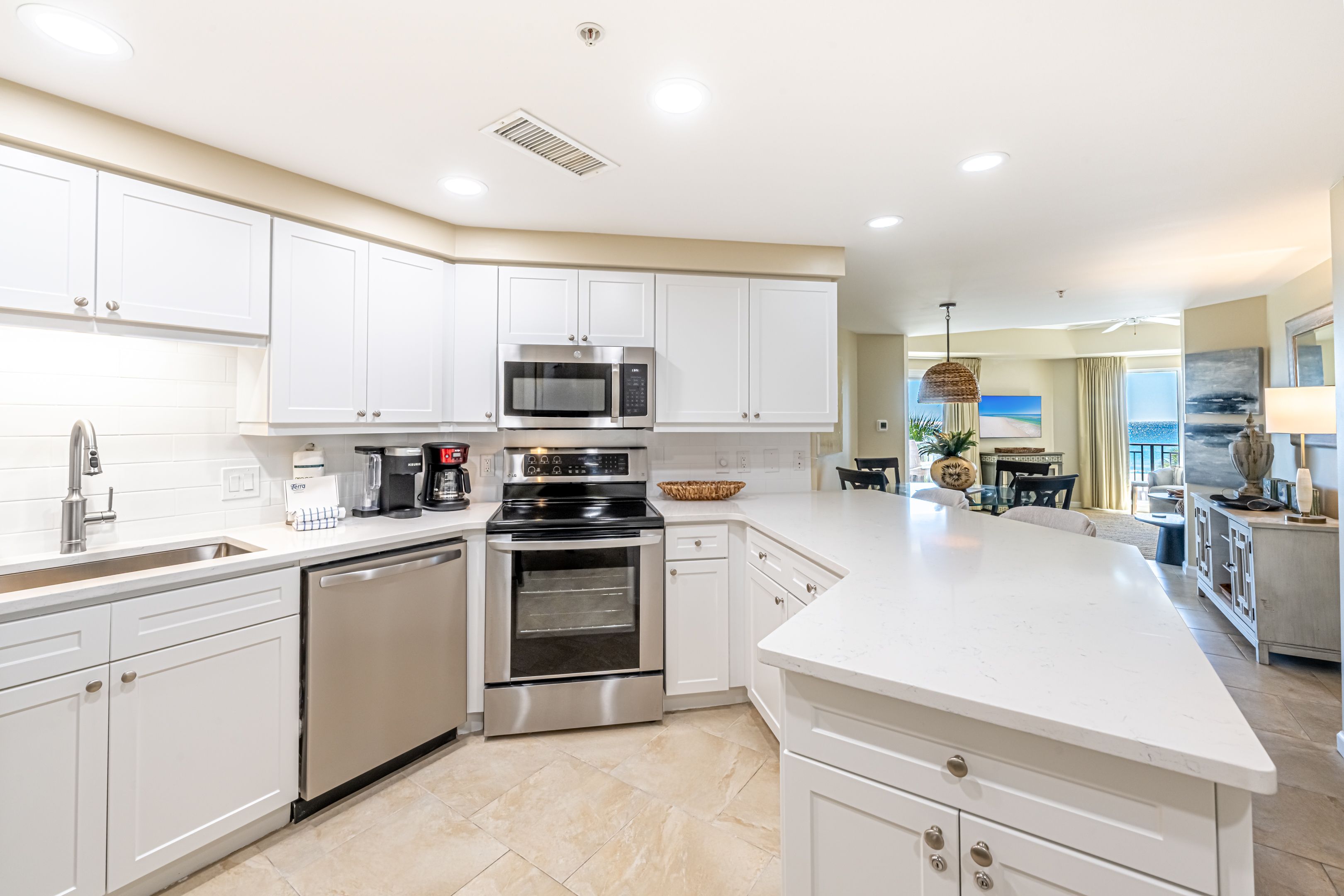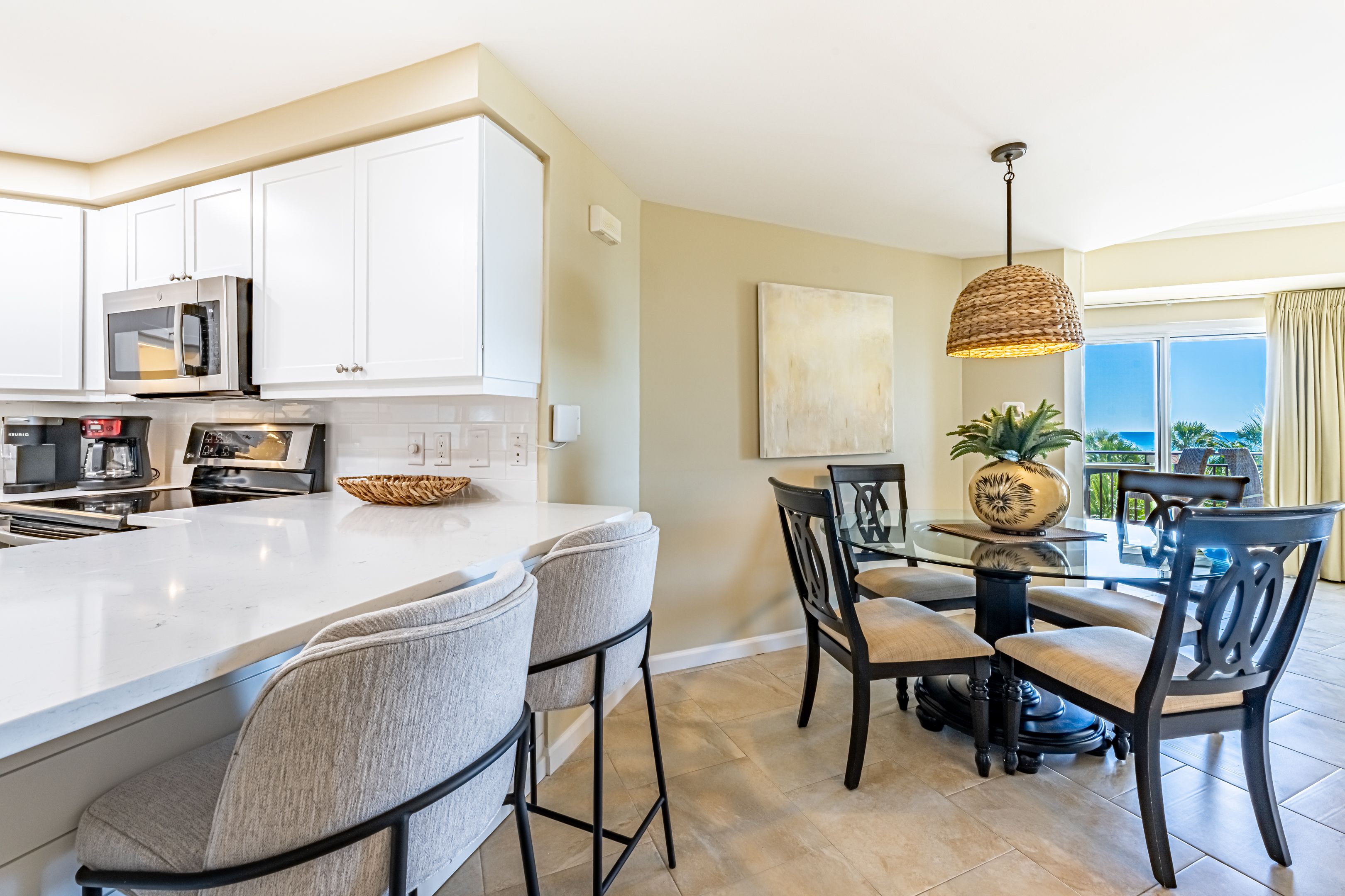 The spacious kitchen is updated with stainless steel appliances, granite countertops and offers plenty of counter space to whip up all of your favorite meals. Pack your cooler with your favorite snack and chilled beverage then make the short walk from the second floor to the pool or beach. Here your only concern will be, ‘Should we lounge pool-side or beach-side?’