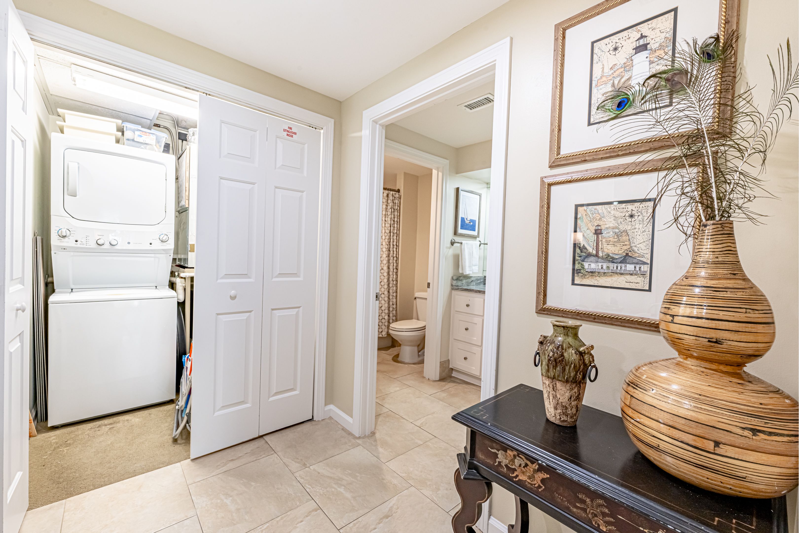 The master bedroom has a king size bed and en suite bathroom with walk-in shower. There are Gulf views from the master bedroom too! The guest bedroom has two twin beds and access to a hall bathroom with tub/shower combo. In-unit laundry brings in more comforts of home.