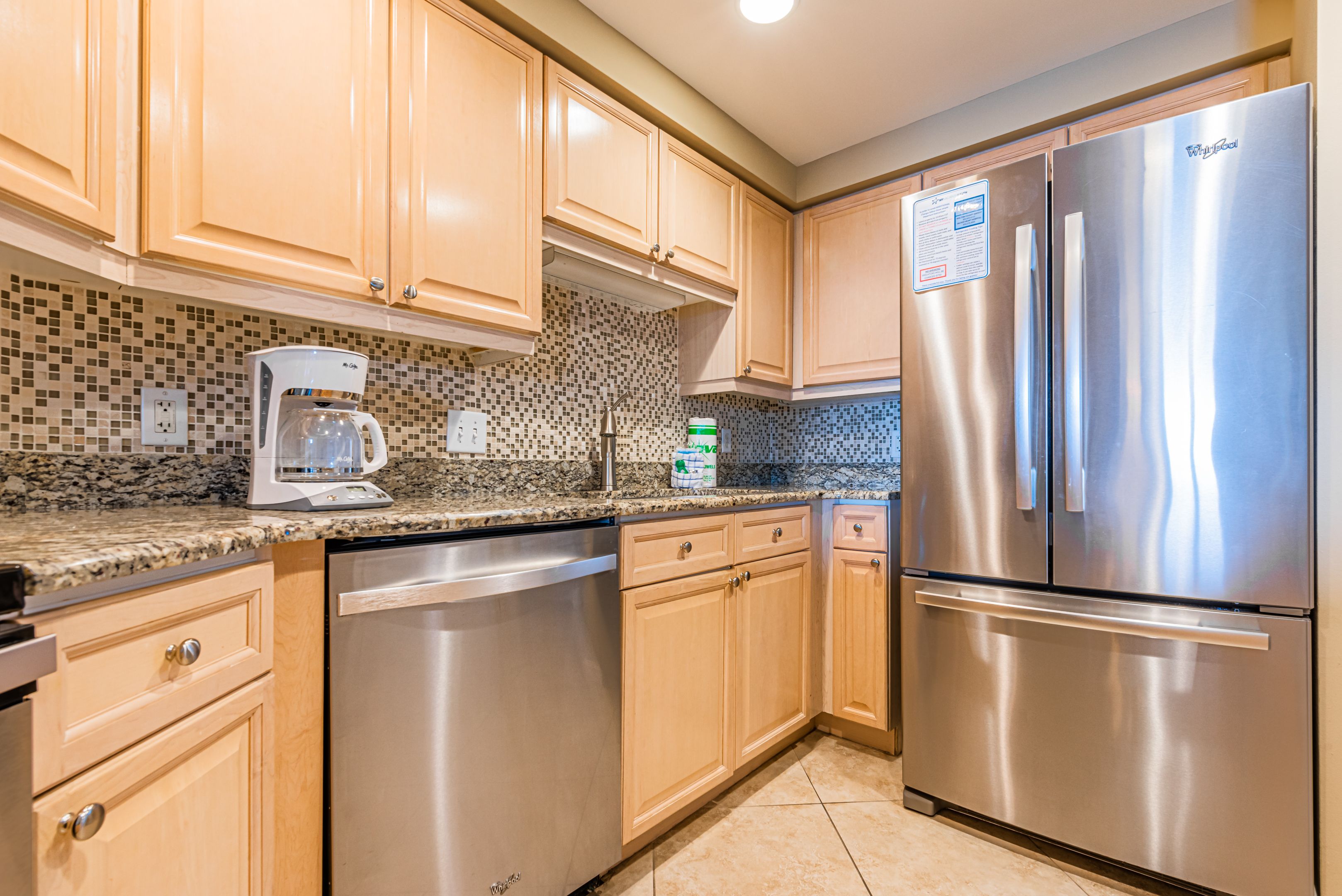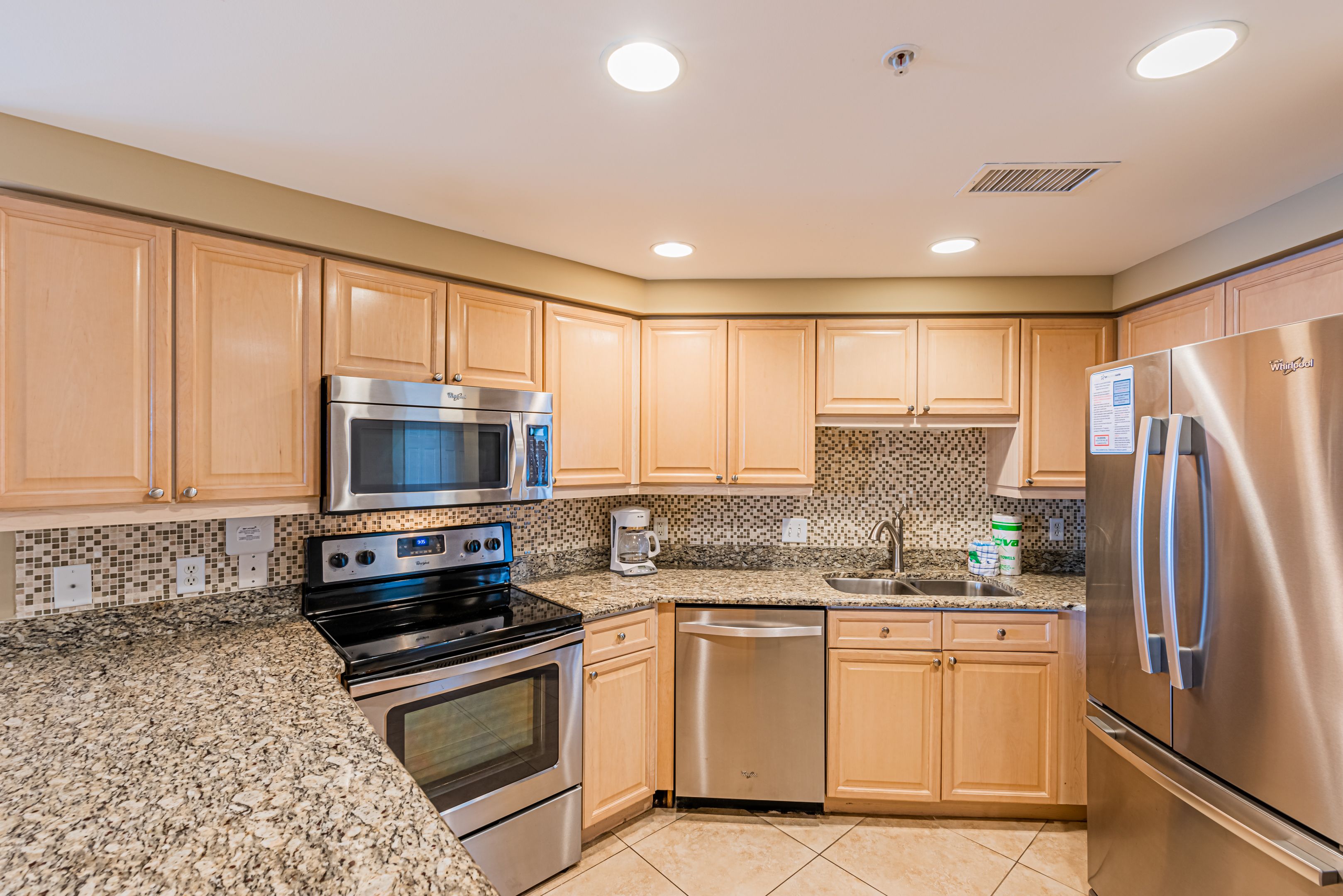 The cook’s kitchen offers new granite countertops with plenty of counter space for preparations and serving, plus stainless steel appliances to get everyone fed before catching the evening’s event at Baytowne Wharf.